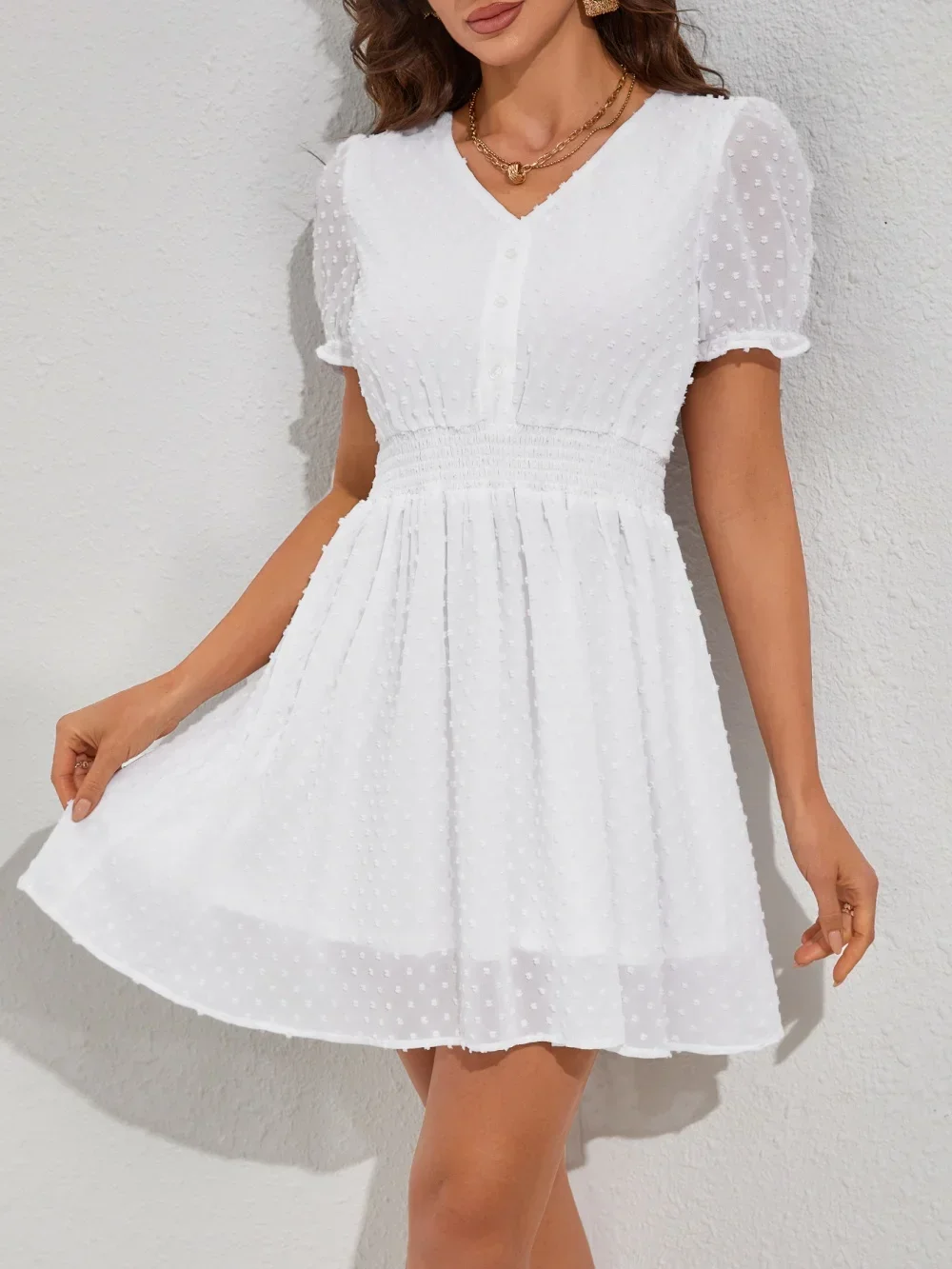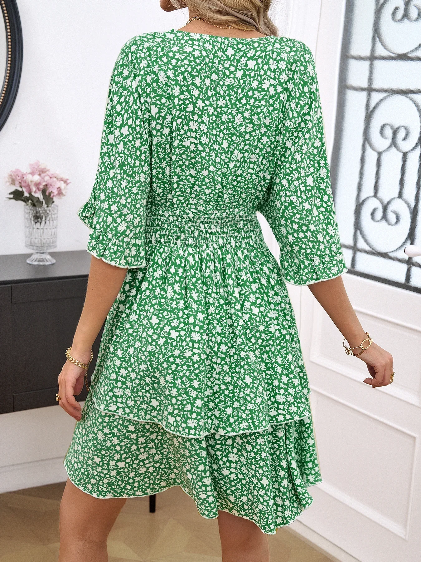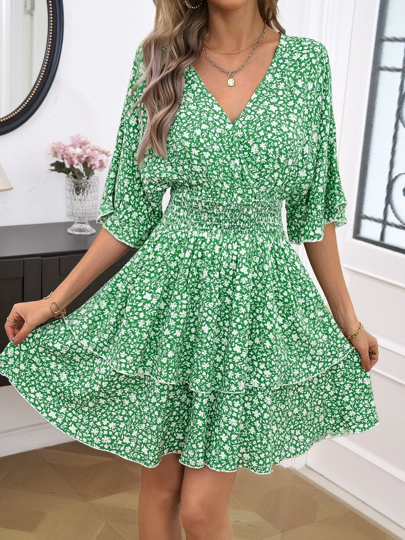 2024 Summer New Casual Women's High Waist Printed A-line Dress V-neck Fashion Elegant Short Sleeve Fragmented Flower Dress