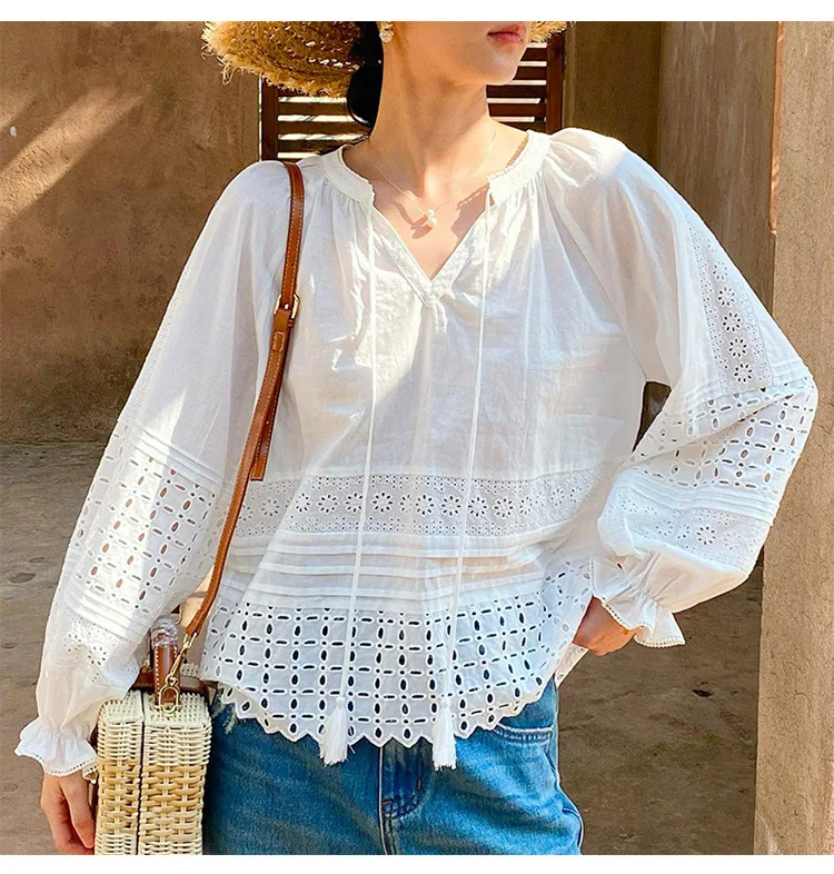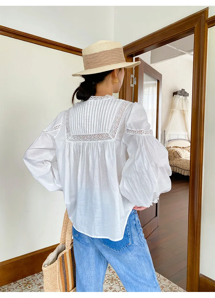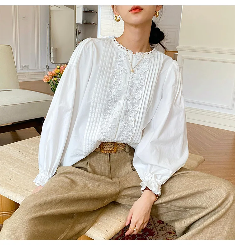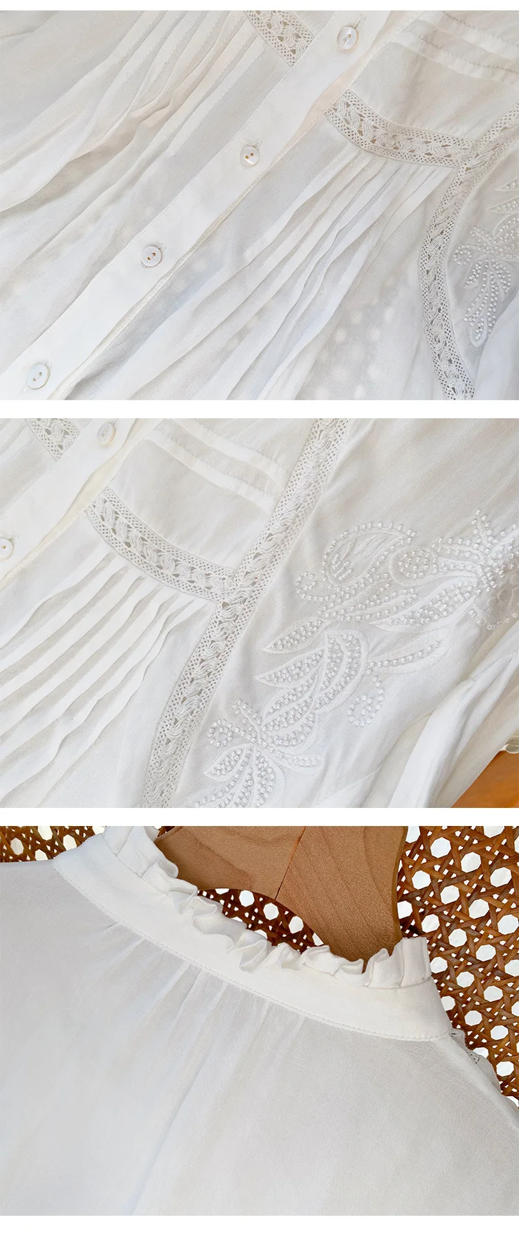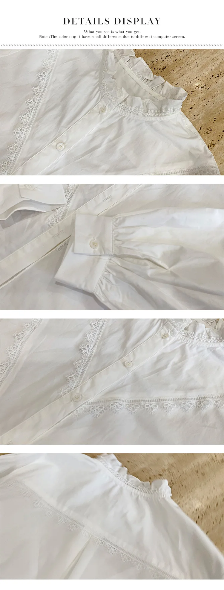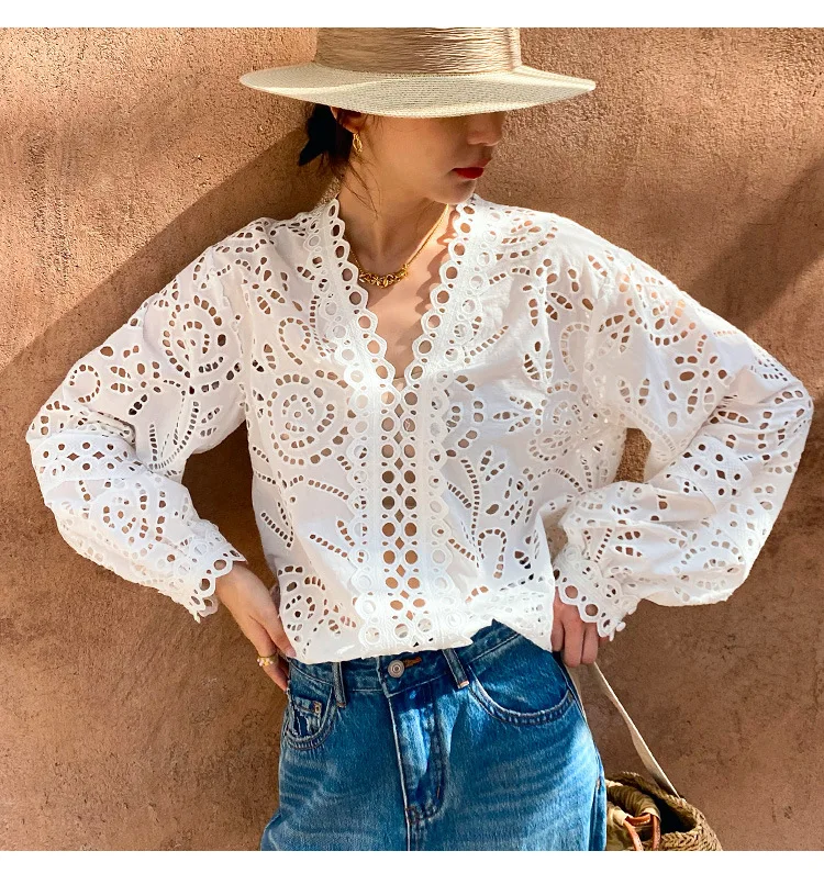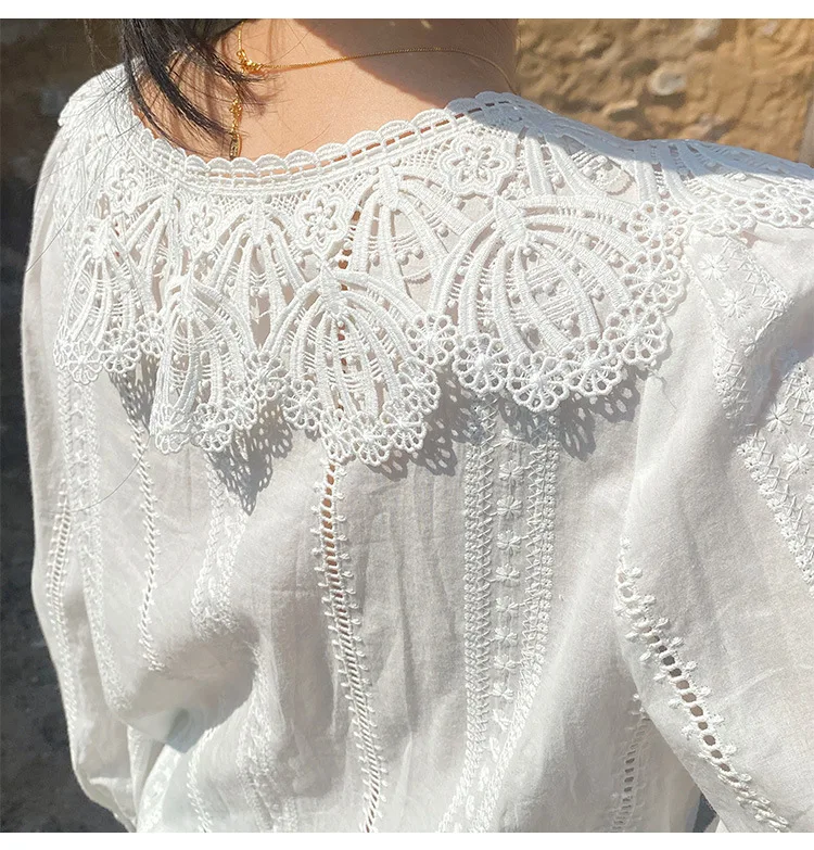 2025 Spring New Women's French White Shirt Splicing Lace Embroidery Design Ladies Shirt Long Sleeve Casual Holiday Beach Tops