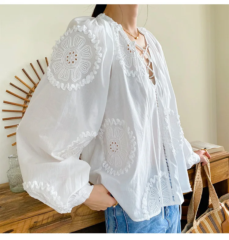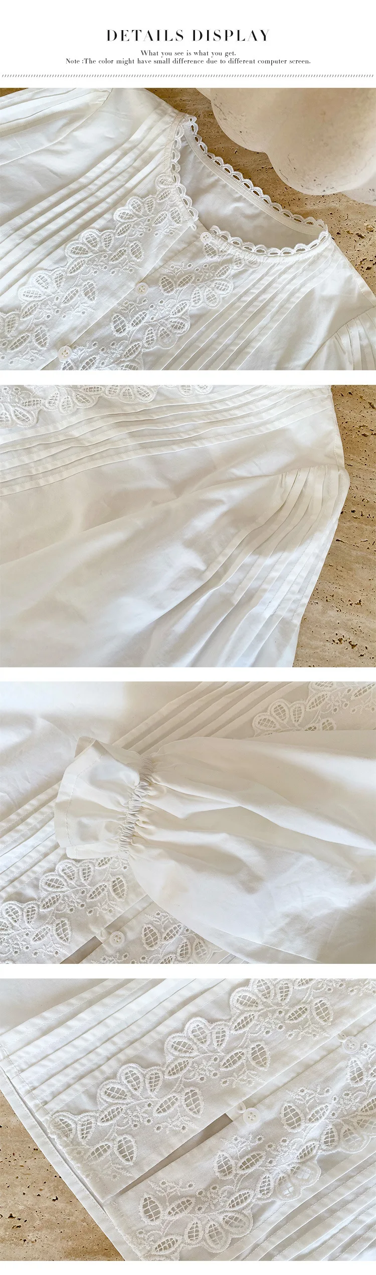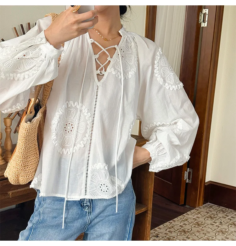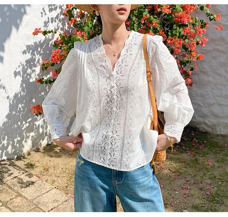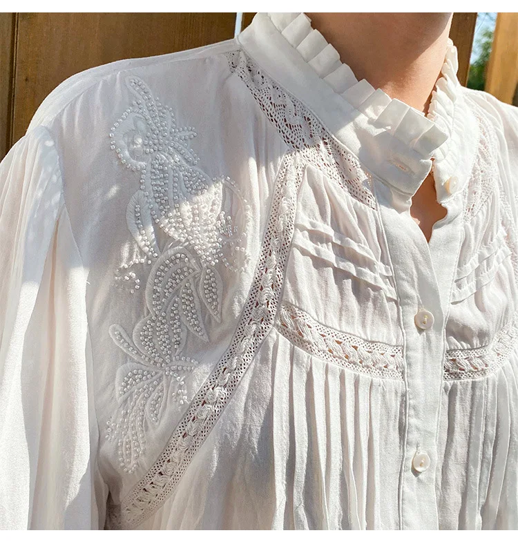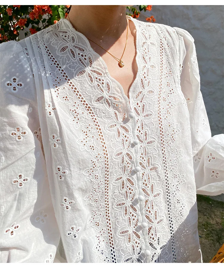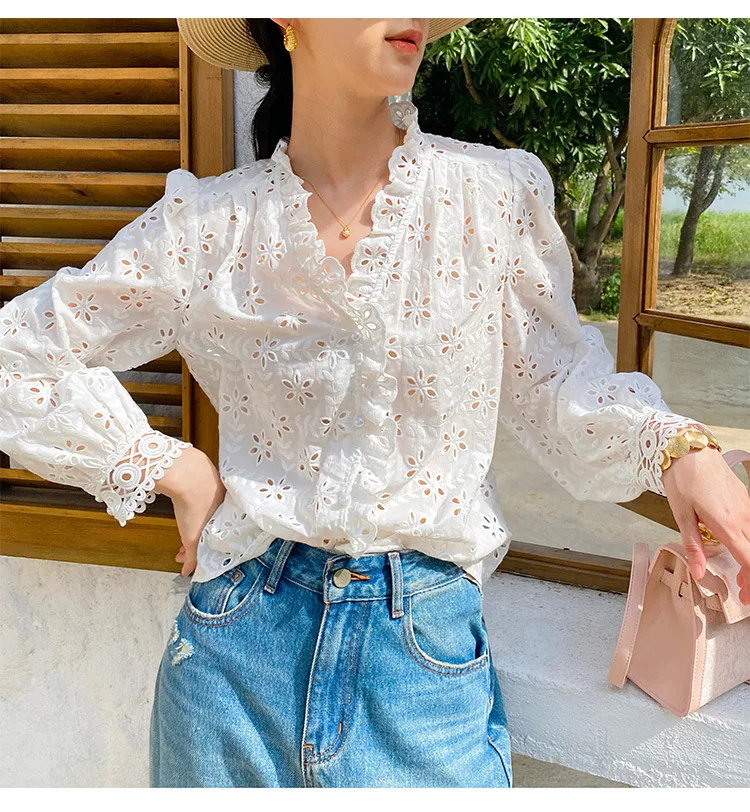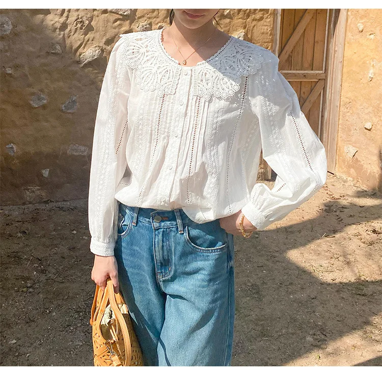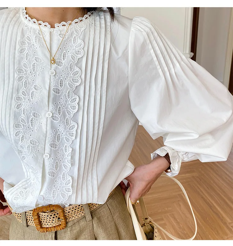 2025 Spring New Women's French White Shirt Splicing Lace Embroidery Design Ladies Shirt Long Sleeve Casual Holiday Beach Tops