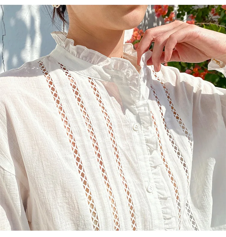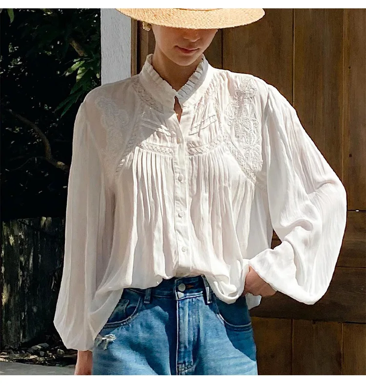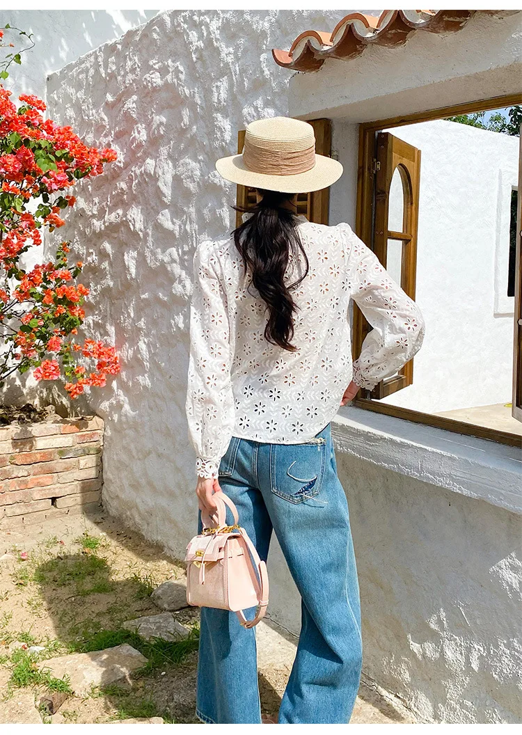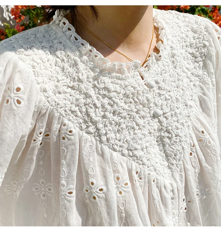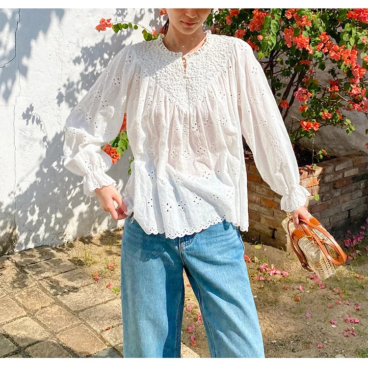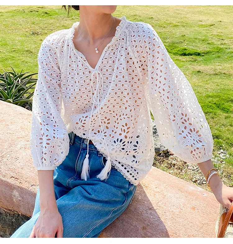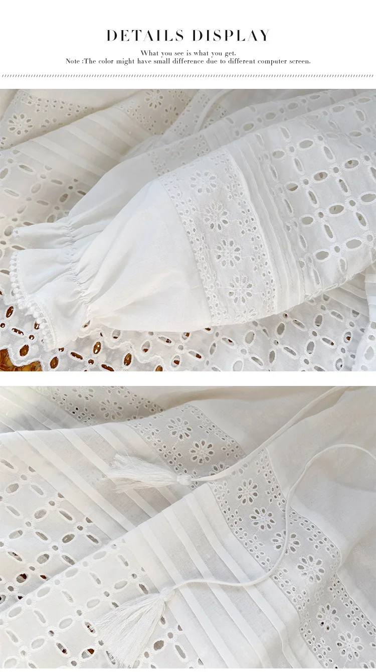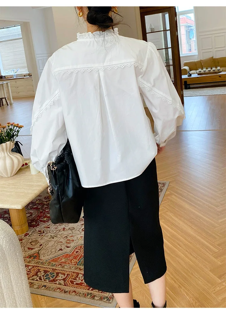 2025 Spring New Women's French White Shirt Splicing Lace Embroidery Design Ladies Shirt Long Sleeve Casual Holiday Beach Tops