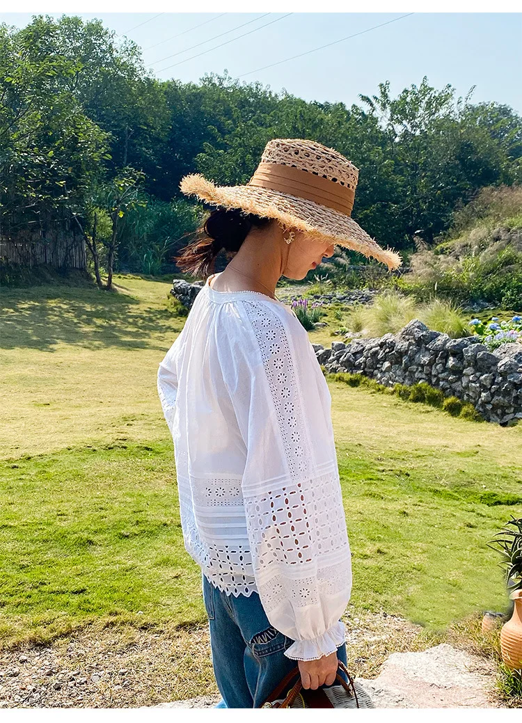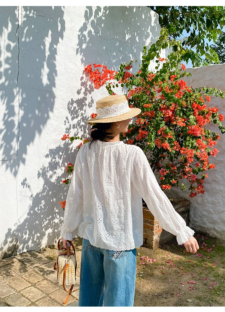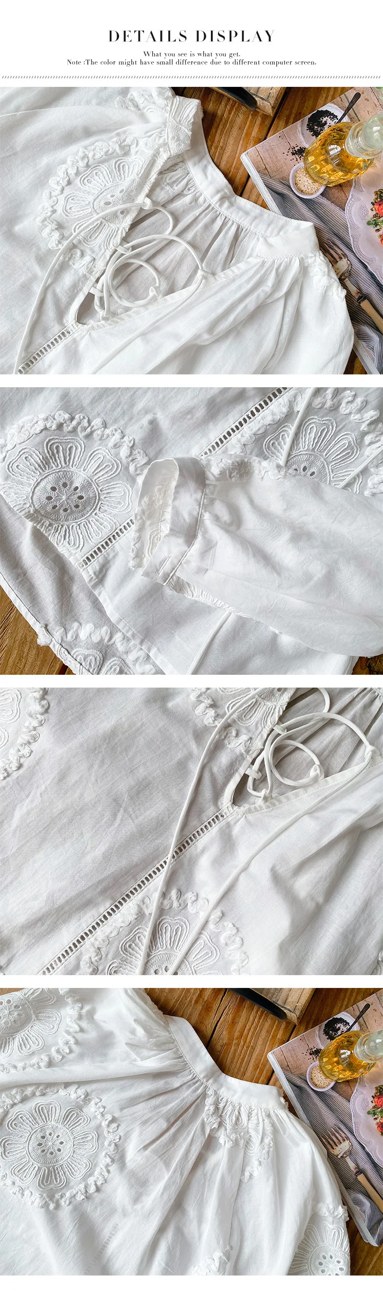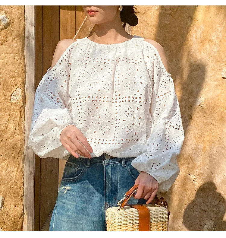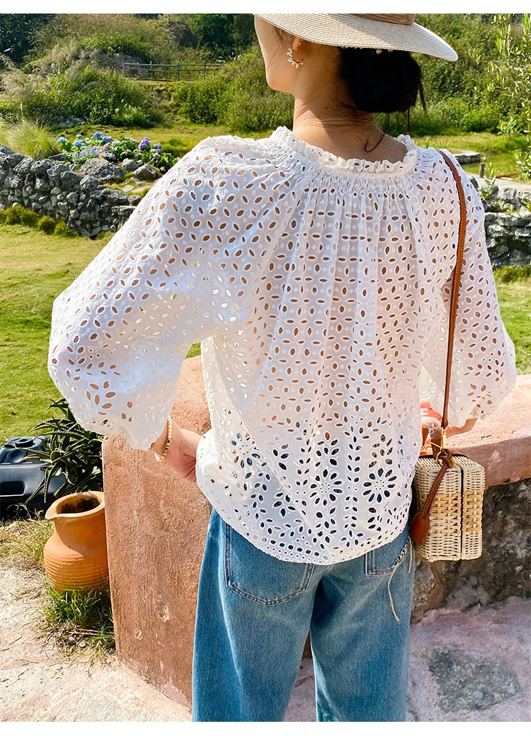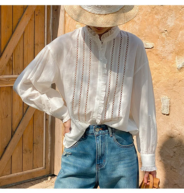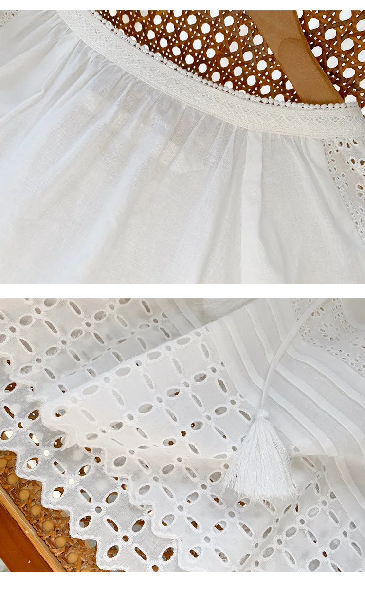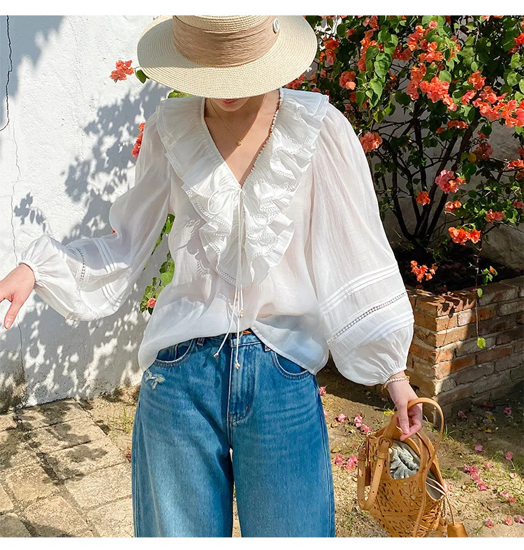 2025 Spring New Women's French White Shirt Splicing Lace Embroidery Design Ladies Shirt Long Sleeve Casual Holiday Beach Tops