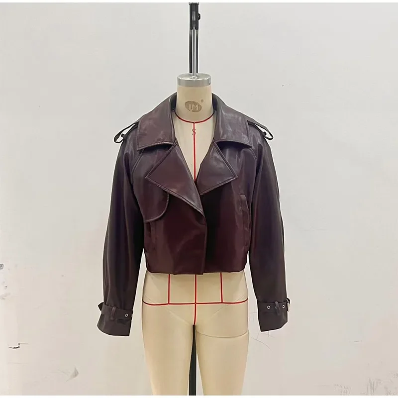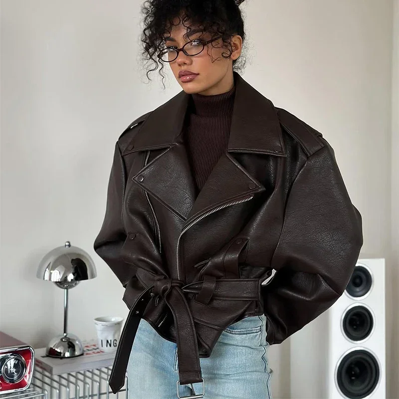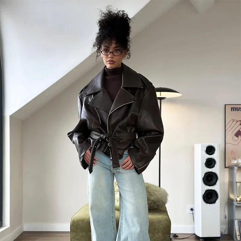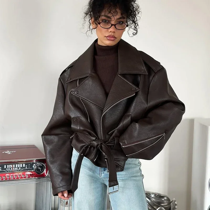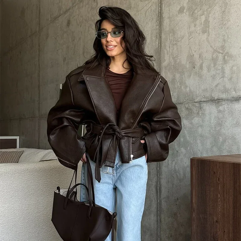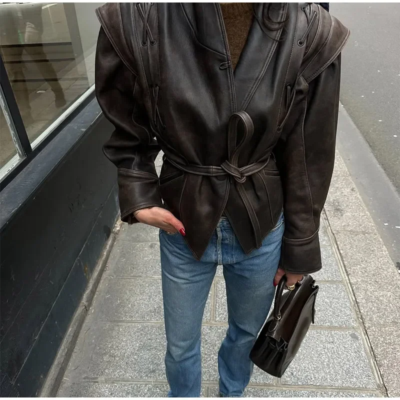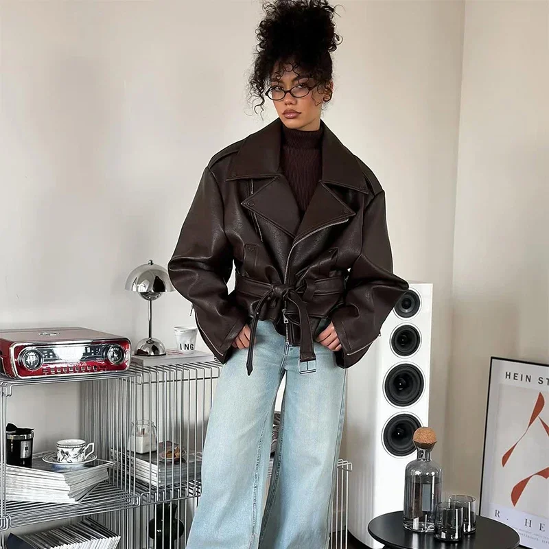 Brown Lapel Leather Bomber Jacket Women's Fashion Full Sleeve Zipper Pocket Lace Up Belt Coat 2025 Autumn High Street Outerwear