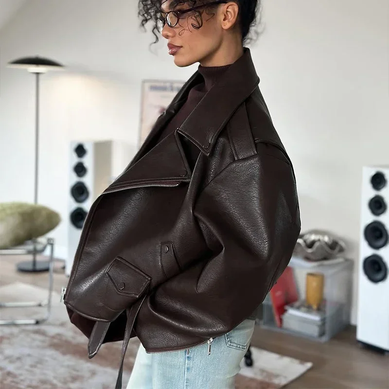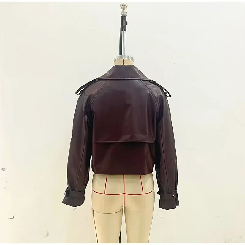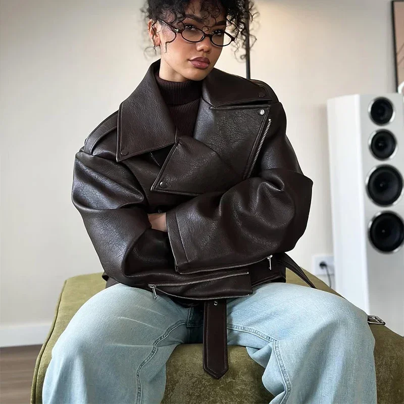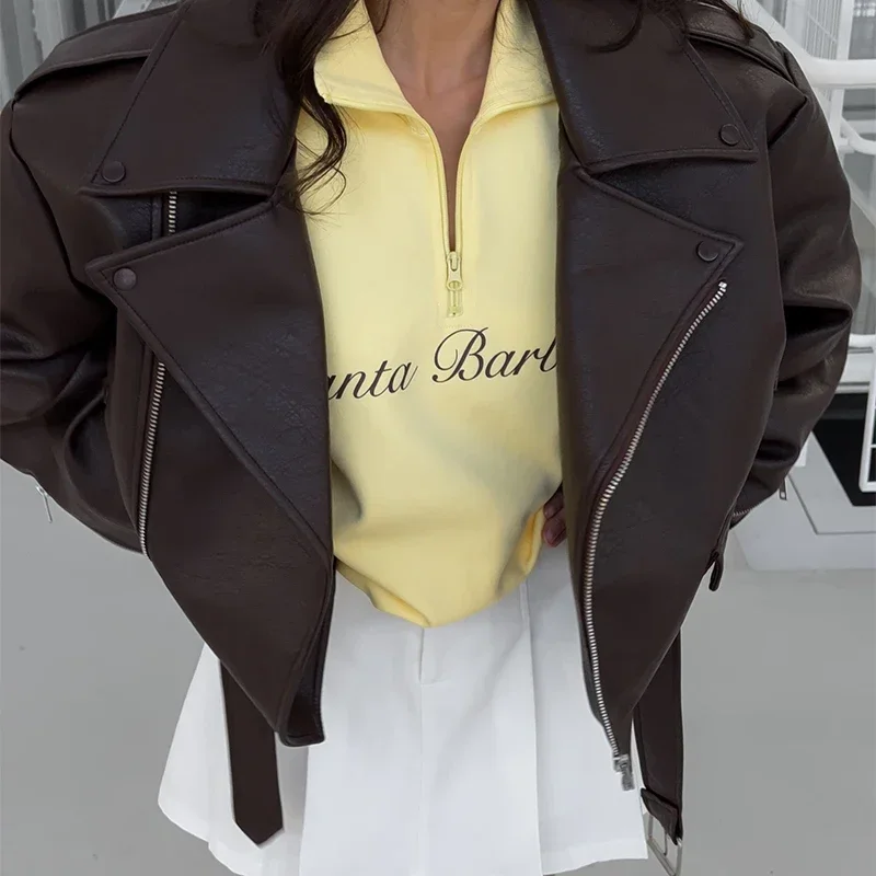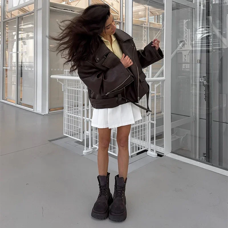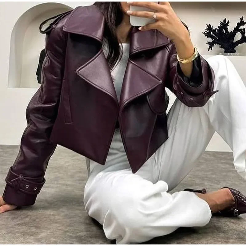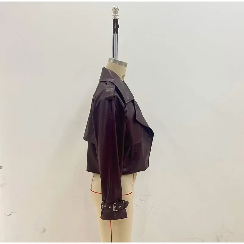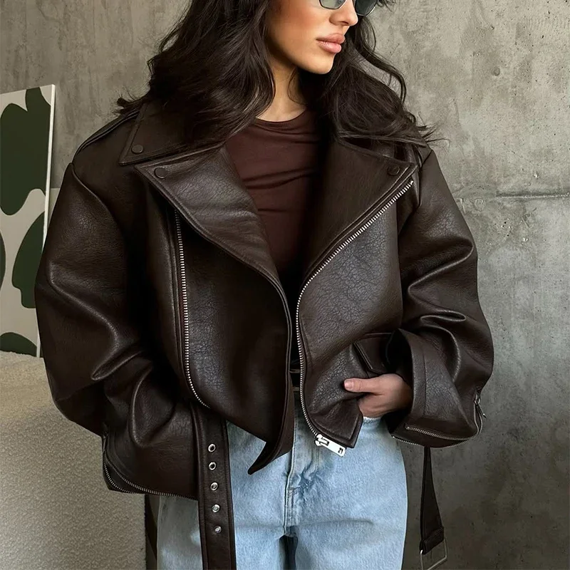 Brown Lapel Leather Bomber Jacket Women's Fashion Full Sleeve Zipper Pocket Lace Up Belt Coat 2025 Autumn High Street Outerwear