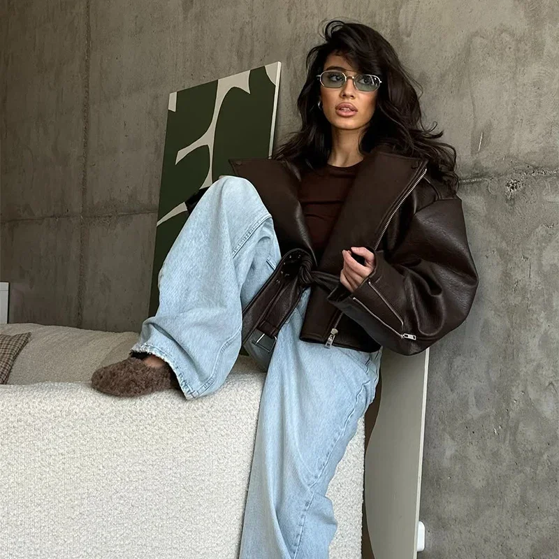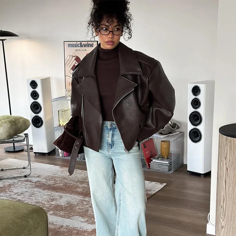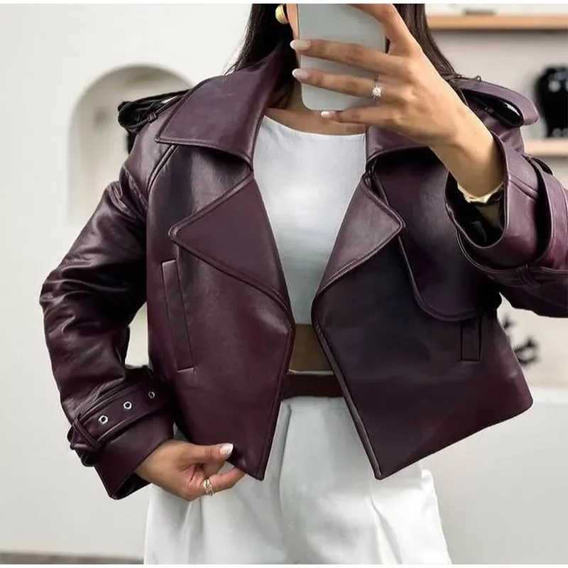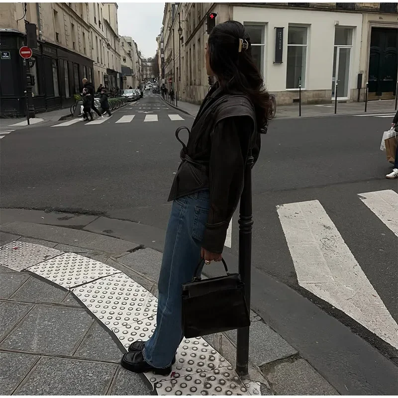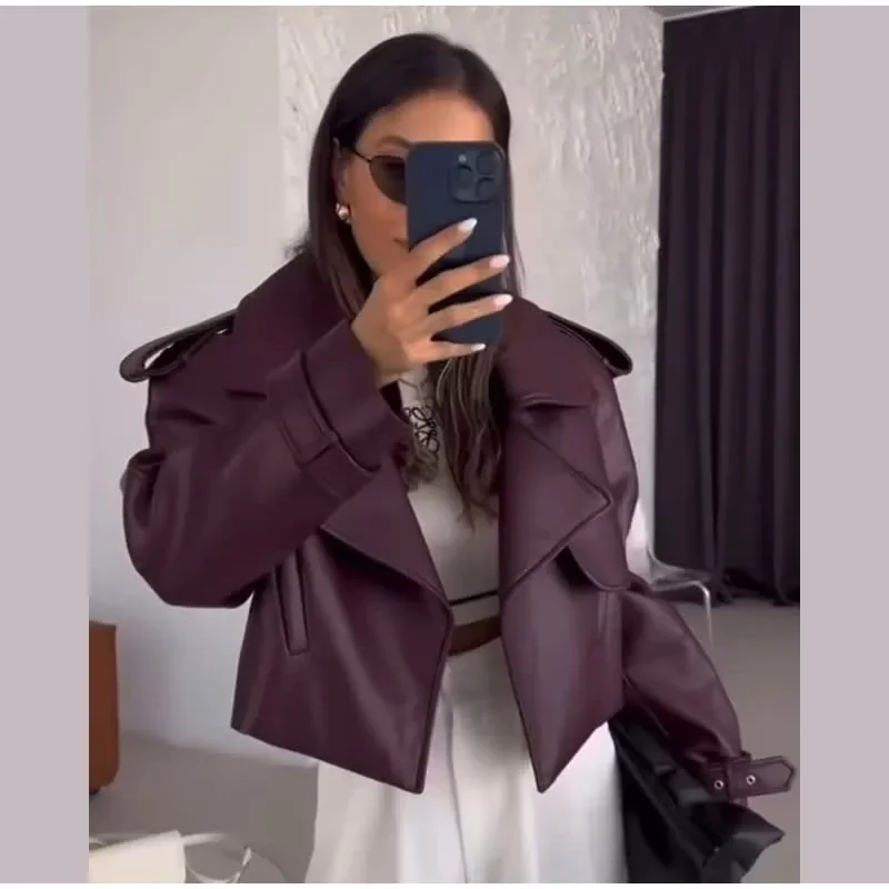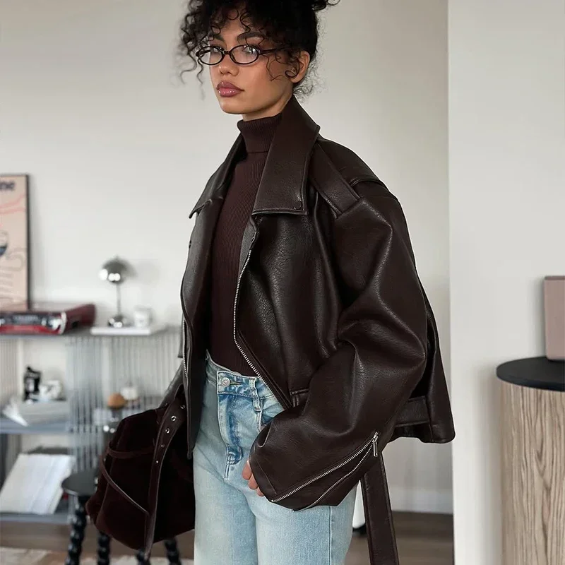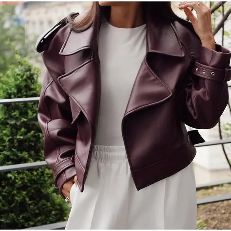 Brown Lapel Leather Bomber Jacket Women's Fashion Full Sleeve Zipper Pocket Lace Up Belt Coat 2025 Autumn High Street Outerwear