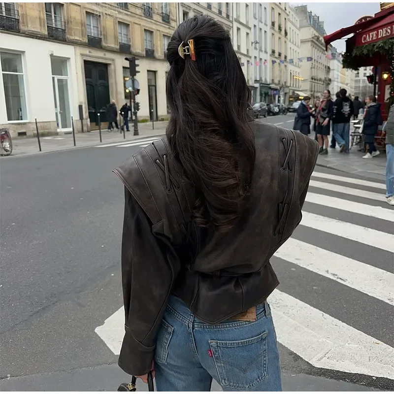 Model Number: Retro Brown Lapel Lace Up Leather Jacket