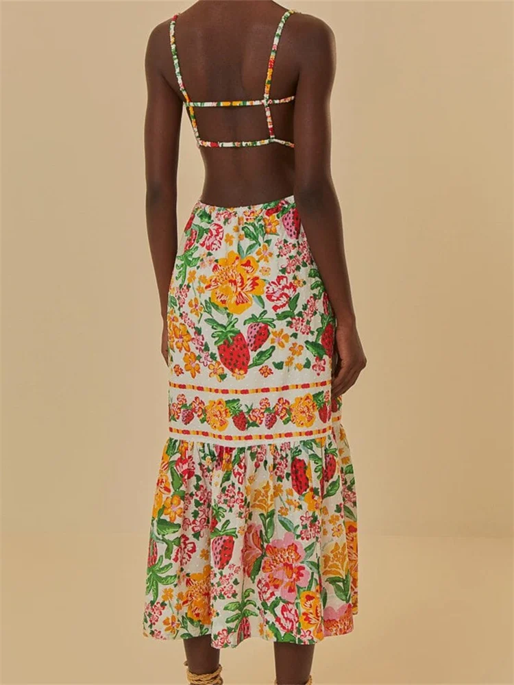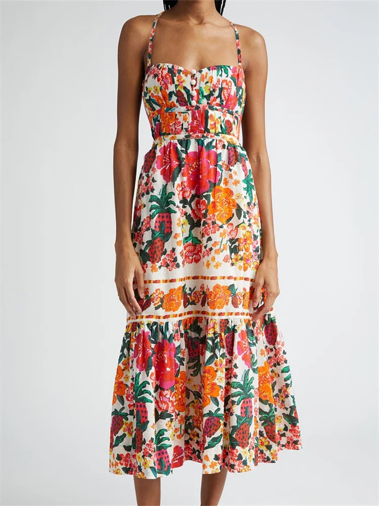 CHRONSTYLE Vintage Floral Print Long Maxi Dress for Women Sleeveless Strap Ruched Buttons Up High Waist Beach Dress Vestido 2024