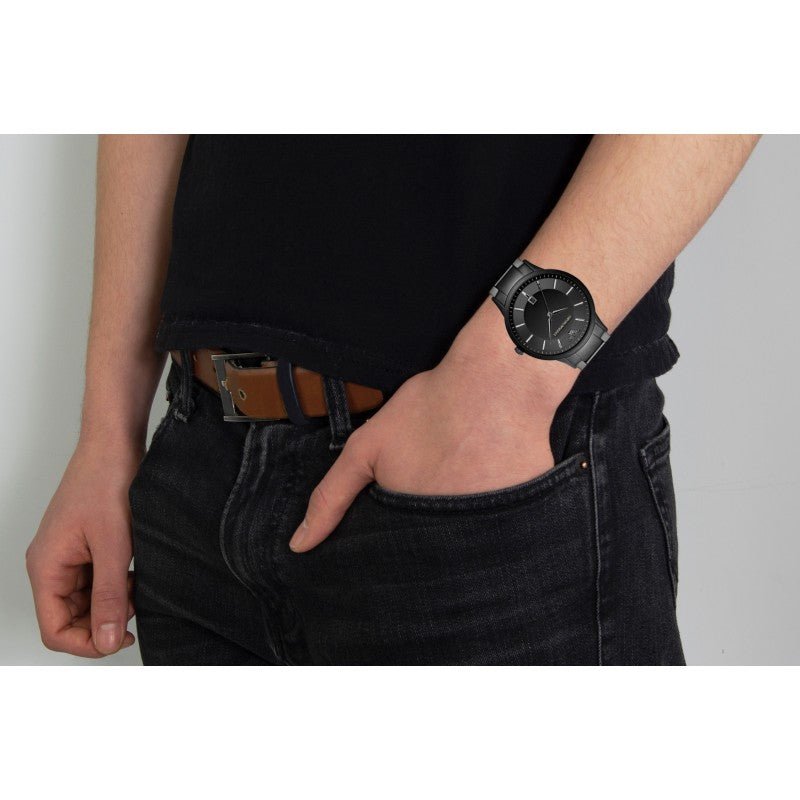 The Emporio Armani AR11184 Black Stainless Steel Watch is a striking timepiece that combines sleek design with minimalist elegance. This watch features an all-black stainless steel case and bracelet, exuding a bold and modern aesthetic. The black dial is subtly contrasted by silver-tone hands and index markers, providing a clear and refined look. A date display is conveniently located at the 6 o'clock position, enhancing its functionality. Perfect for any occasion, whether it be formal or casual, the AR11184 is a versatile accessory that adds a touch of sophistication to any outfit.