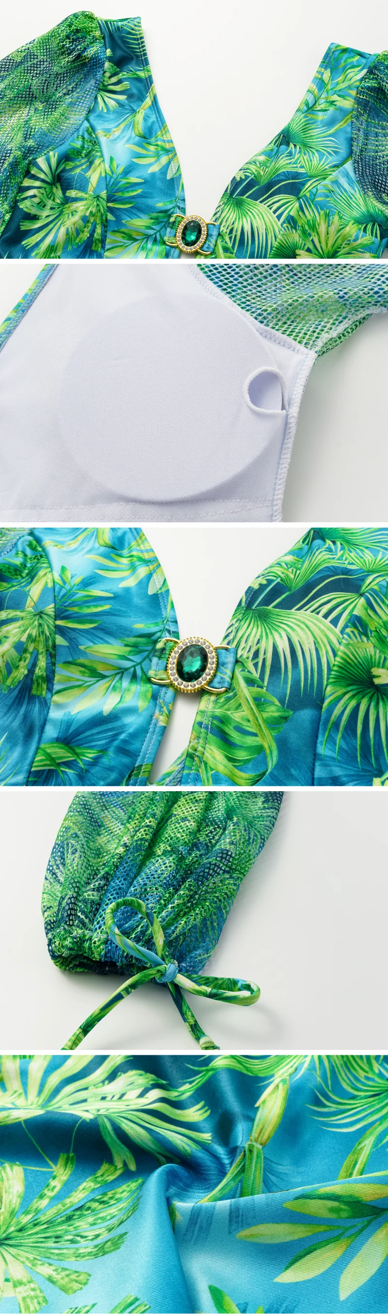 Flaxmaker Women Sexy Deep V Neck Long-sleeved Jungle Green Print One Piece Swimsuit And Skirt Summer Bathing Suit Monokini
