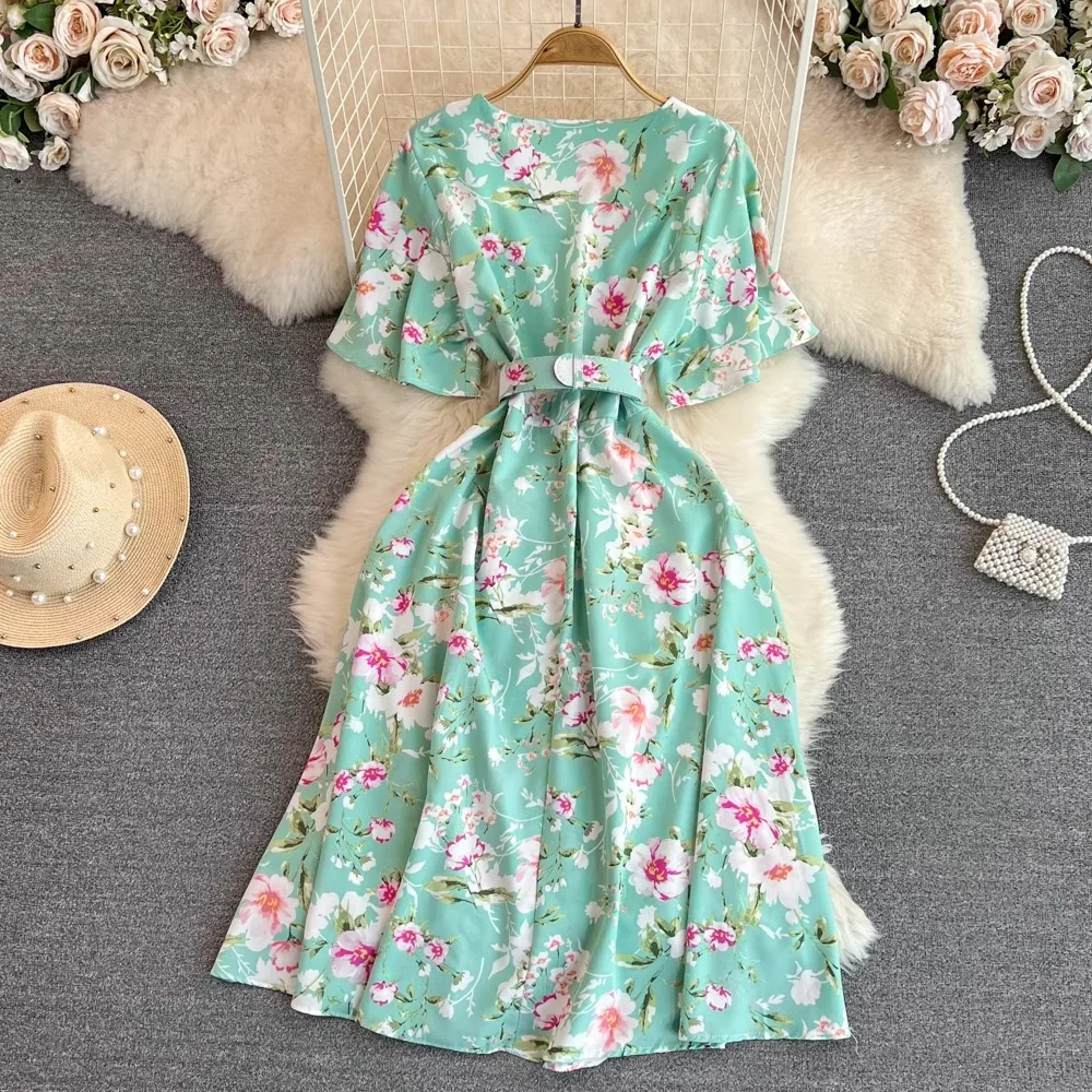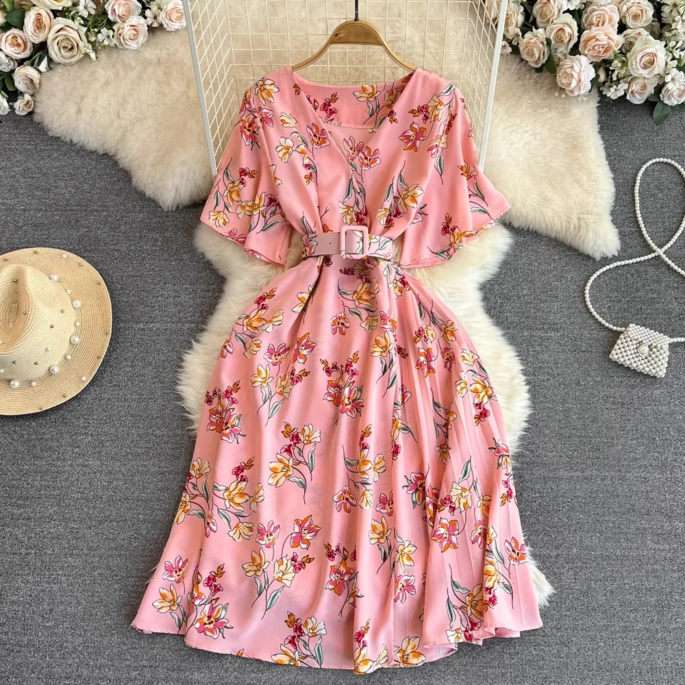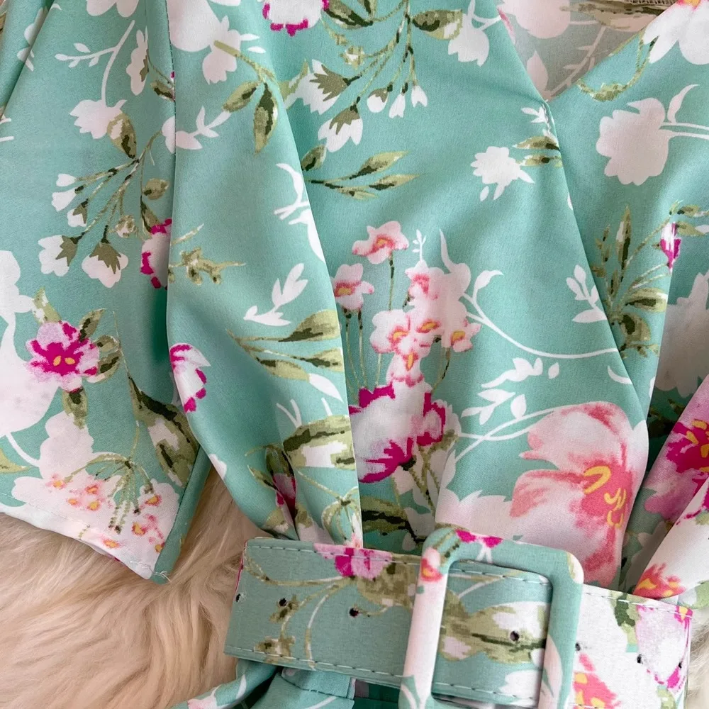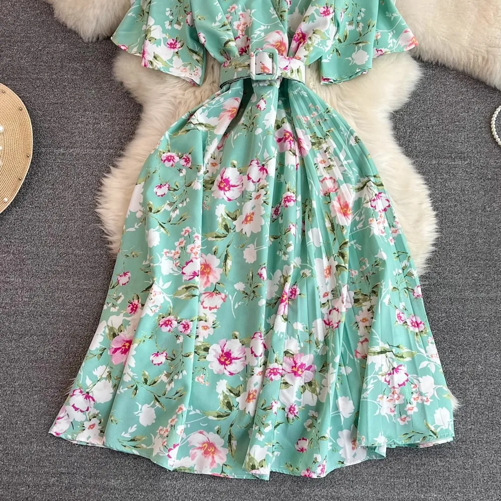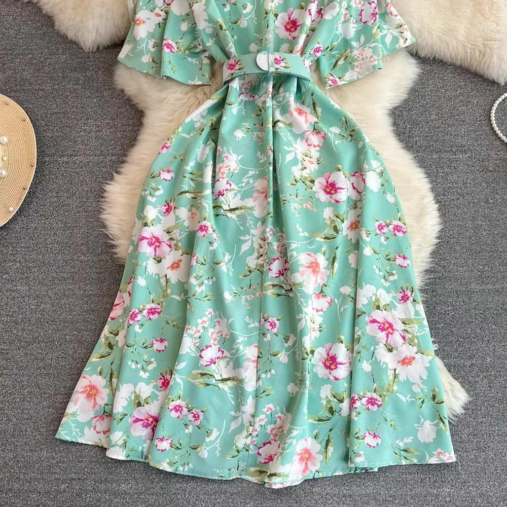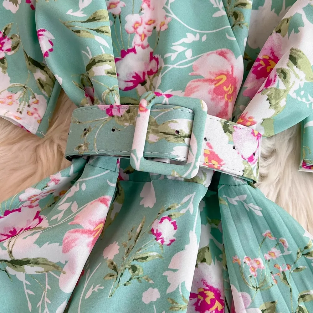 Floral Print V-Neck Long Party Dress with Belt Lady Outfits Vestidos
