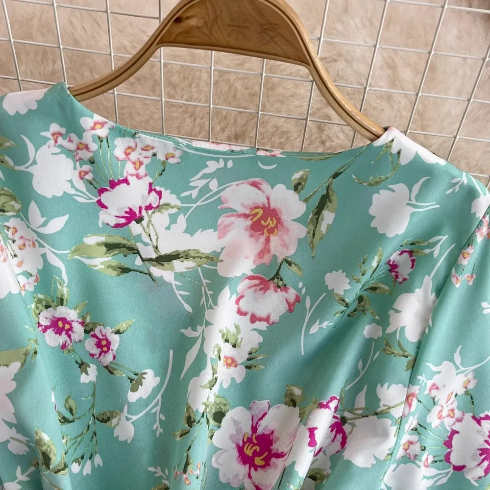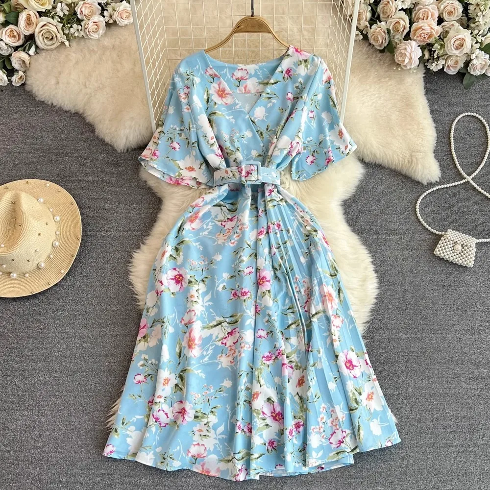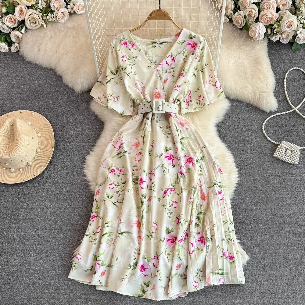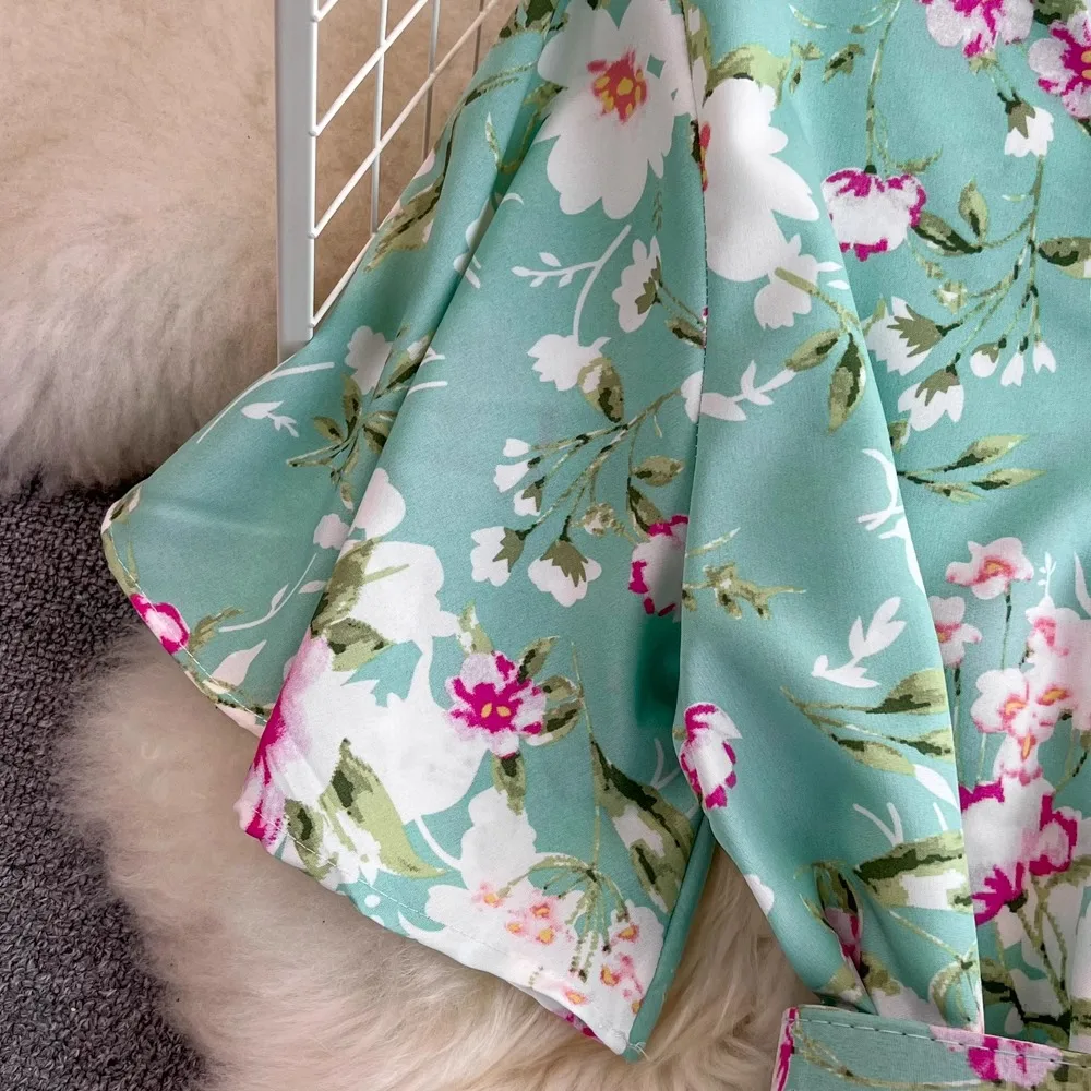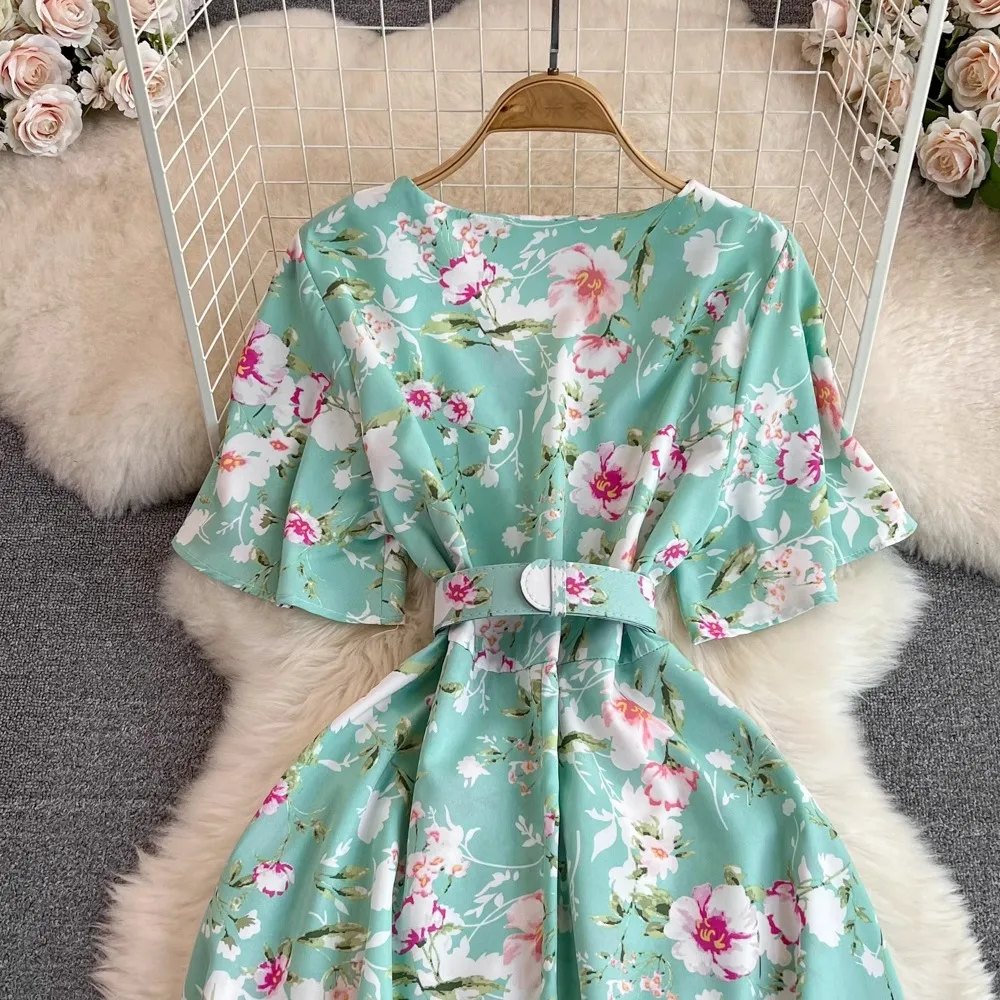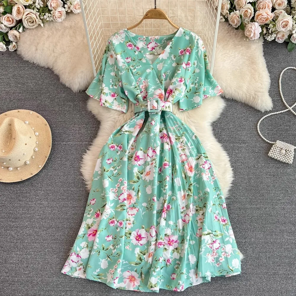 Floral Print V-Neck Long Party Dress with Belt Lady Outfits Vestidos