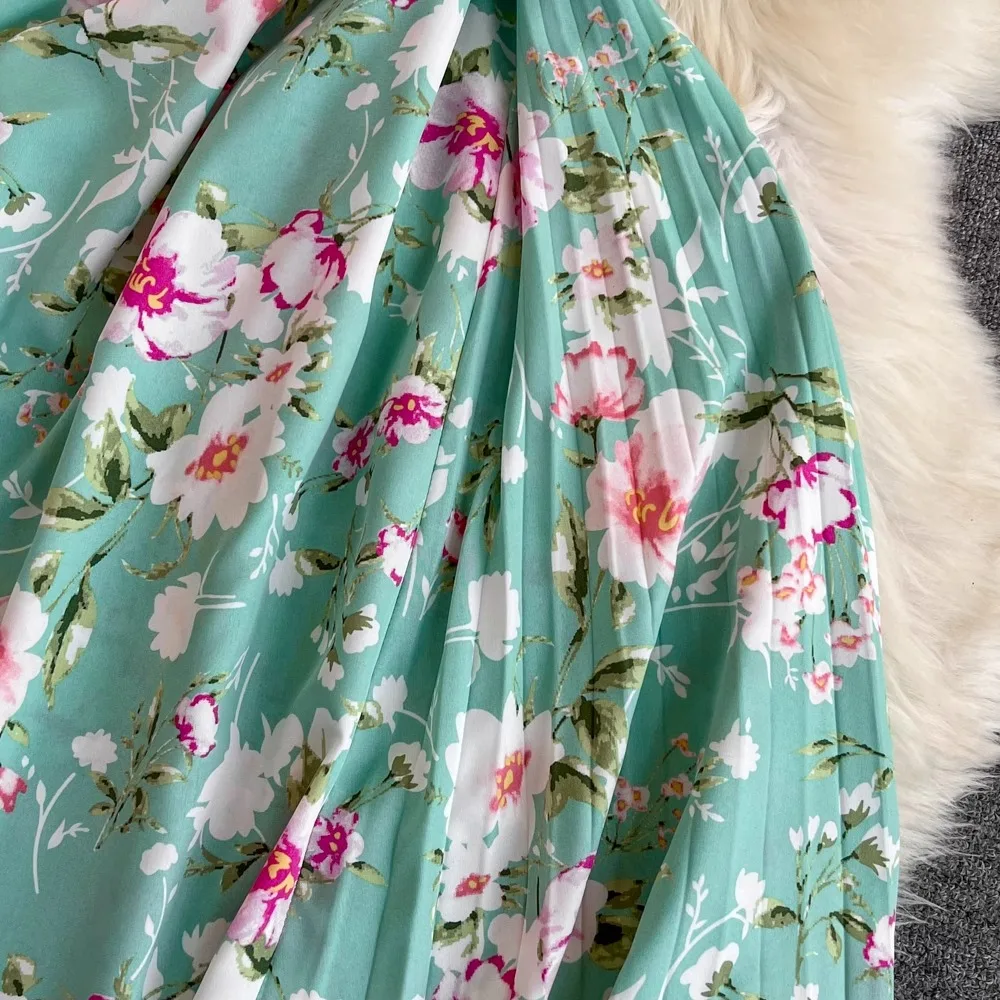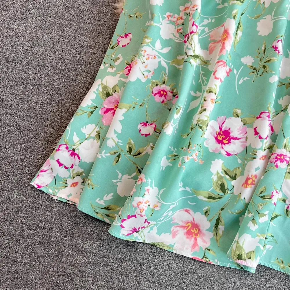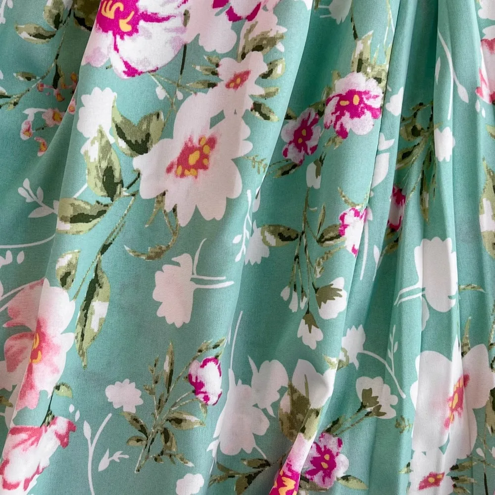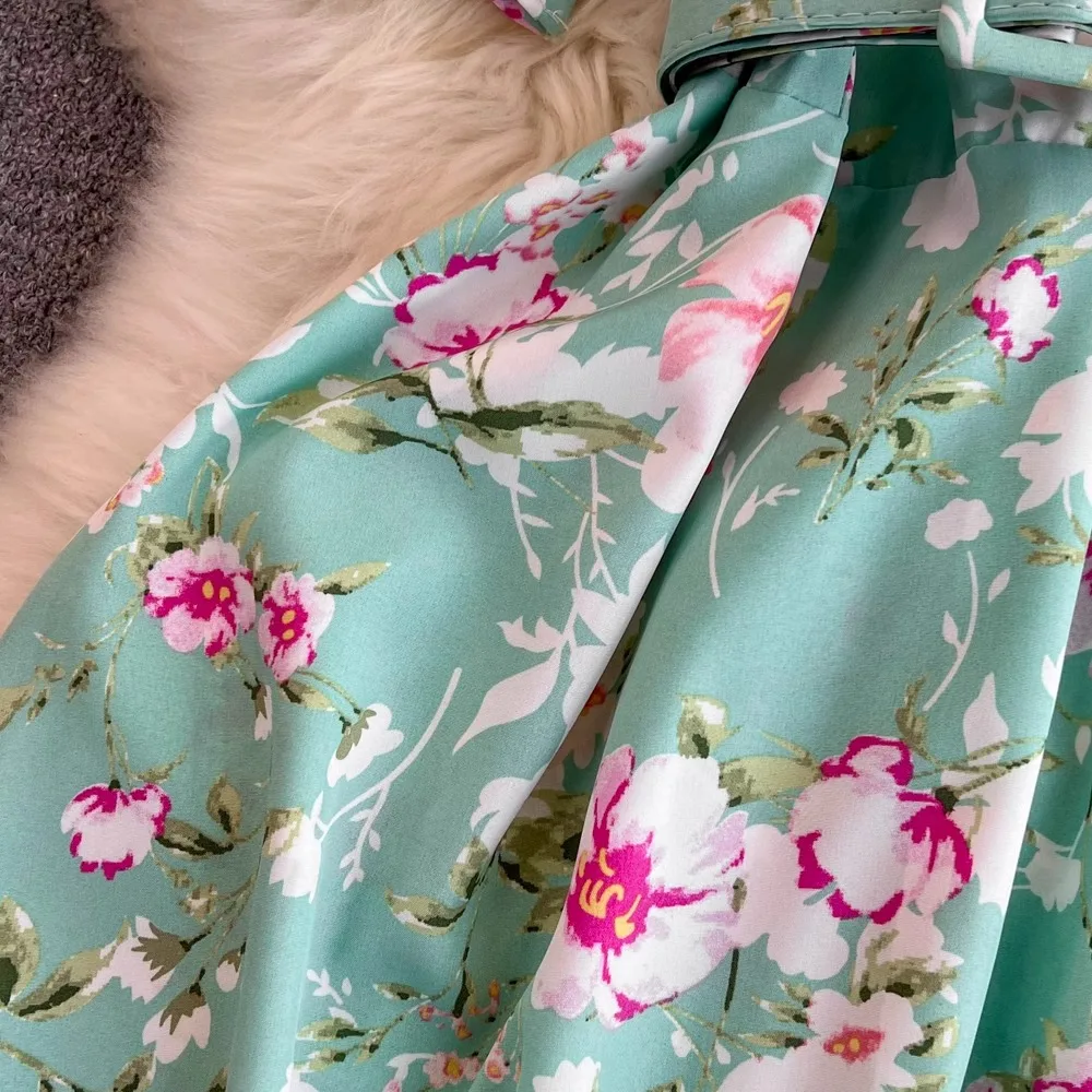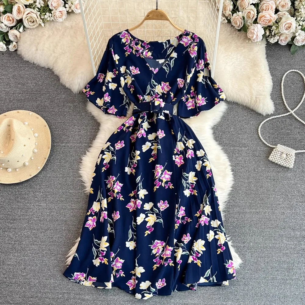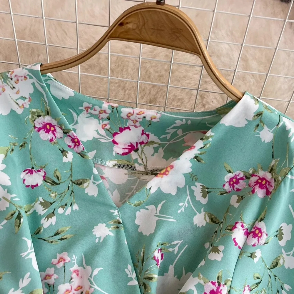 Floral Print V-Neck Long Party Dress with Belt Lady Outfits Vestidos