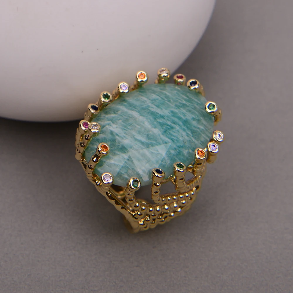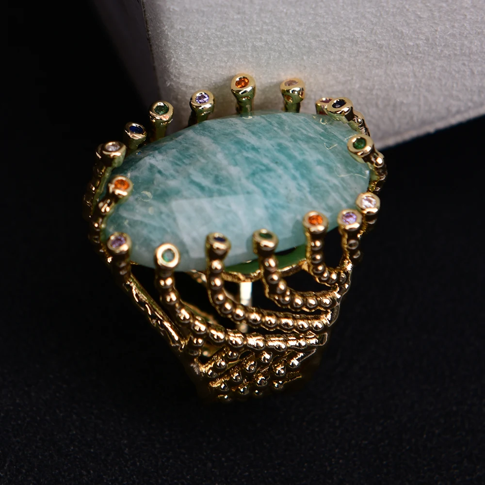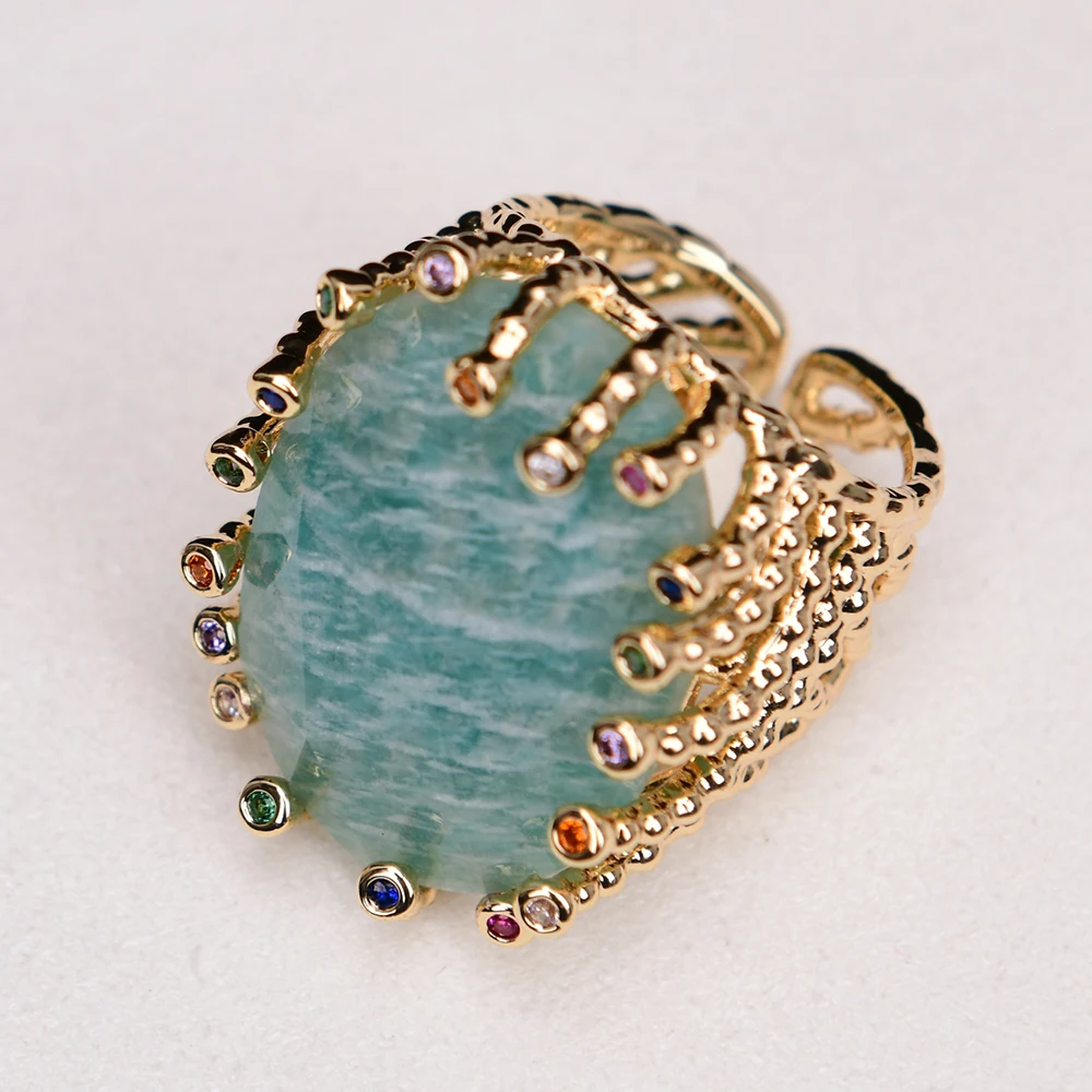 G-G Big Stone Natural Green Amazonite Gold Plated Finger Rings