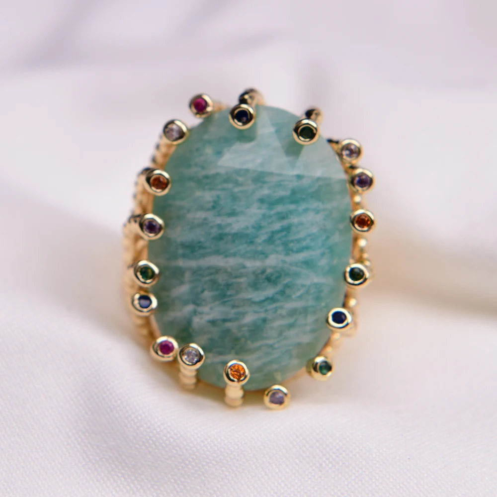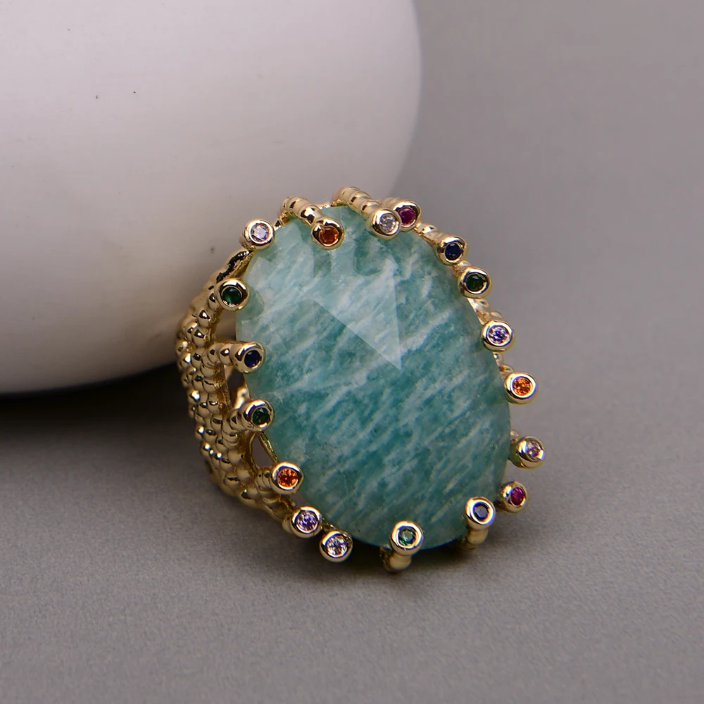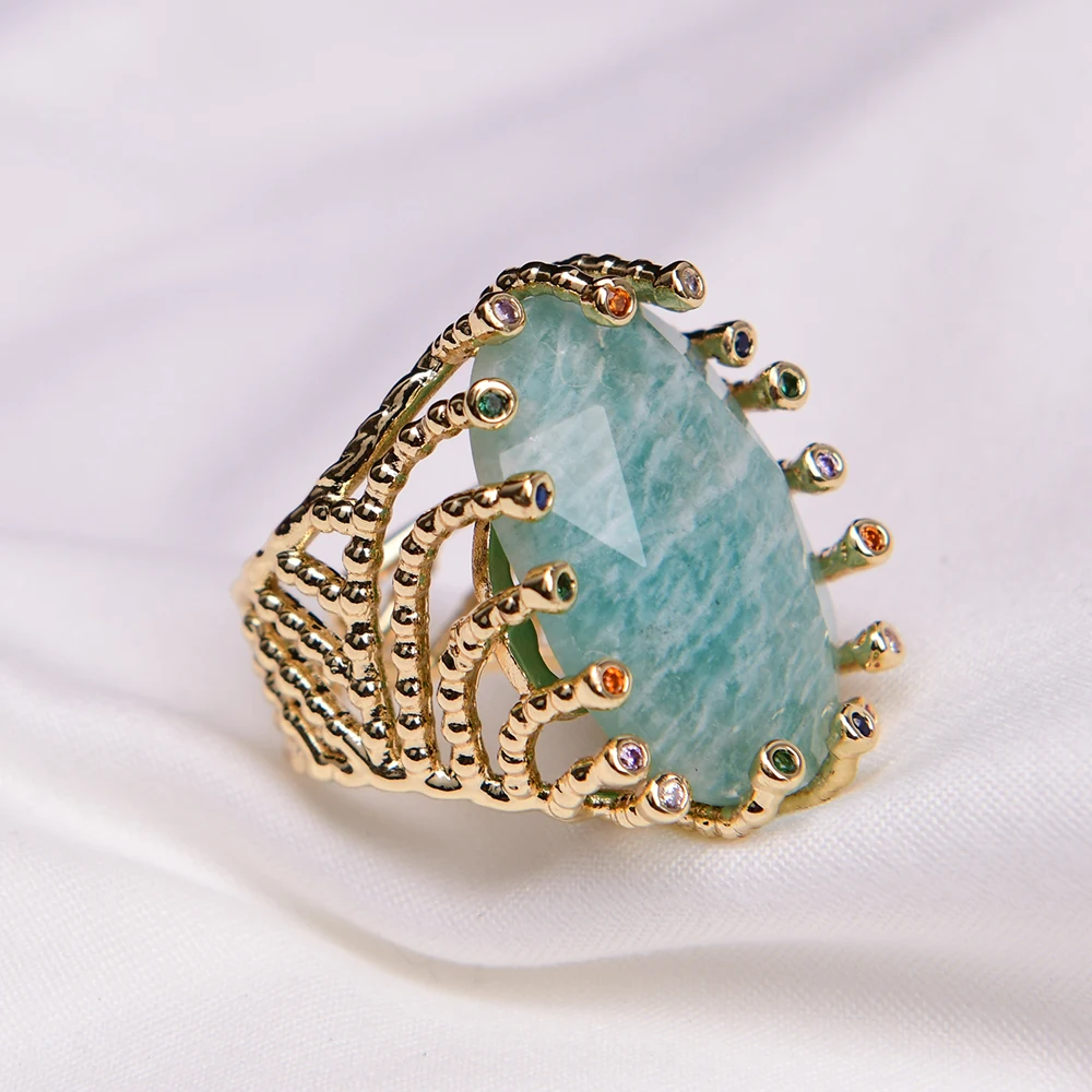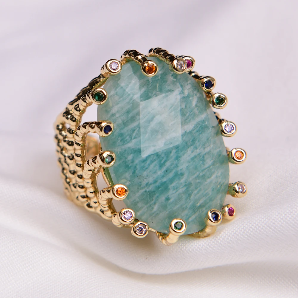 G-G Big Stone Natural Green Amazonite Gold Plated Finger Rings