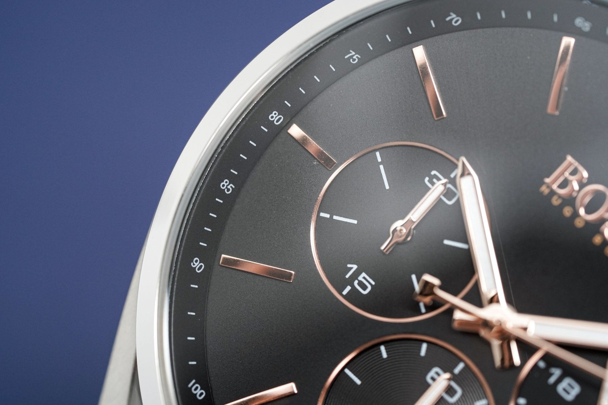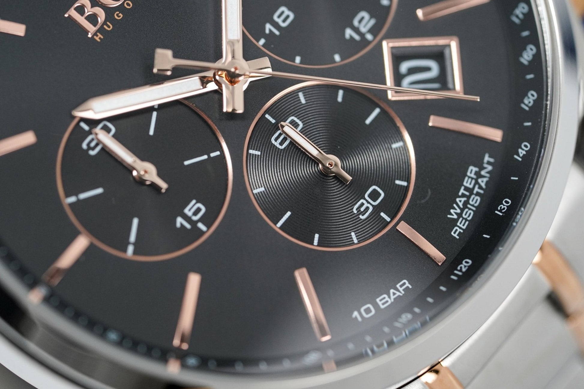 Black Sunburst Dial. Luminous Steel Rose Gold Plate Hands. Stainless Steel Rose Gold Plate Indexes. Date Window at 4:30.