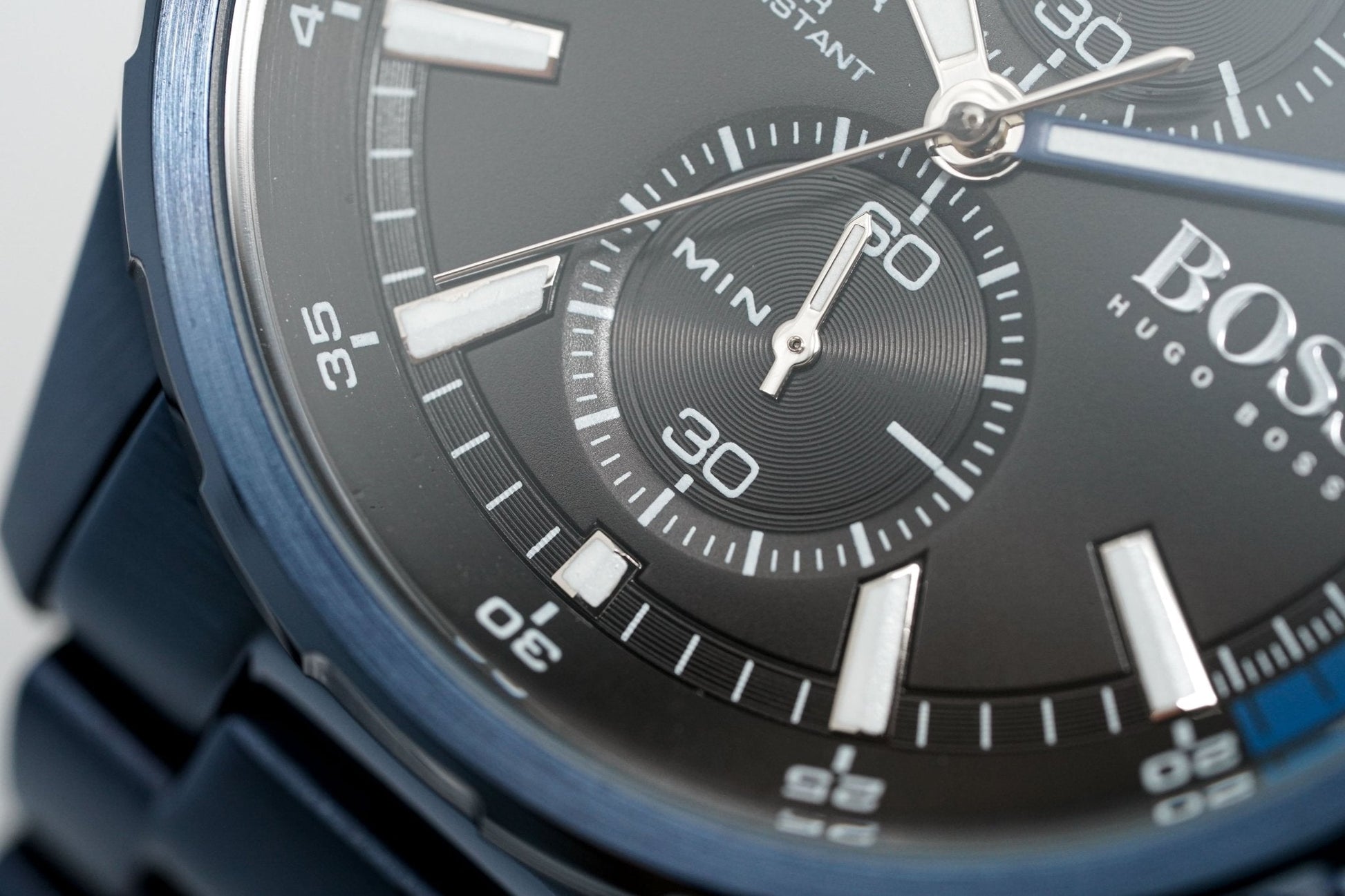 46mm Blue PVD Plated Stainless Steel Case. Scratch Resistant Mineral Crystal.