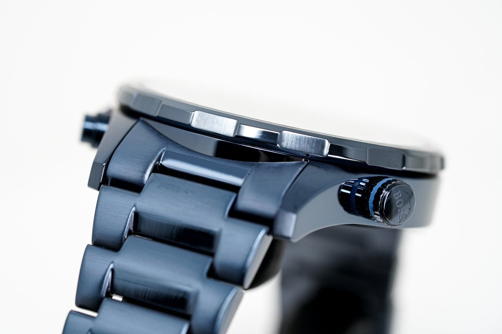 Blue PVD Plated Stainless Steel Polished Bracelet with Stainless Steel Push Button Deployment Clasp.
