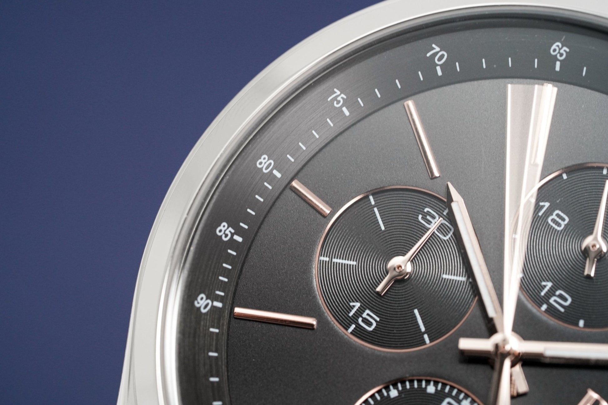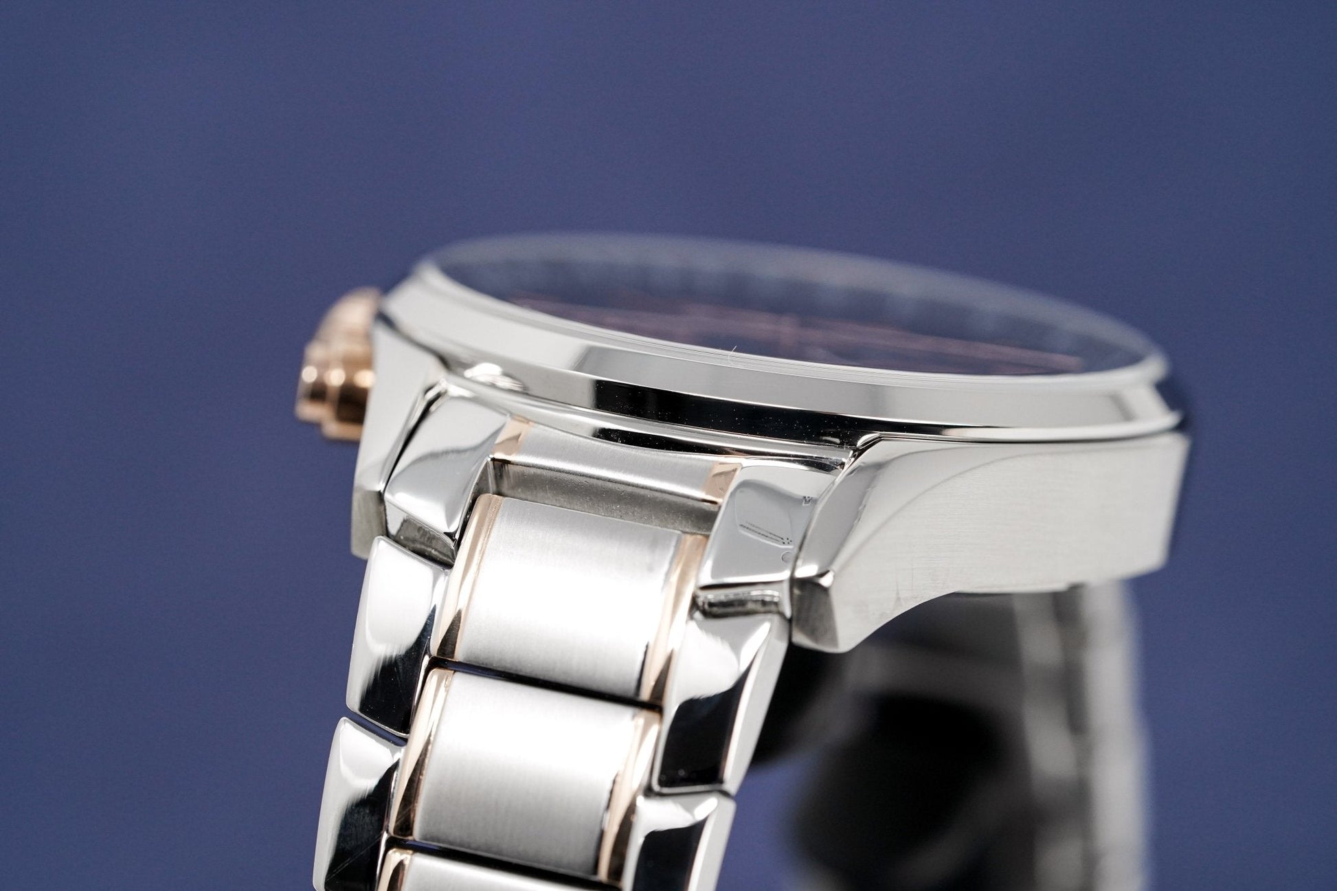 Black Dial. Rose Gold PVD Plated Steel Hands. Rose Gold PVD Stainless Steel Stick Indexes. Date Window at 4:30.