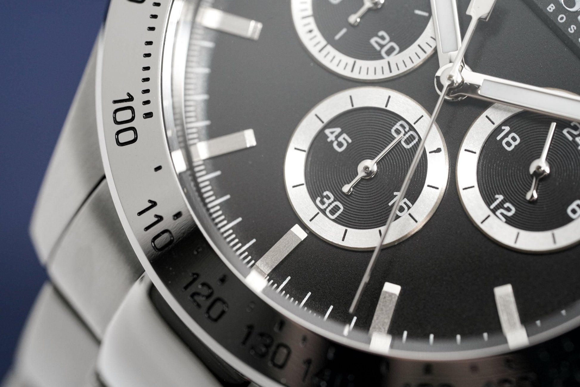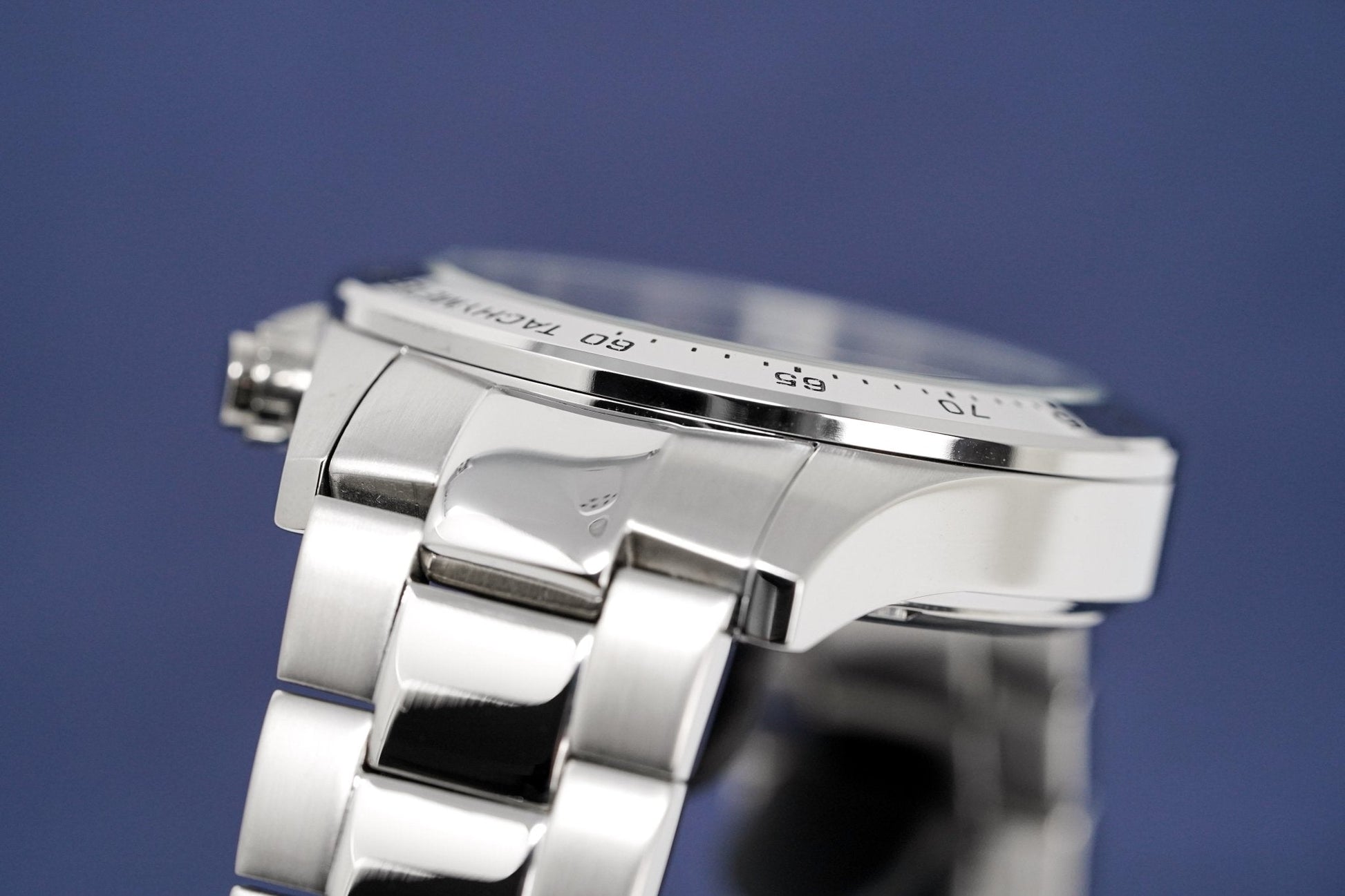 44mm Stainless Steel Case. Scratch Resistant Mineral Crystal. Tachymeter Bezel.