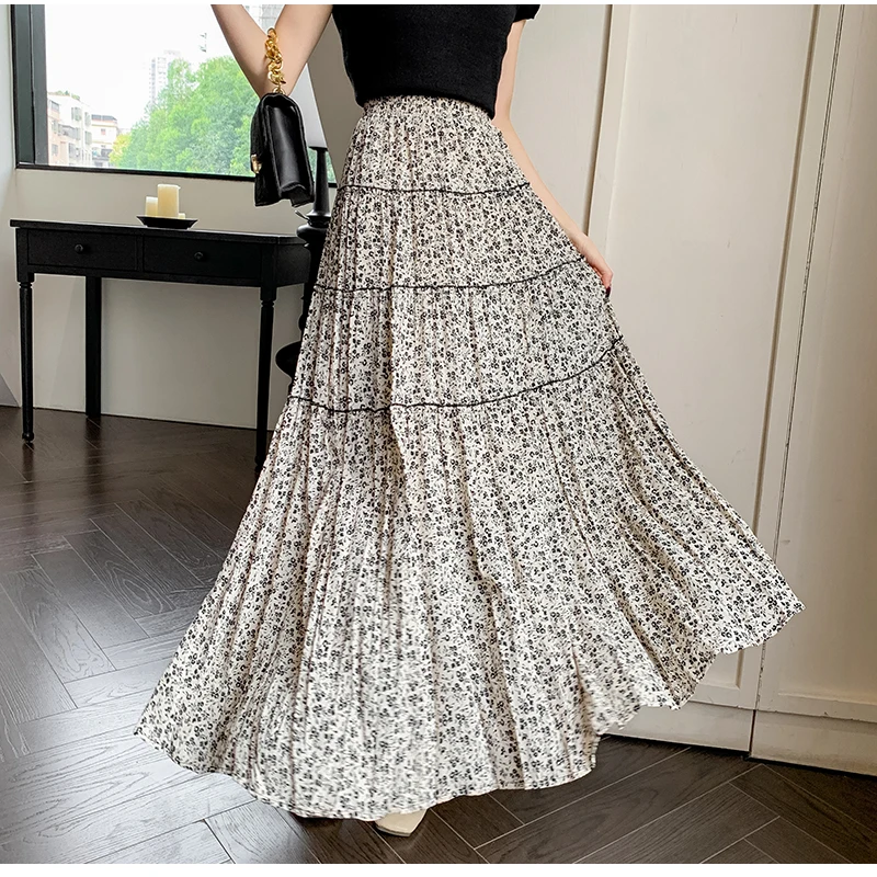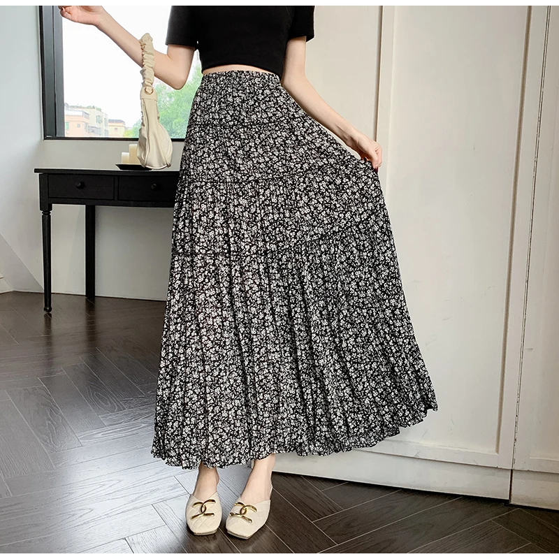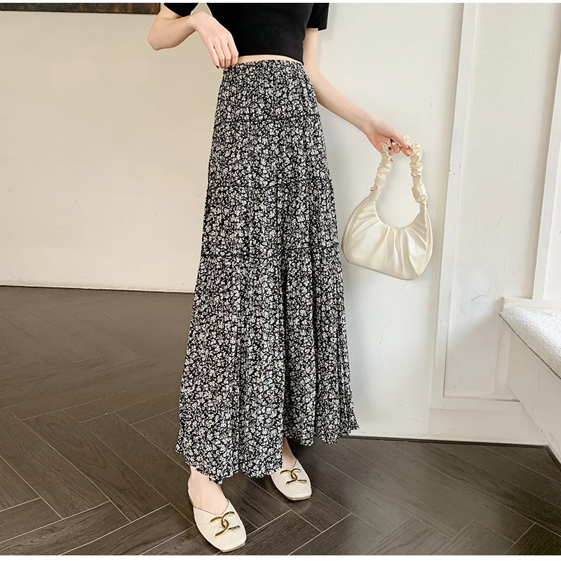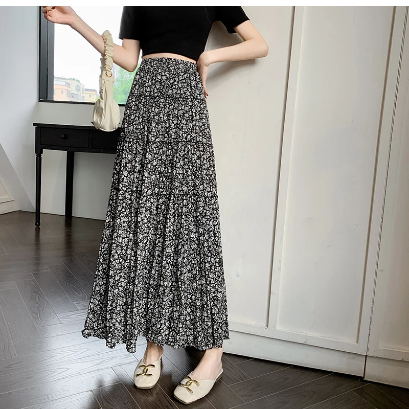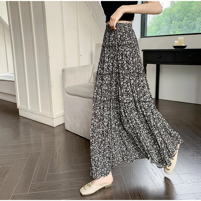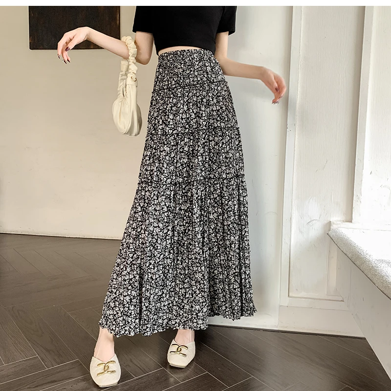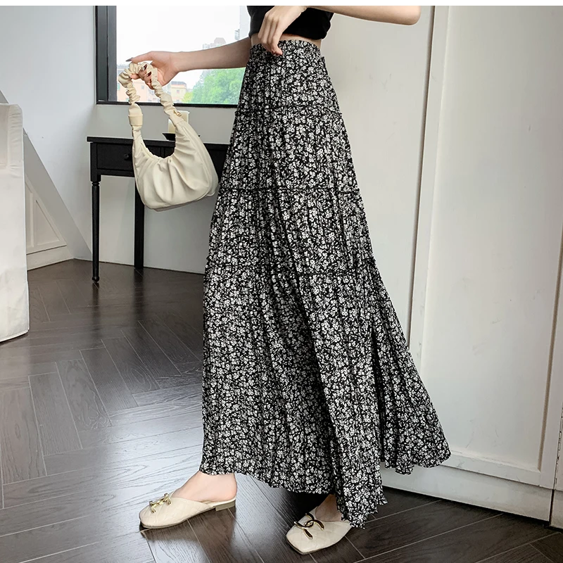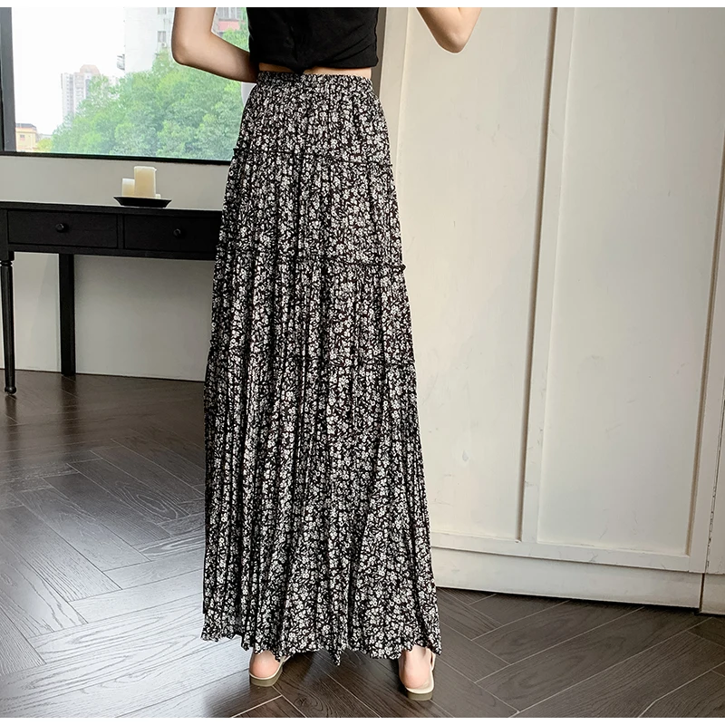 Korean Fashion Women Boho Floral Print Elastic High Waist Pleated A Line Maxi Skirts Summer Holiday Black Apricot Skirts Female