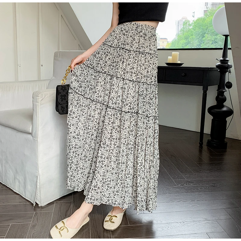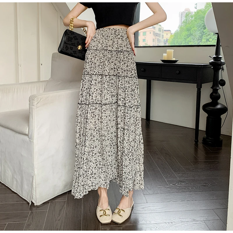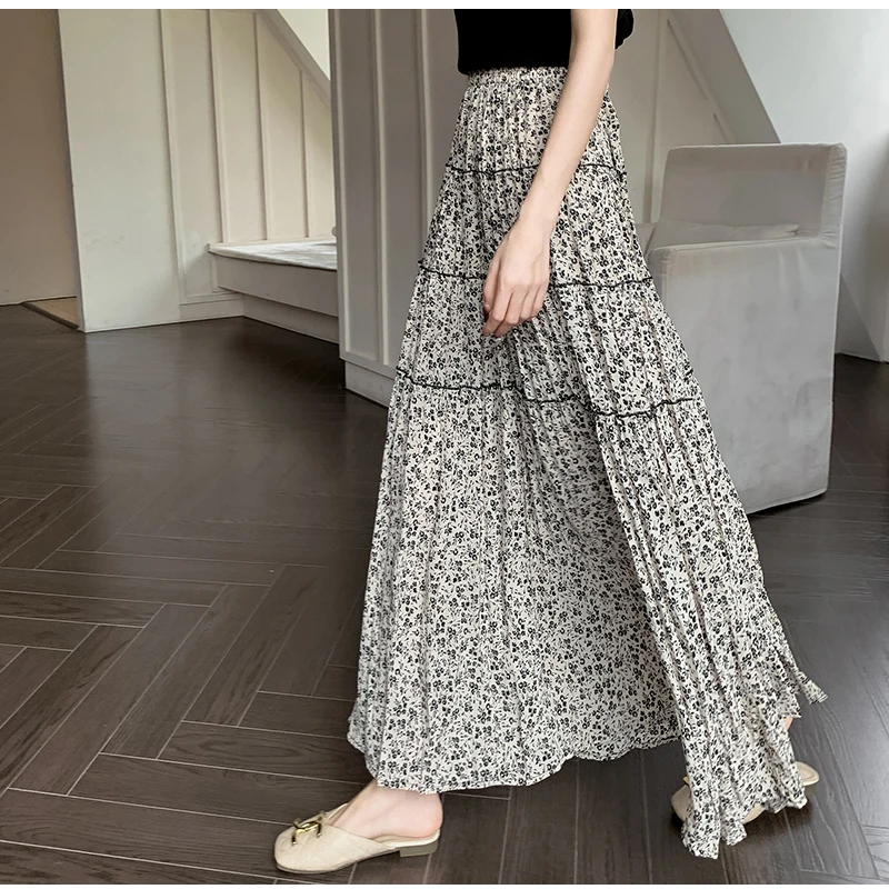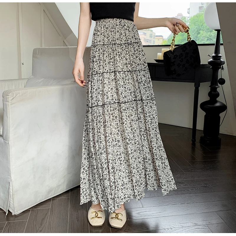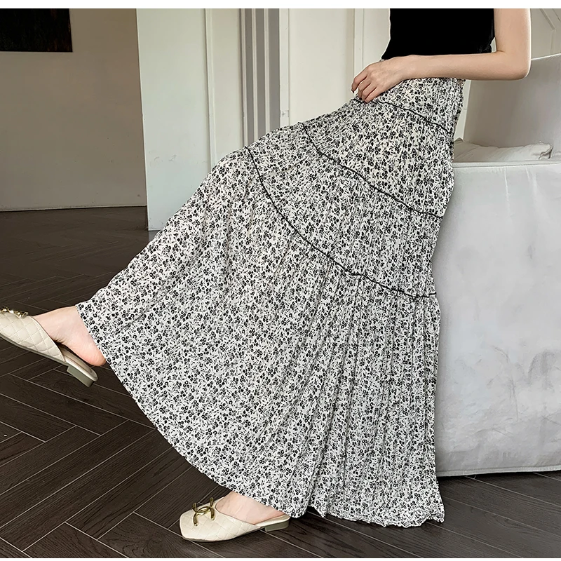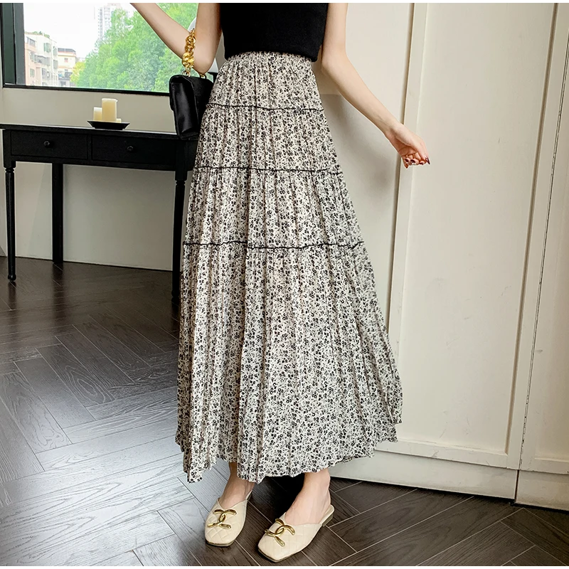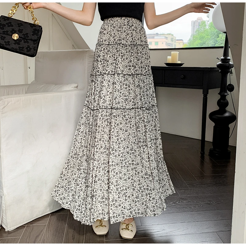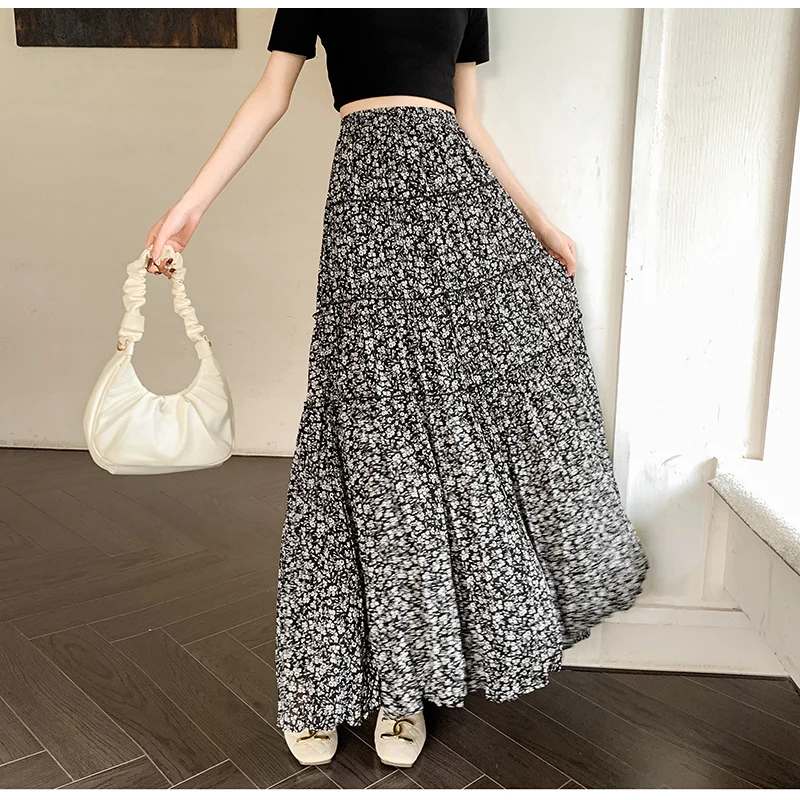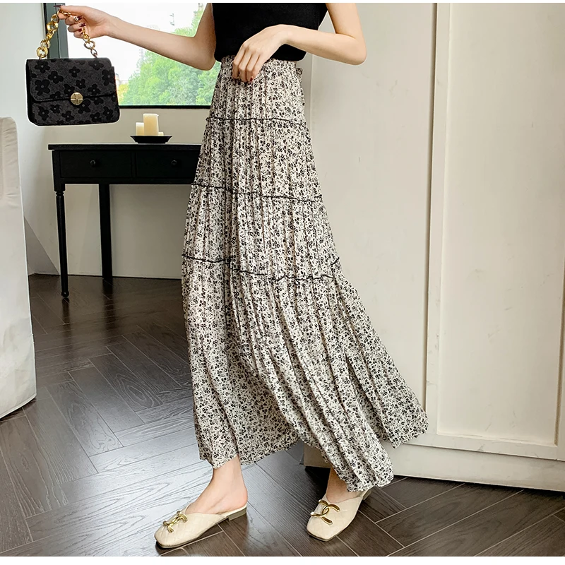 Korean Fashion Women Boho Floral Print Elastic High Waist Pleated A Line Maxi Skirts Summer Holiday Black Apricot Skirts Female