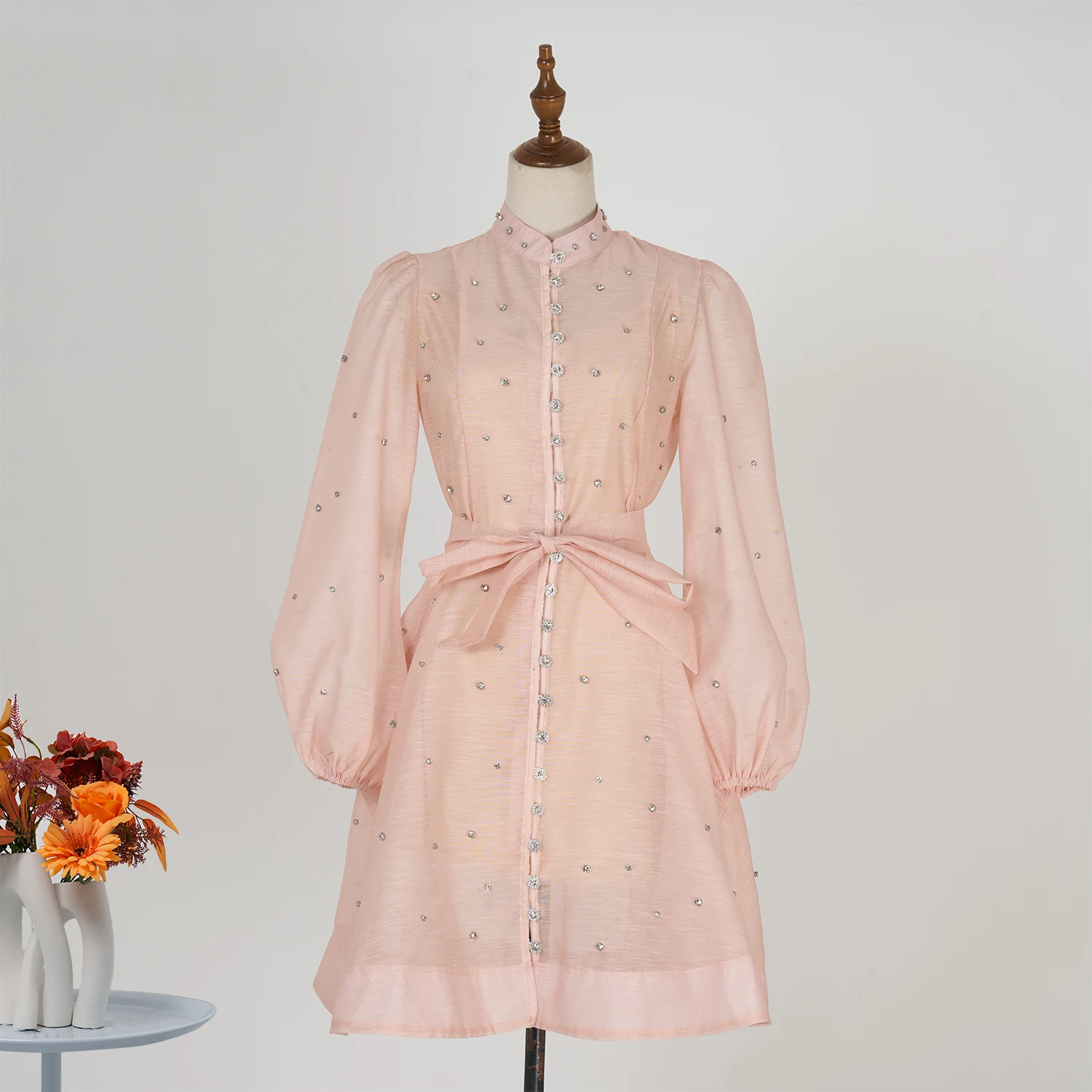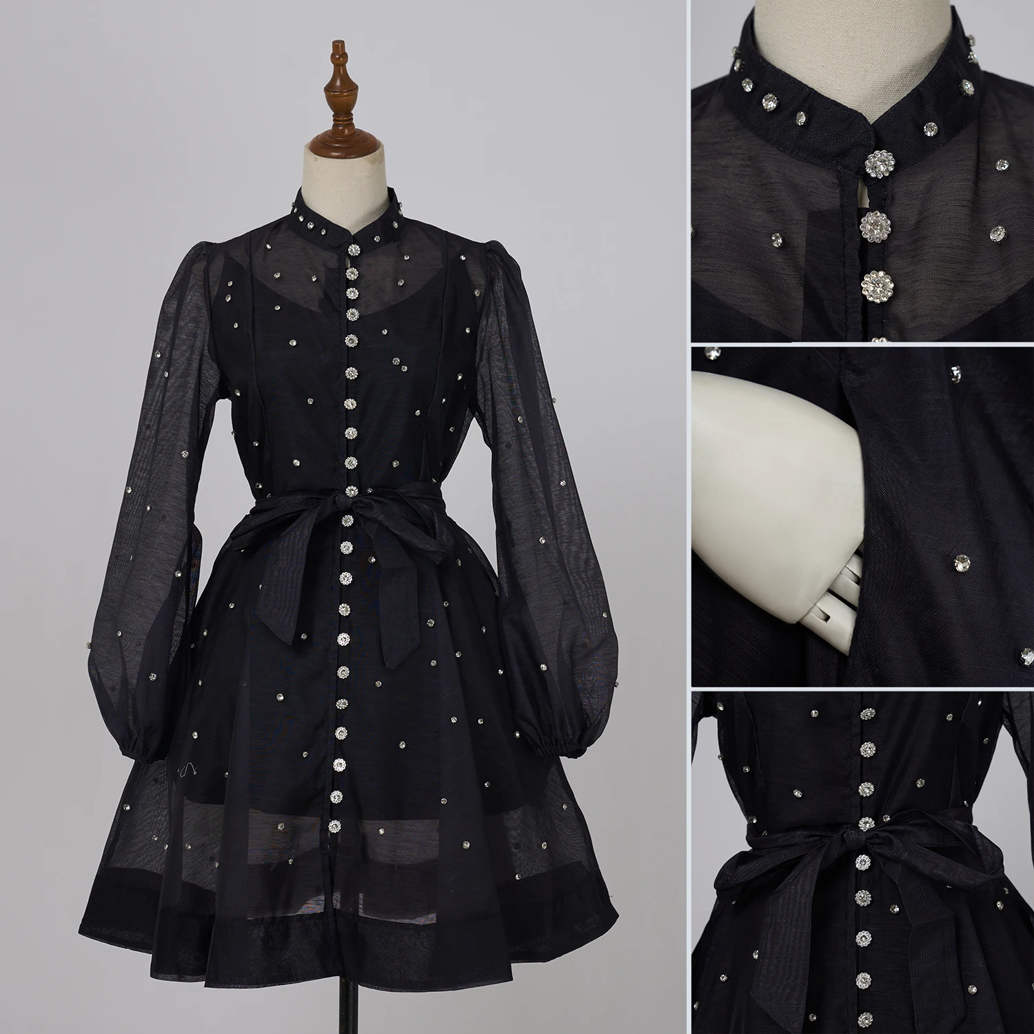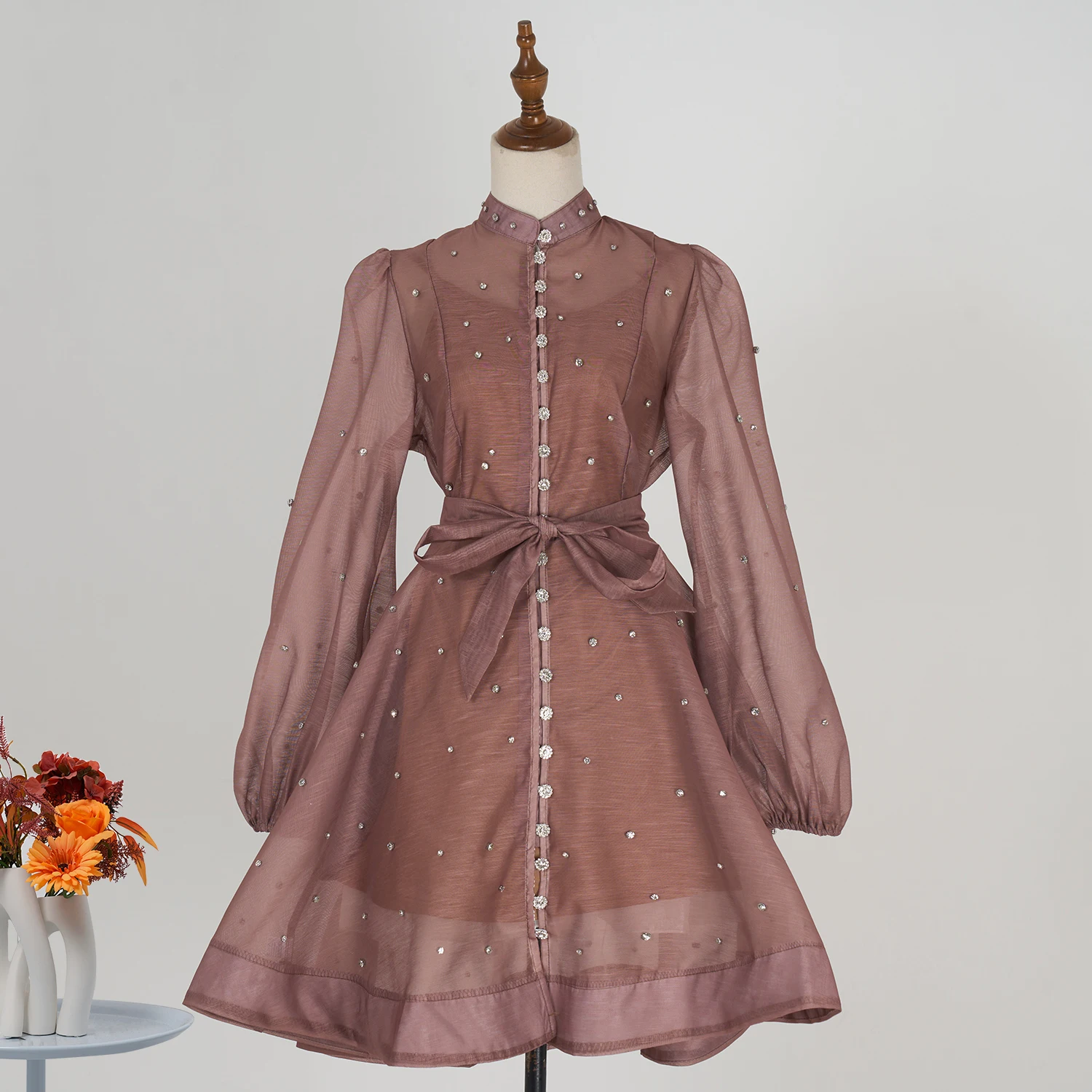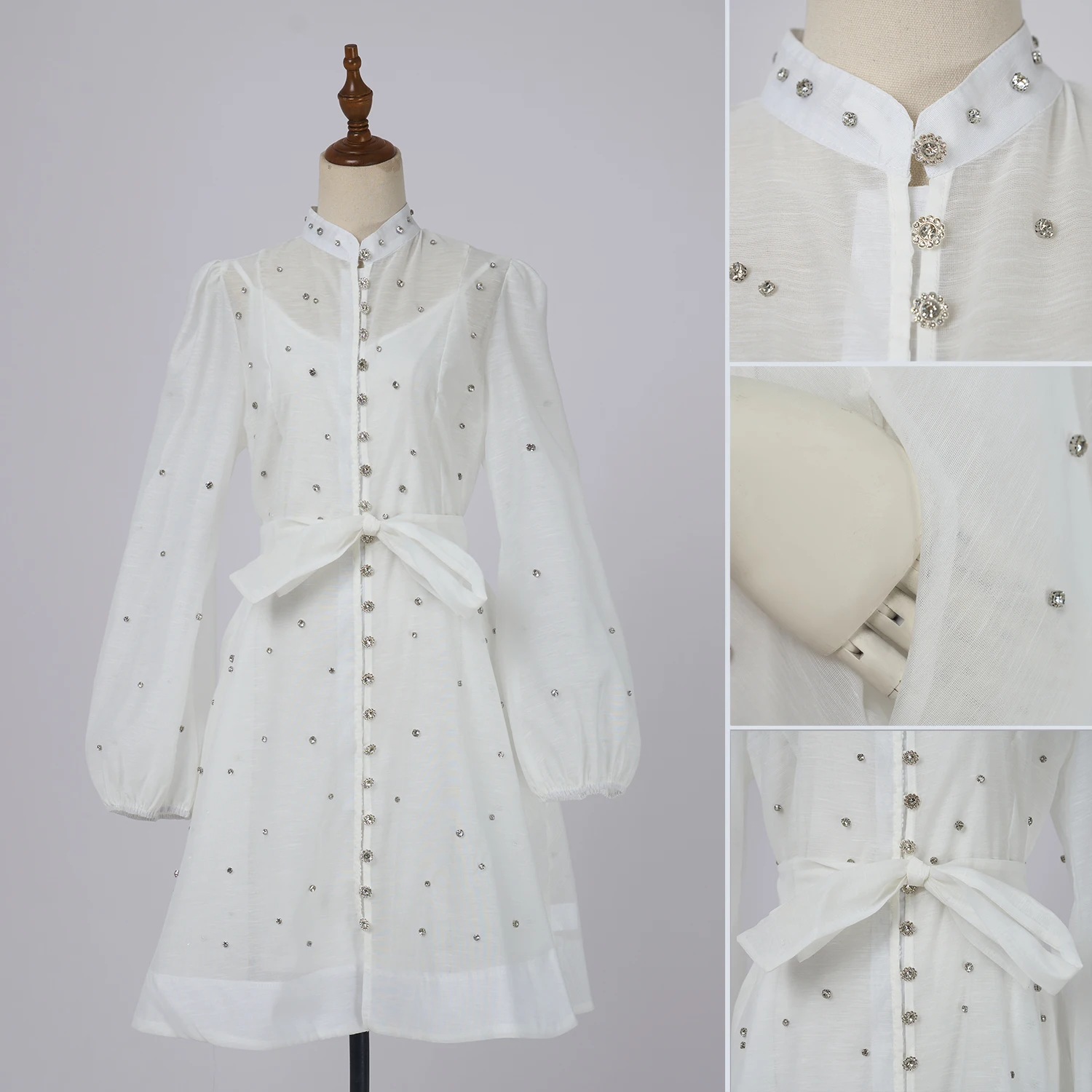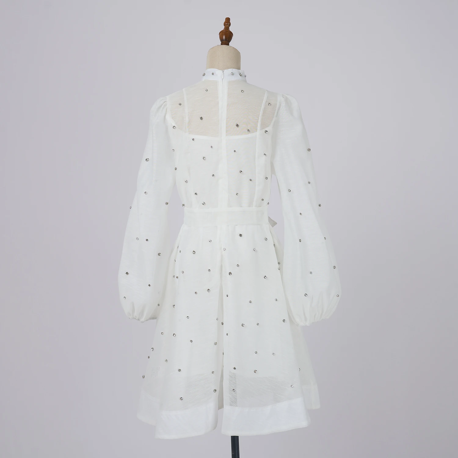Luxury Crystal Short Dresses Women Summer Studded Diamond Stand Collar Lantern Sleeve 2025 Sping Loose Evening Party Vestidos