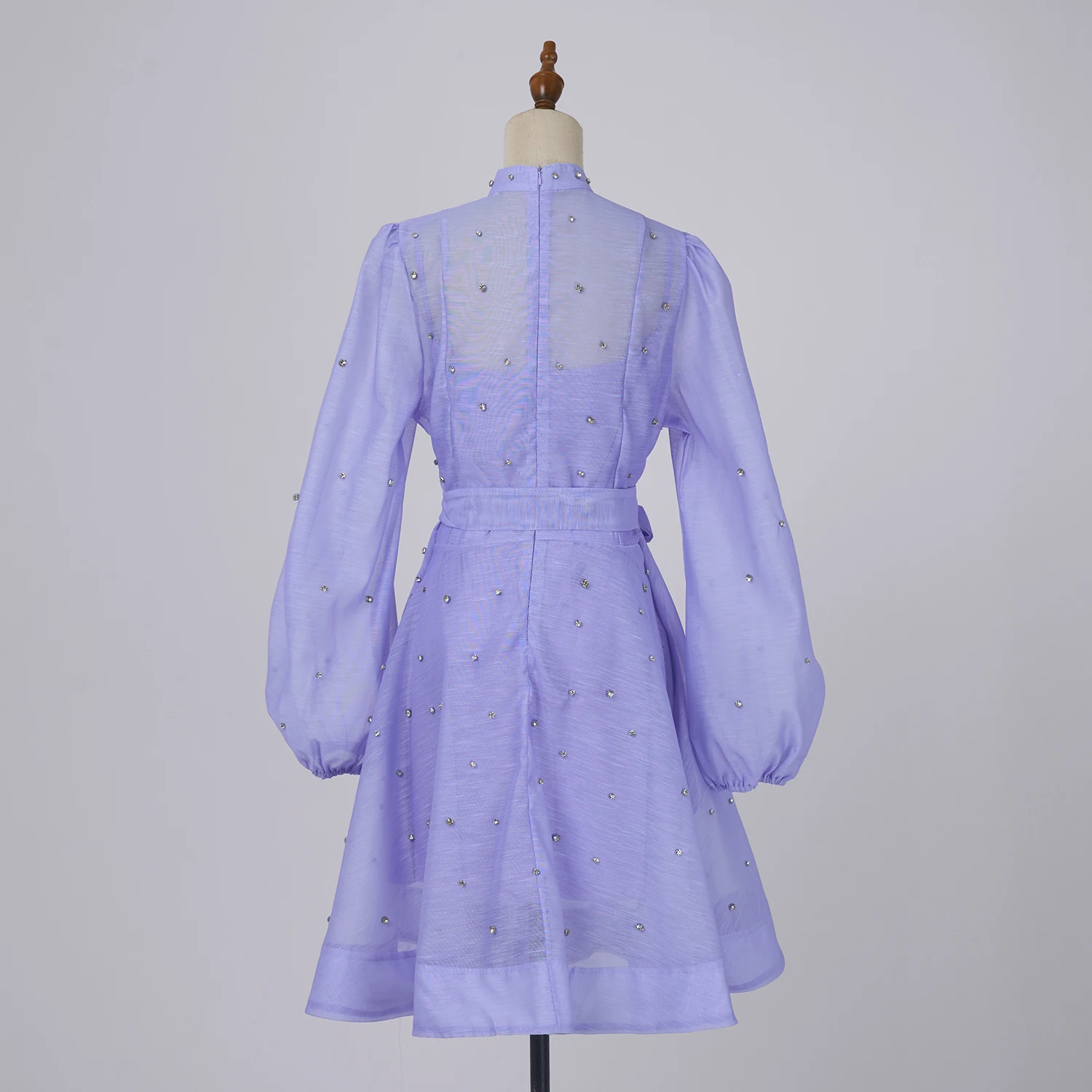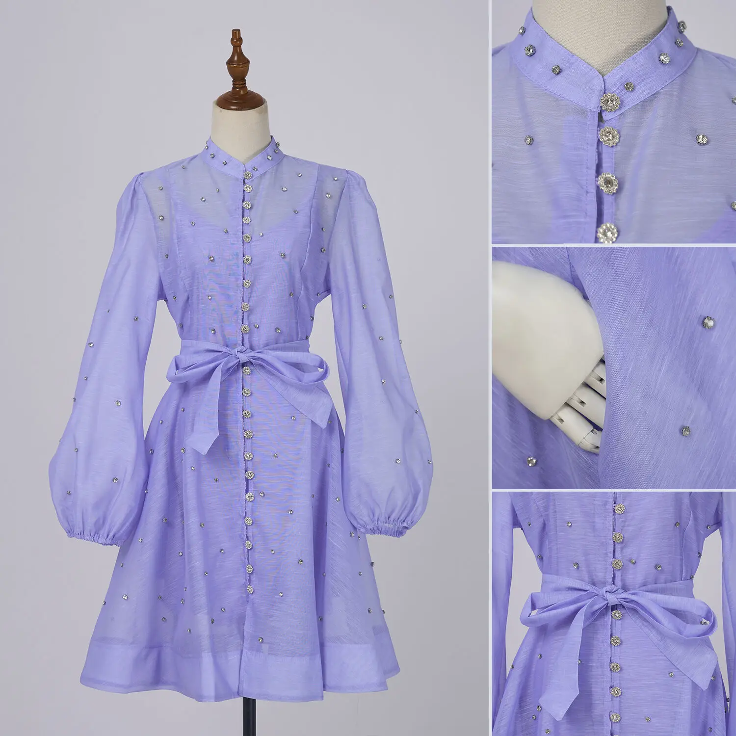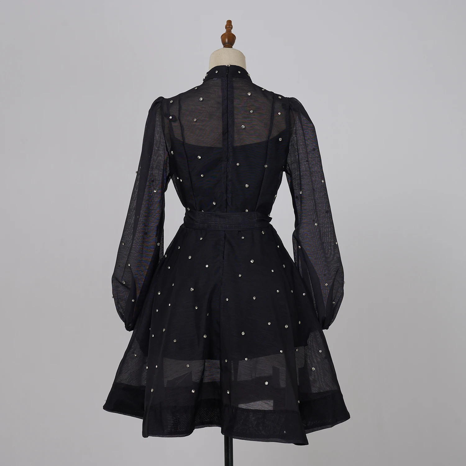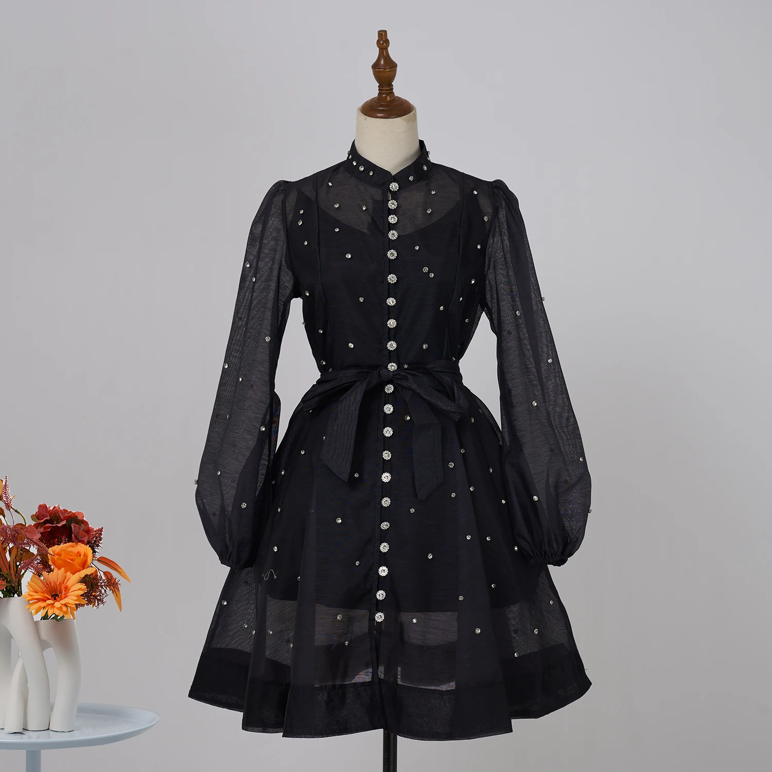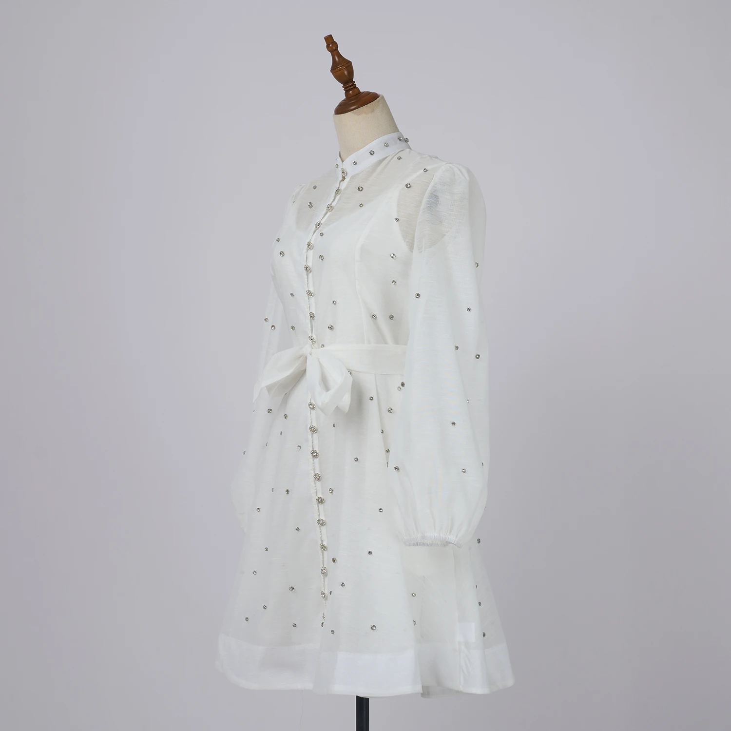 Luxury Crystal Short Dresses Women Summer Studded Diamond Stand Collar Lantern Sleeve 2025 Sping Loose Evening Party Vestidos