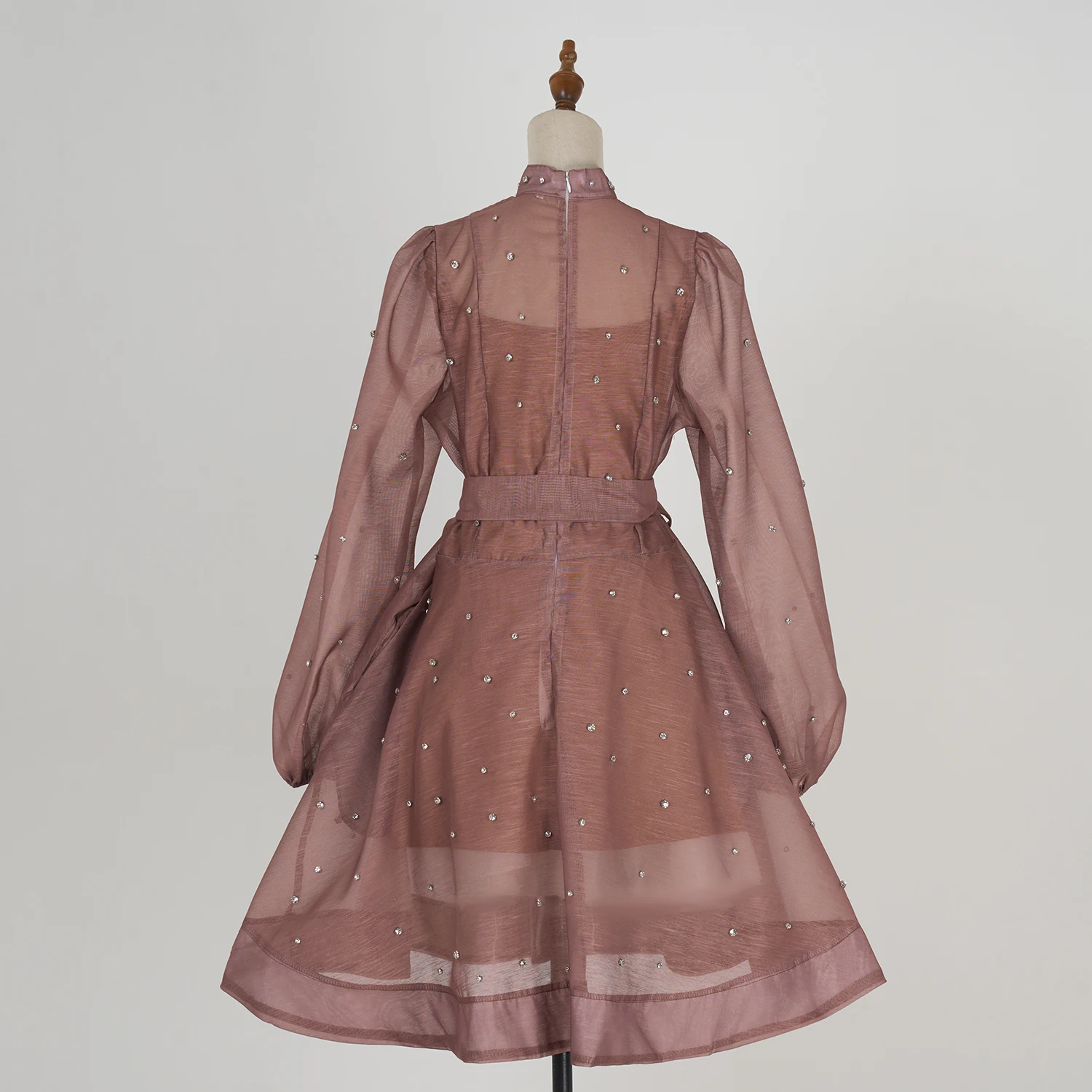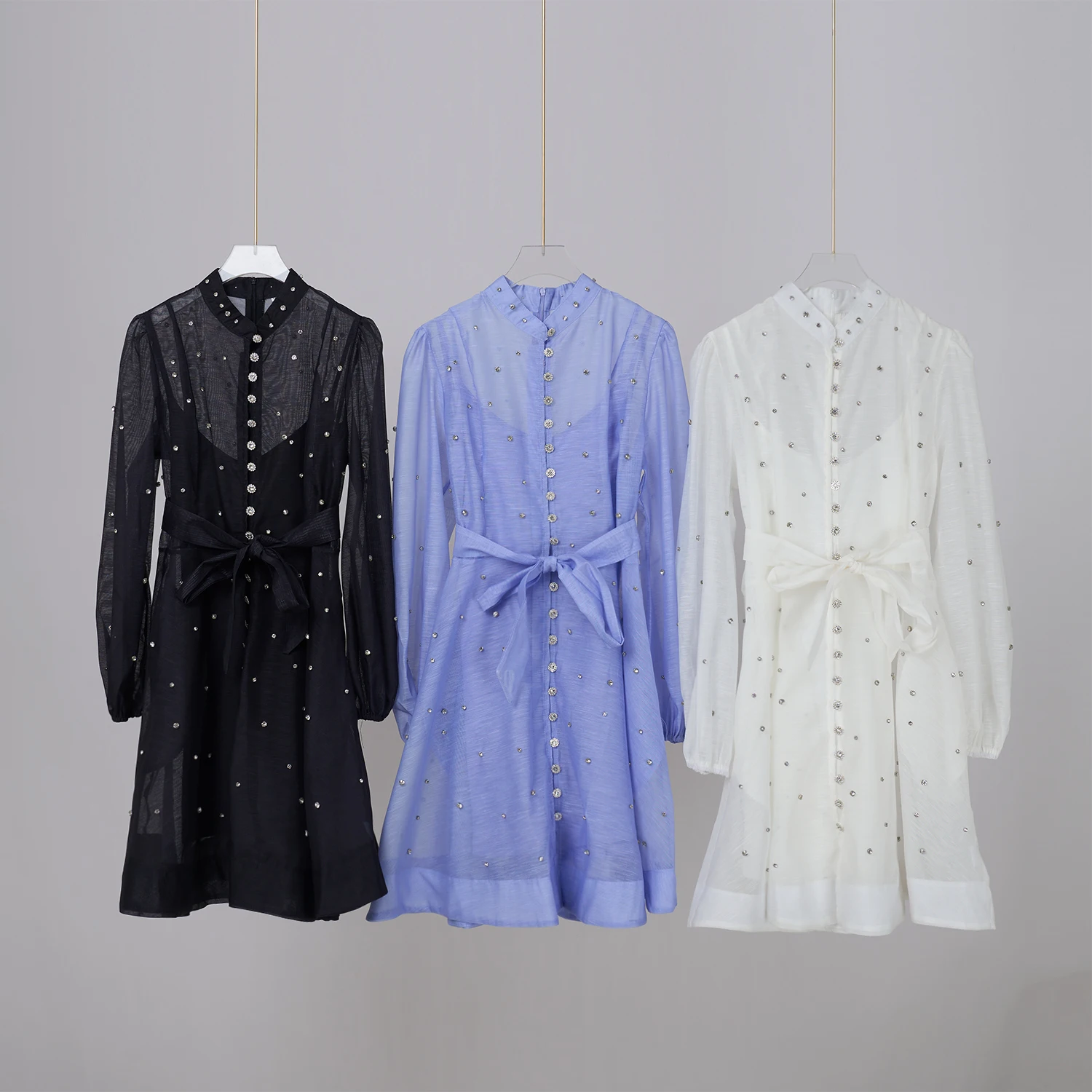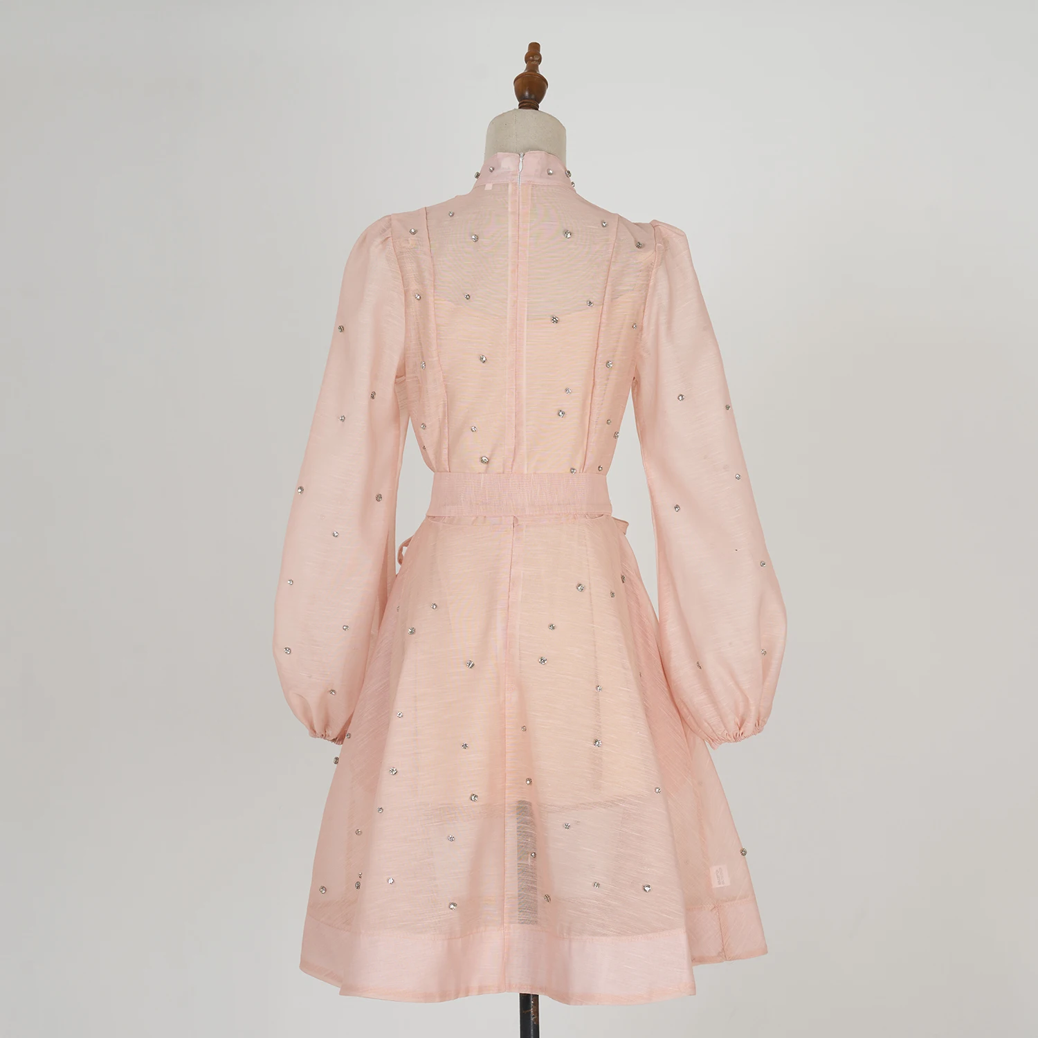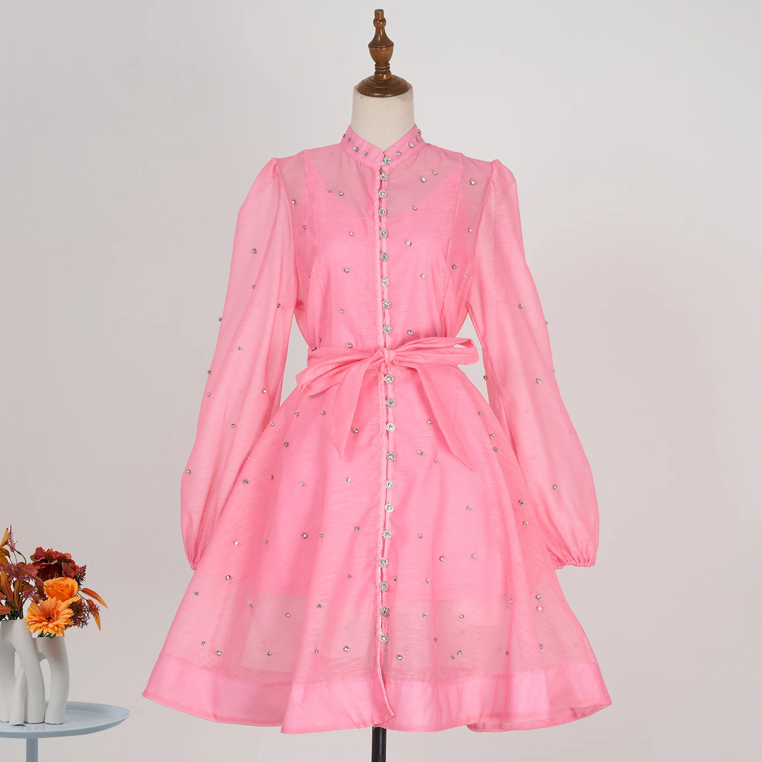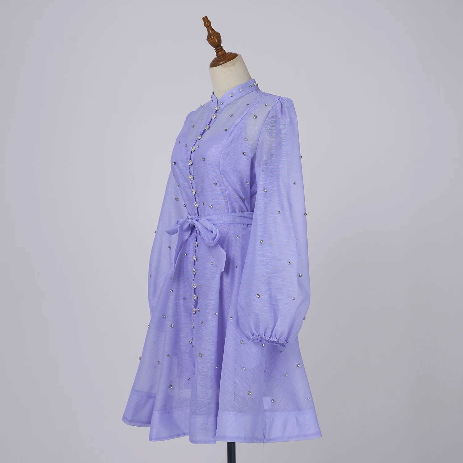 Luxury Crystal Short Dresses Women Summer Studded Diamond Stand Collar Lantern Sleeve 2025 Sping Loose Evening Party Vestidos
