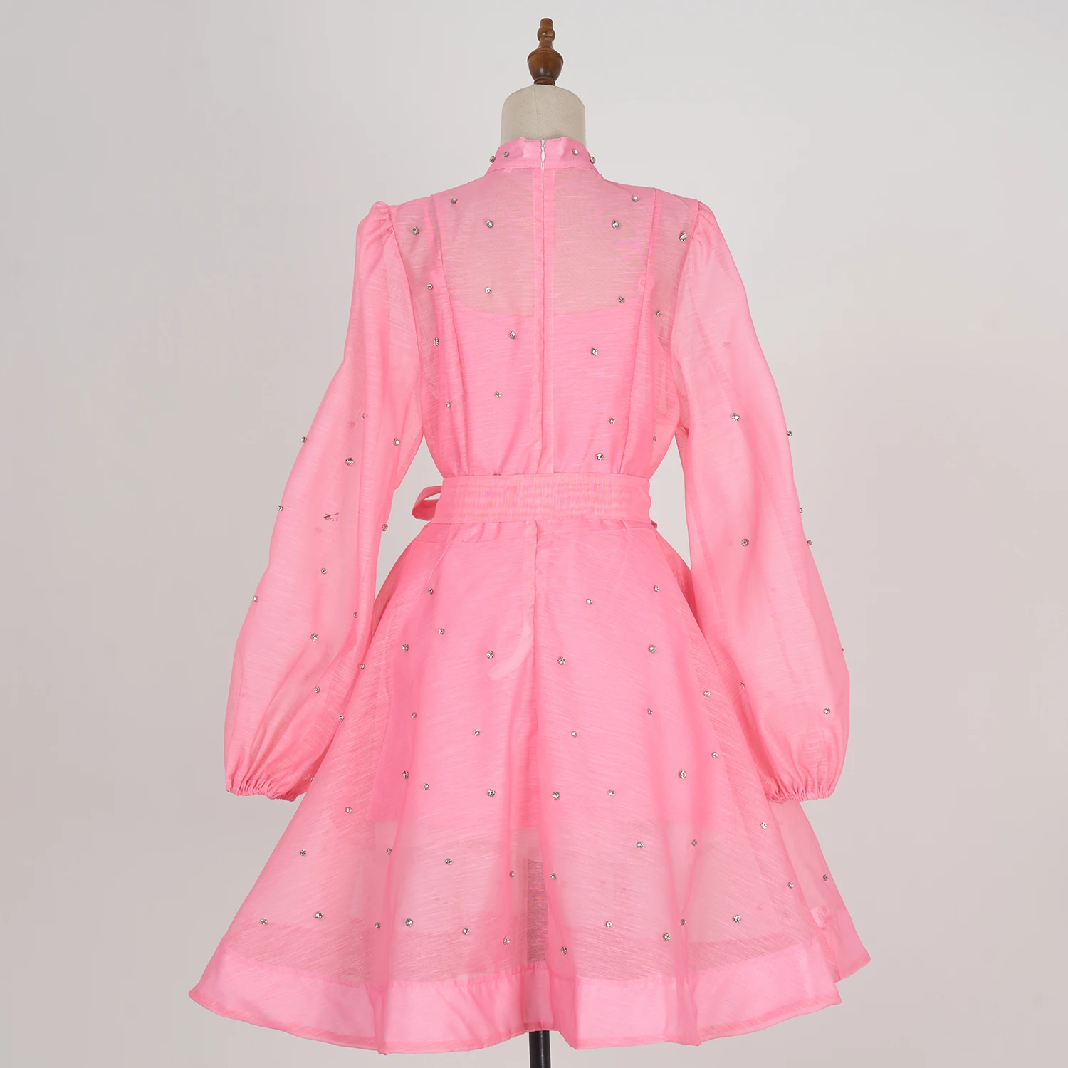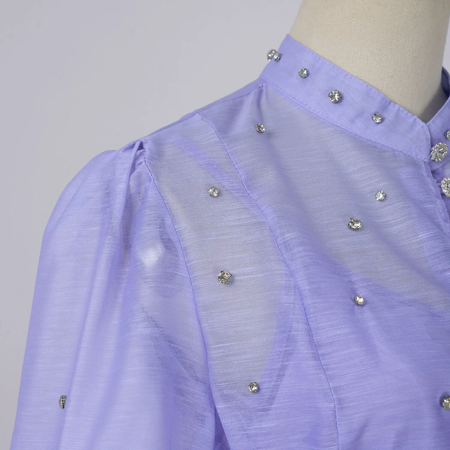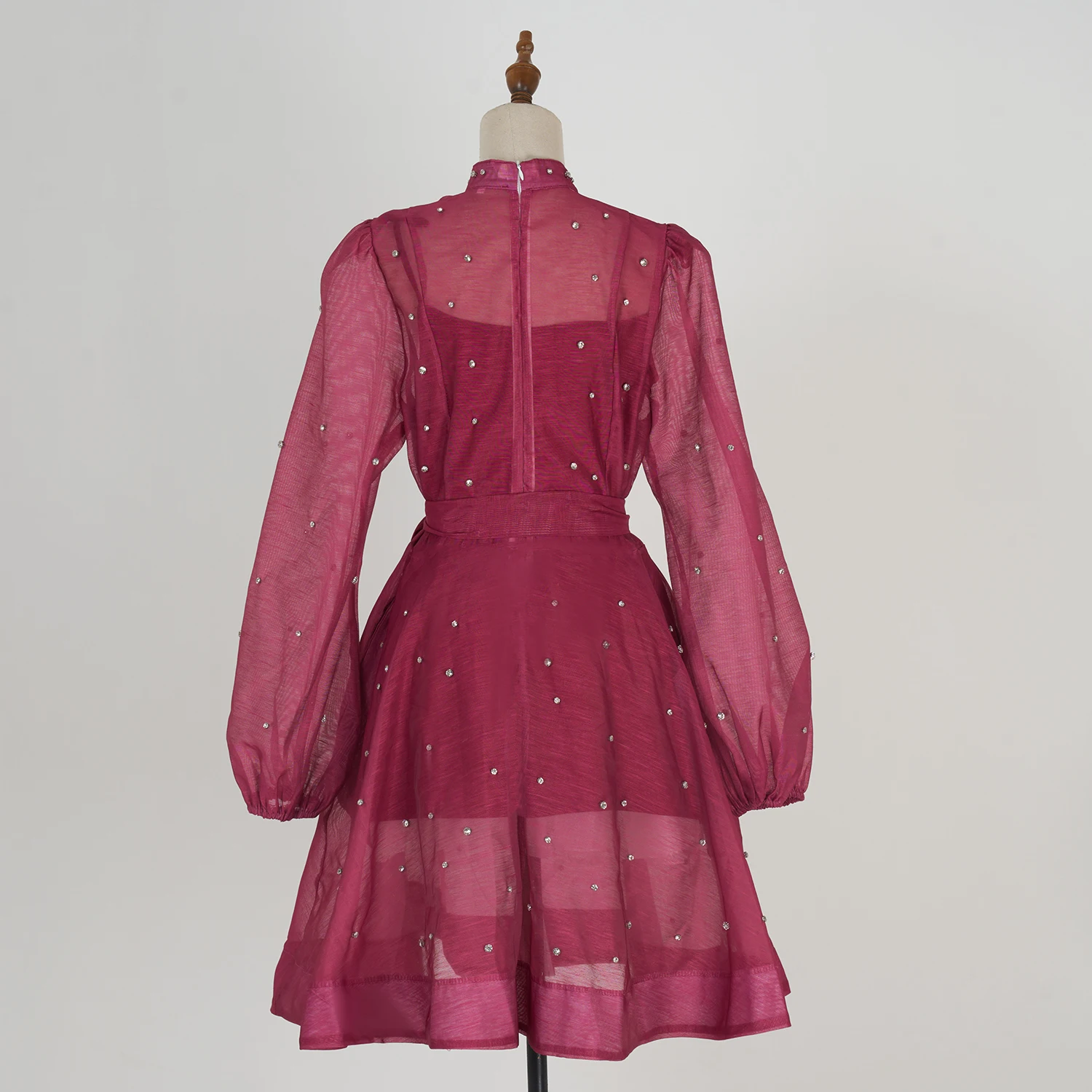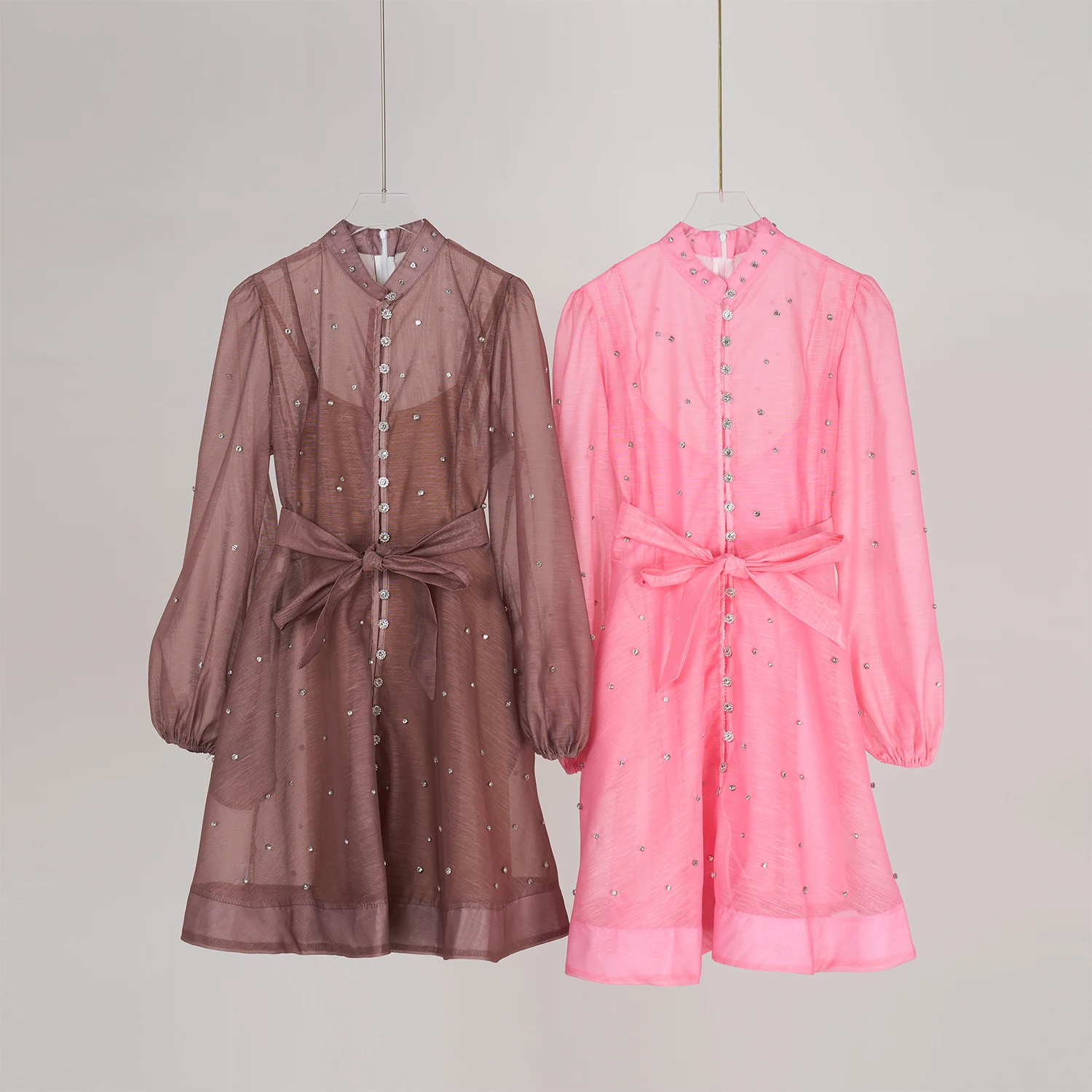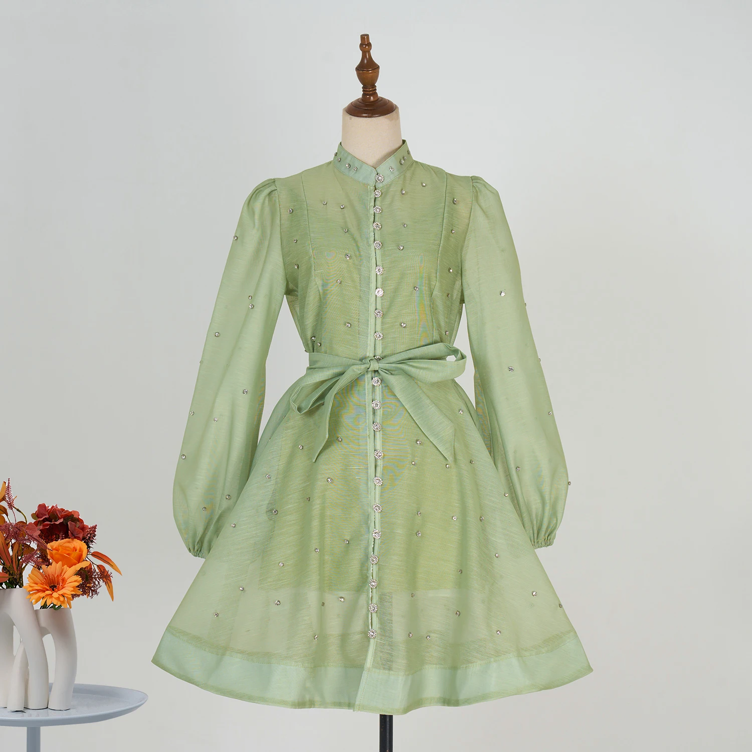 Luxury Crystal Short Dresses Women Summer Studded Diamond Stand Collar Lantern Sleeve 2025 Sping Loose Evening Party Vestidos