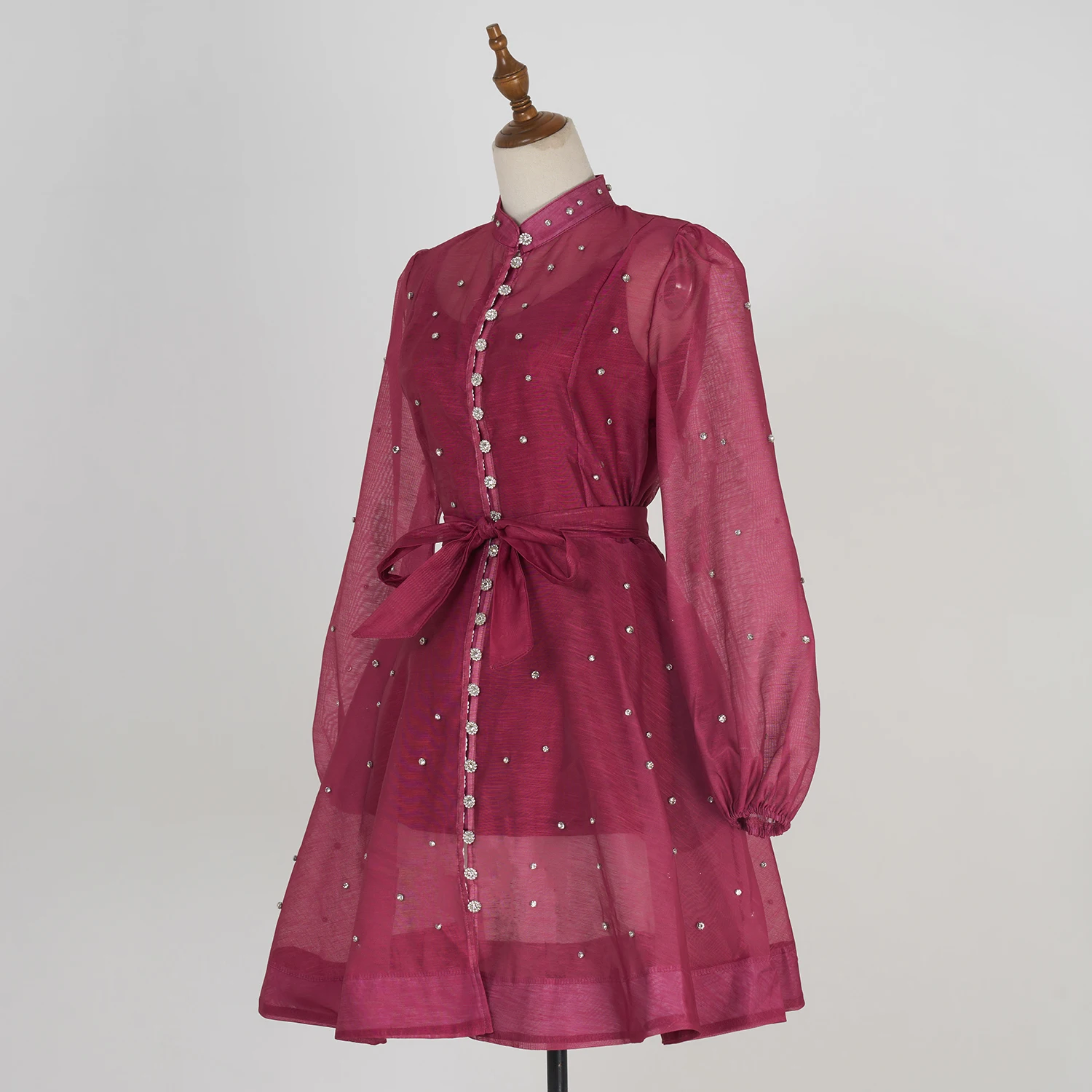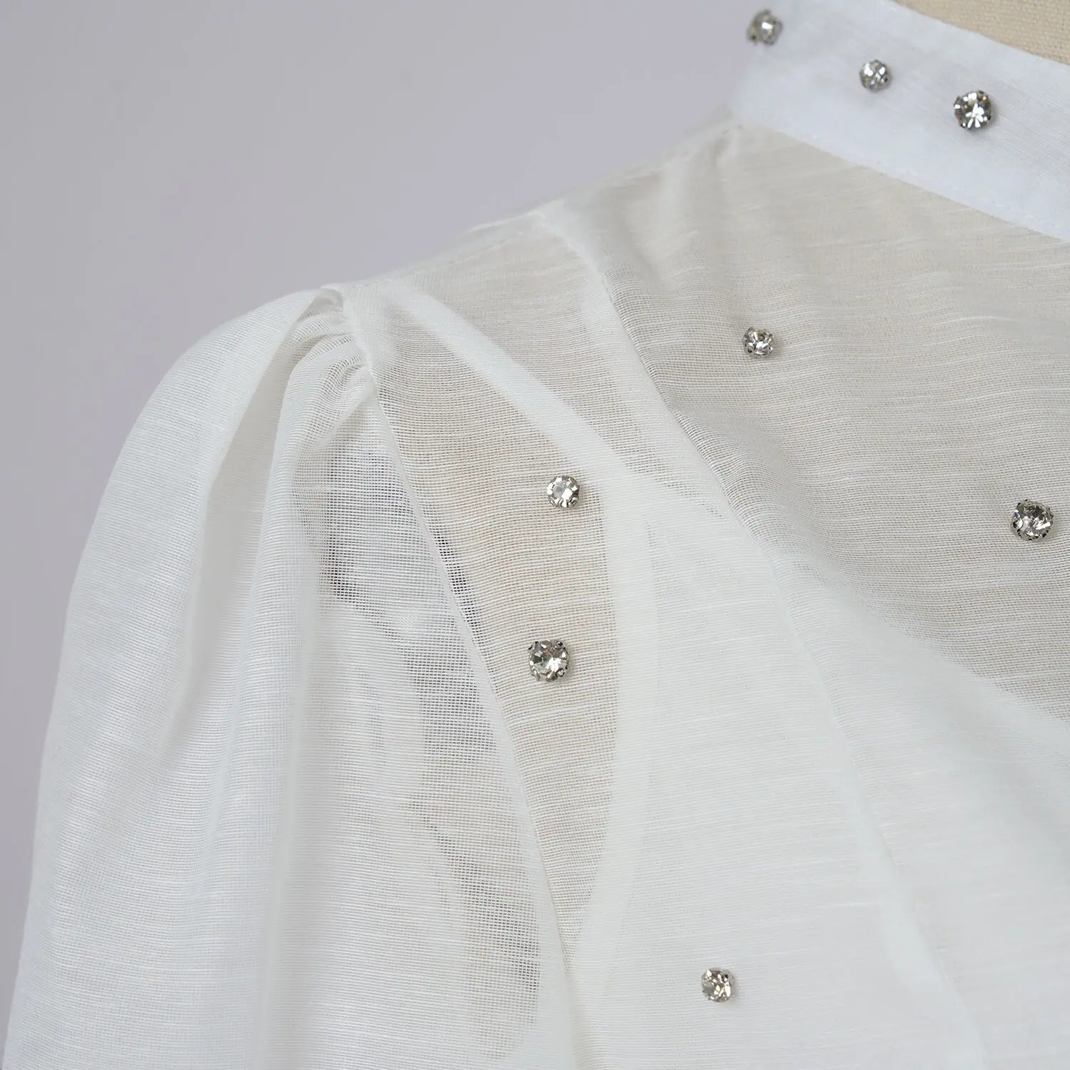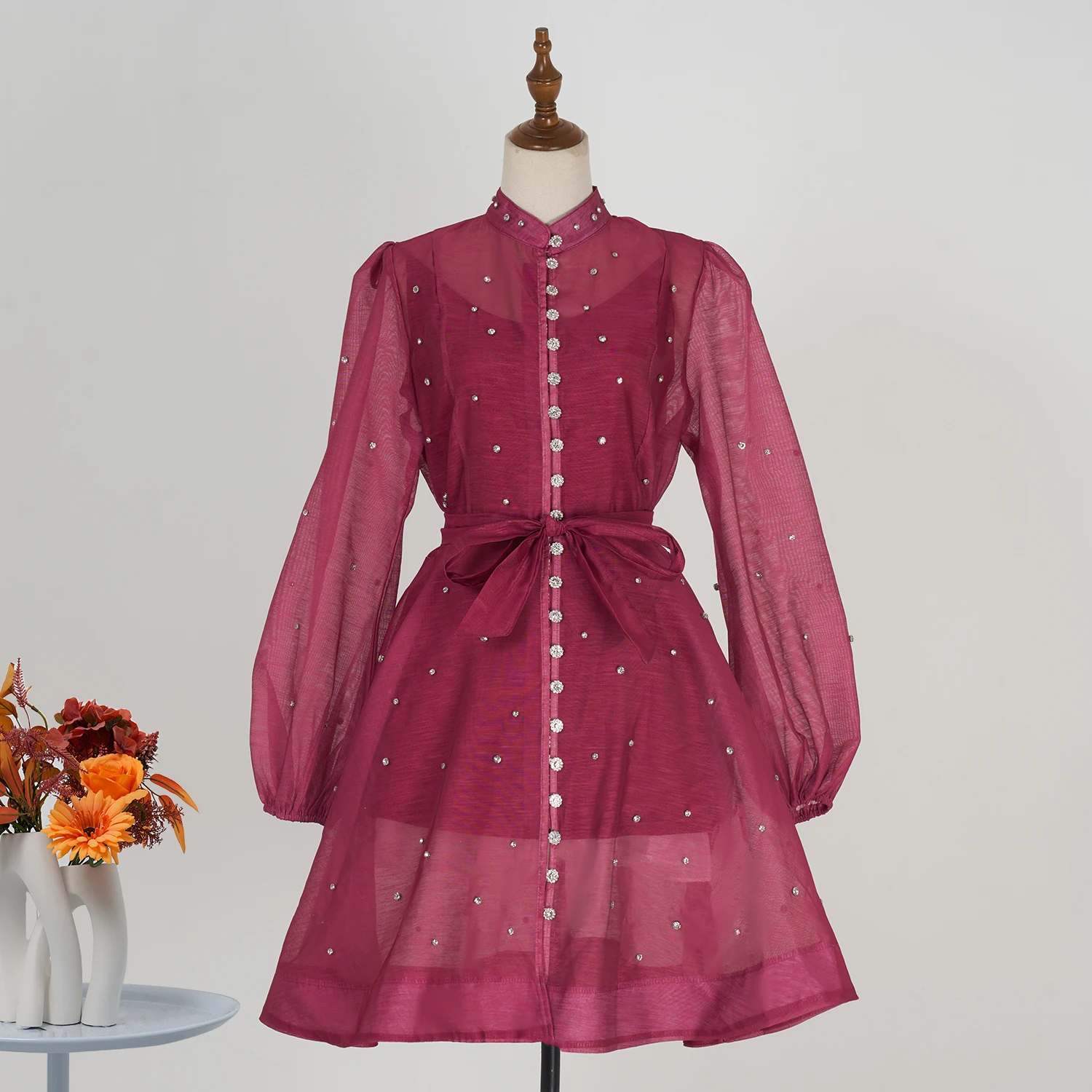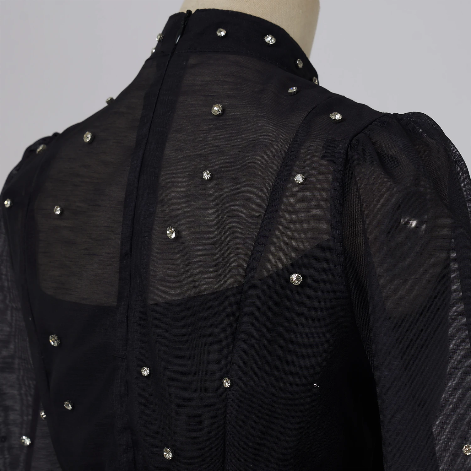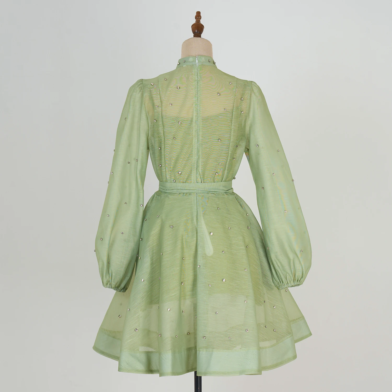 Luxury Crystal Short Dresses Women Summer Studded Diamond Stand Collar Lantern Sleeve 2025 Sping Loose Evening Party Vestidos