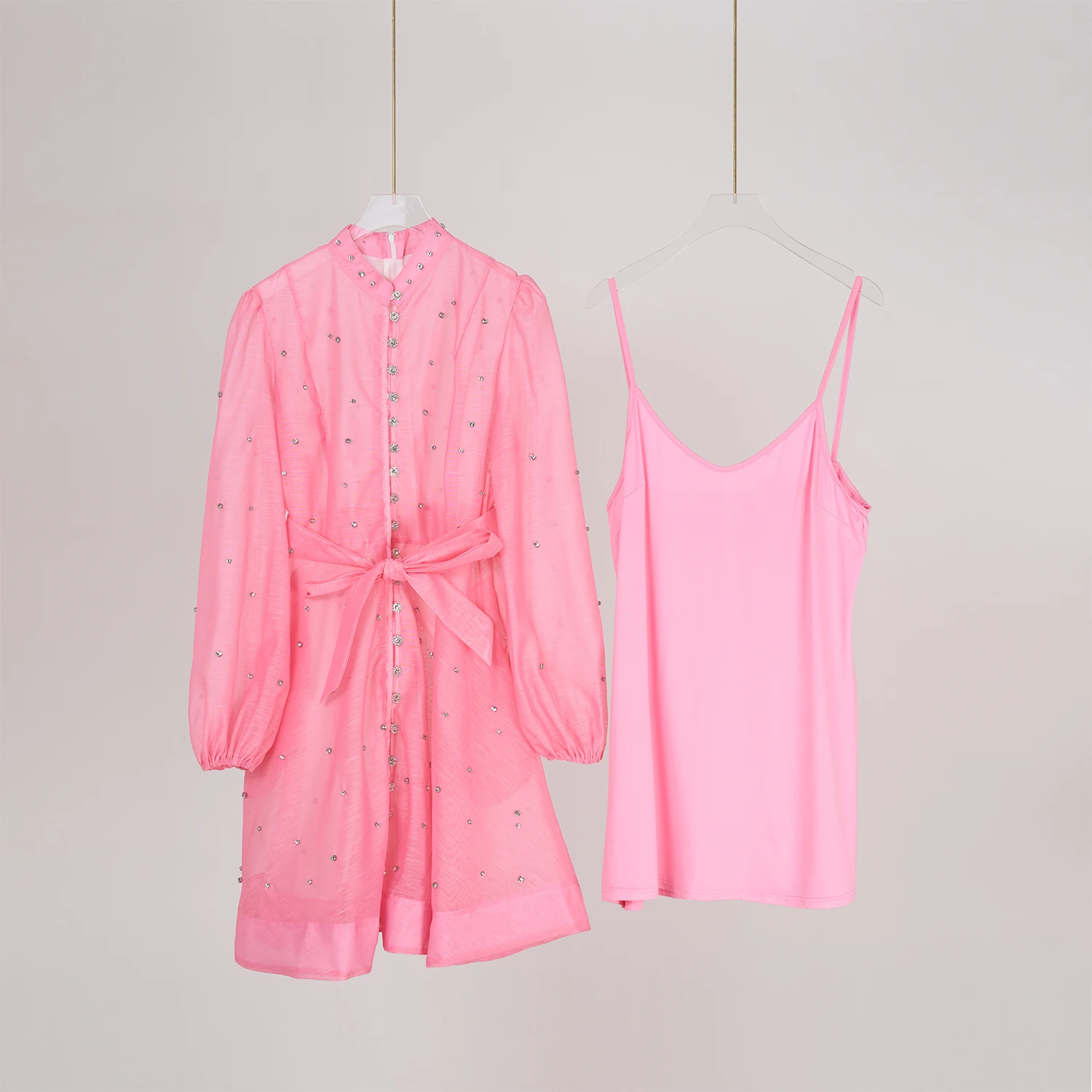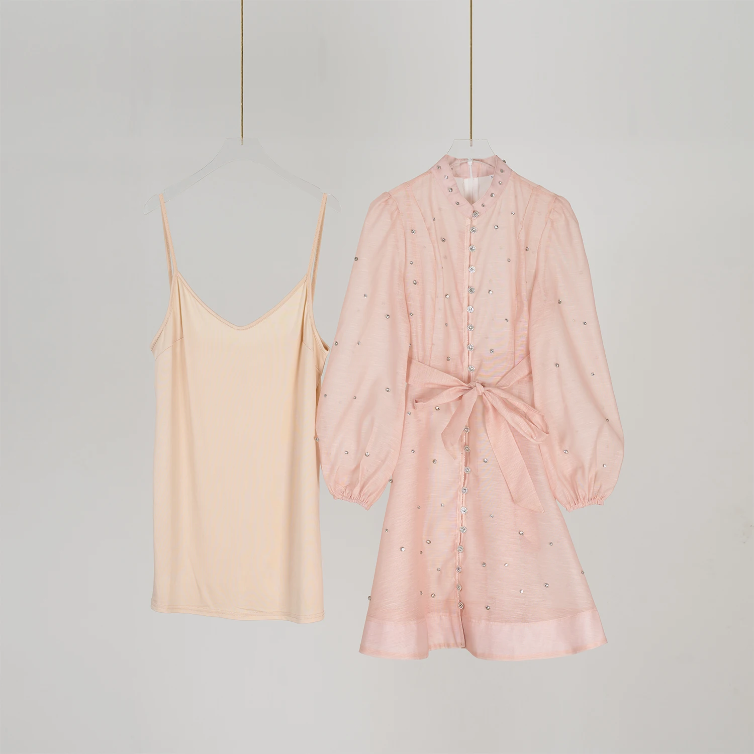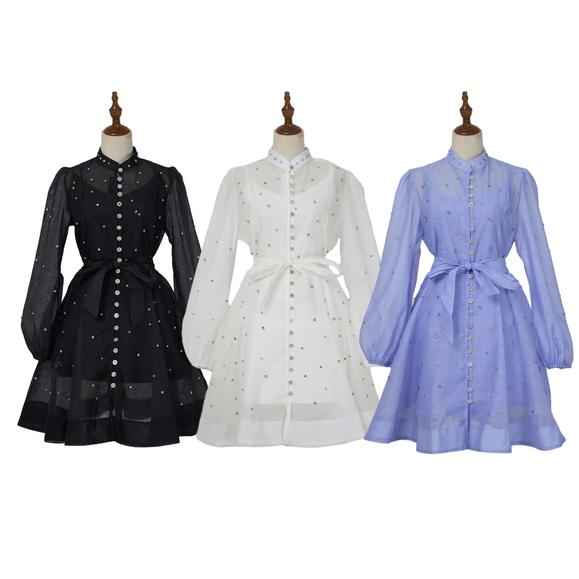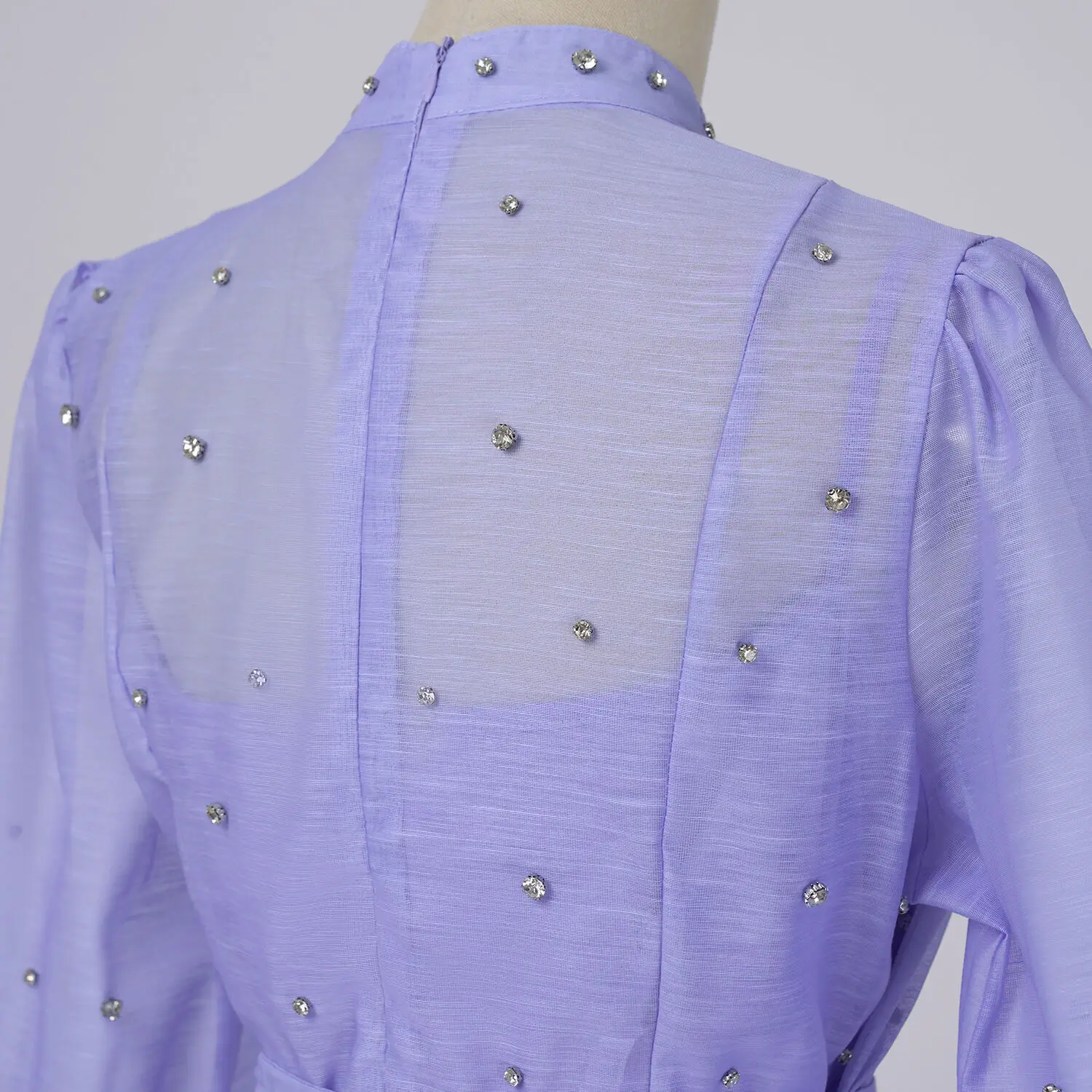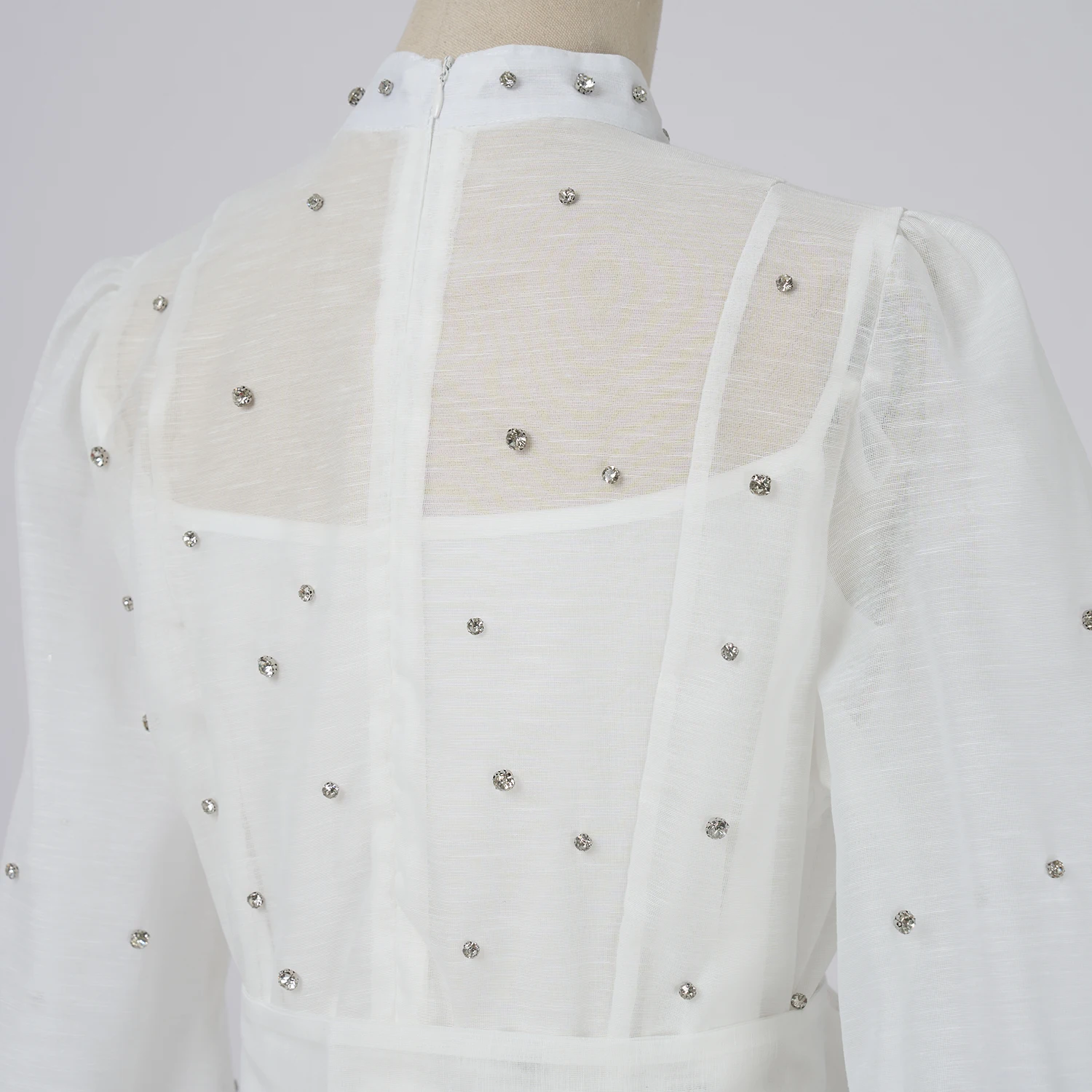 Luxury Crystal Short Dresses Women Summer Studded Diamond Stand Collar Lantern Sleeve 2025 Sping Loose Evening Party Vestidos