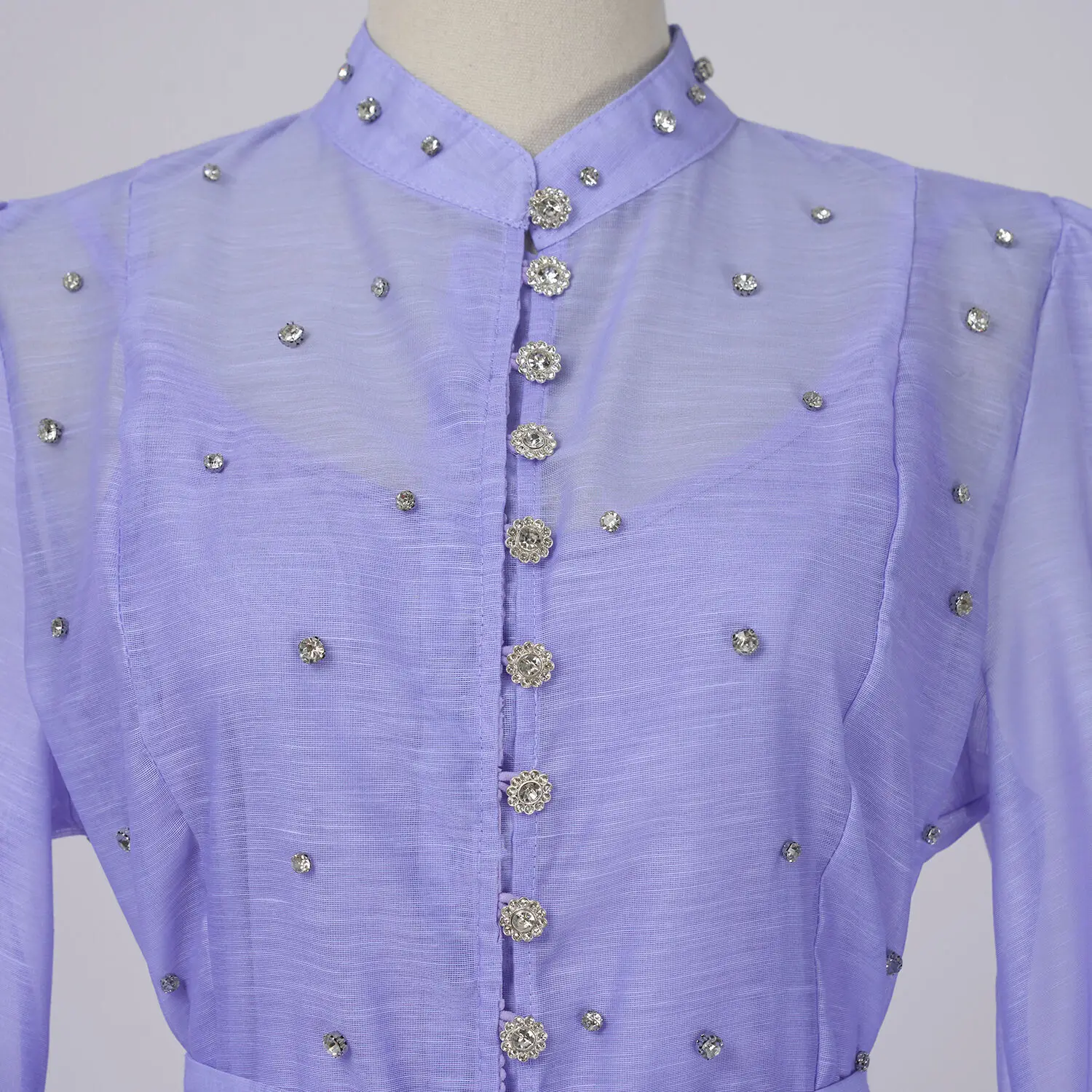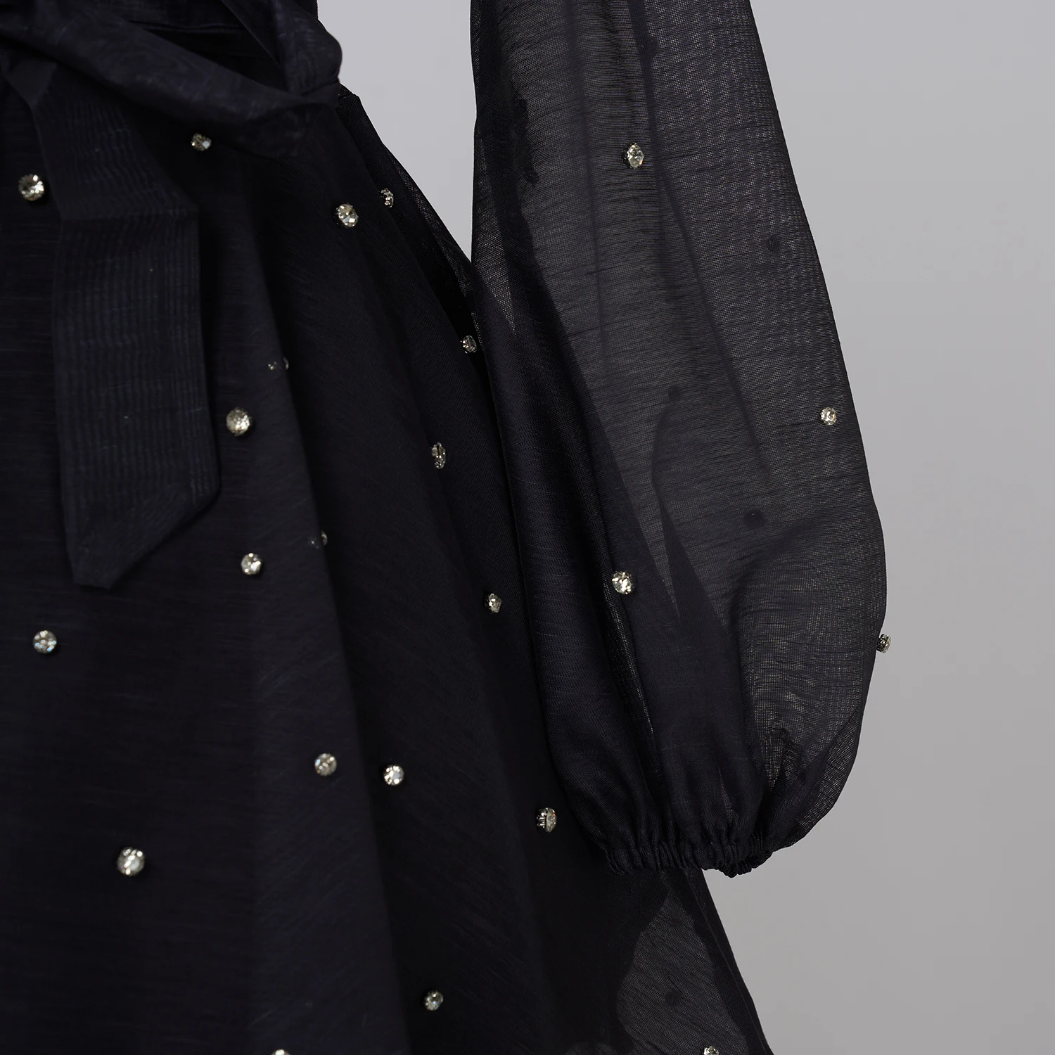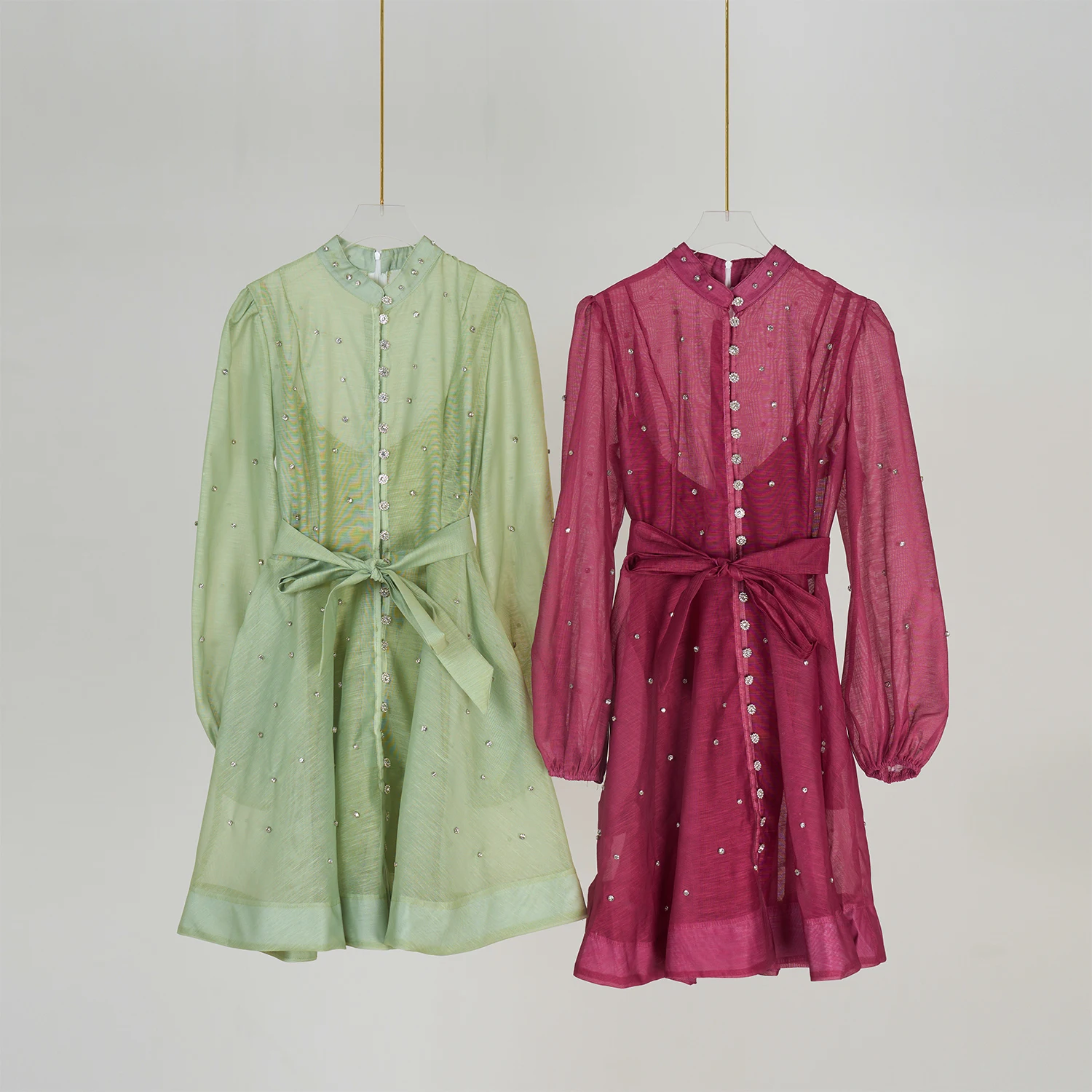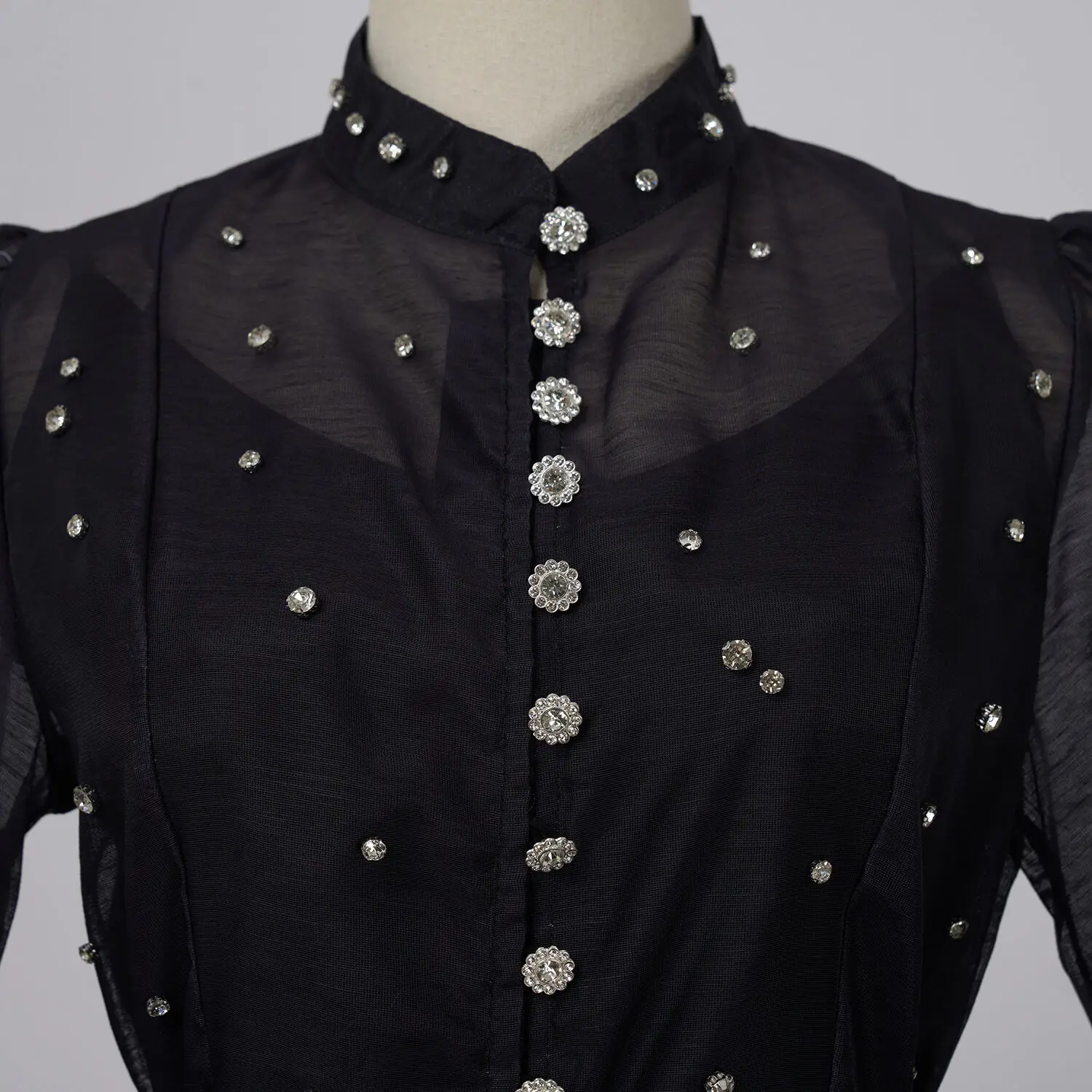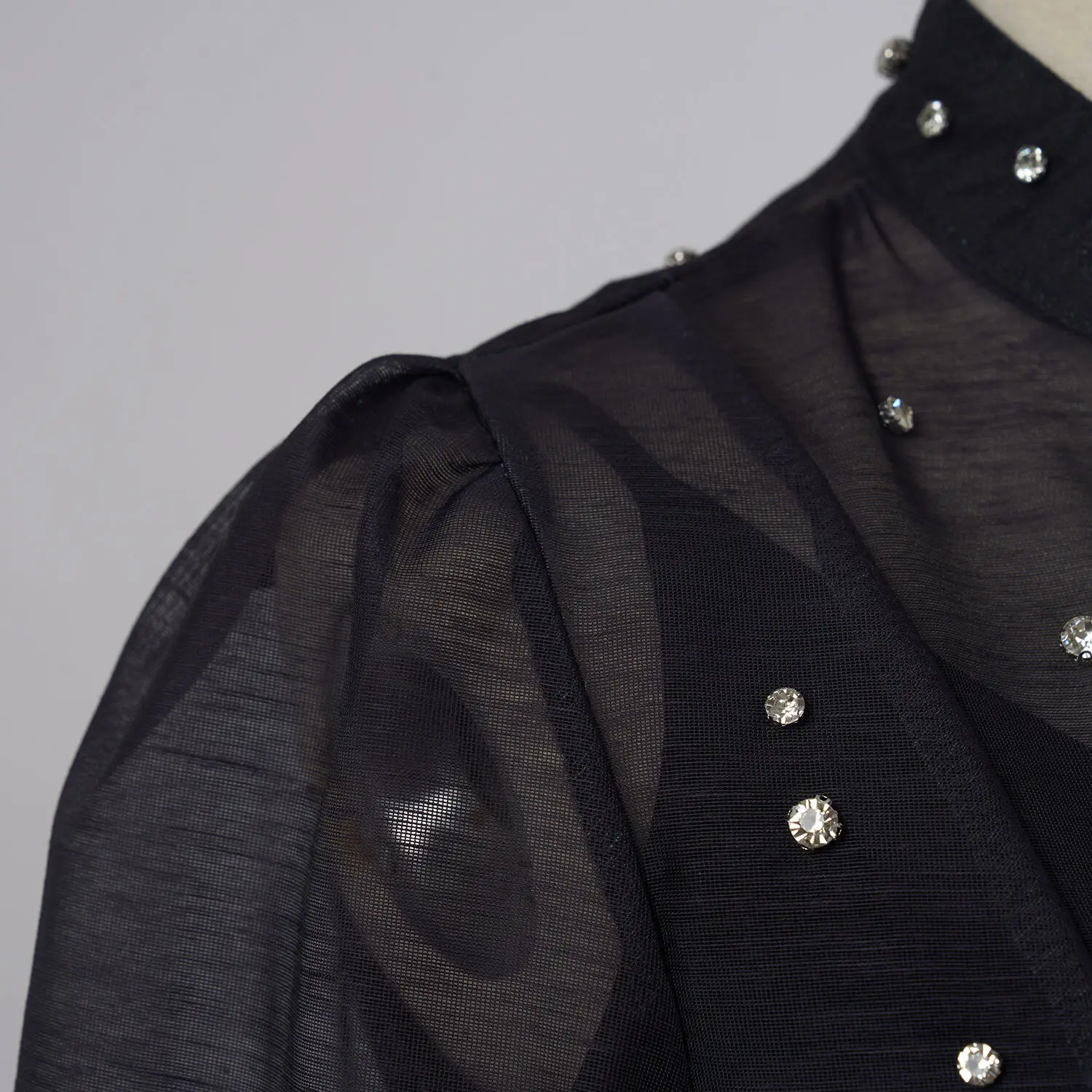 Luxury Crystal Short Dresses Women Summer Studded Diamond Stand Collar Lantern Sleeve 2025 Sping Loose Evening Party Vestidos