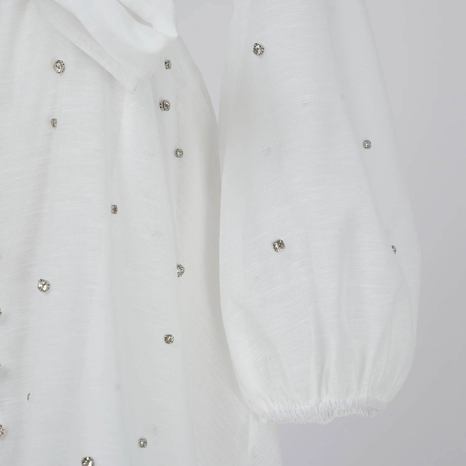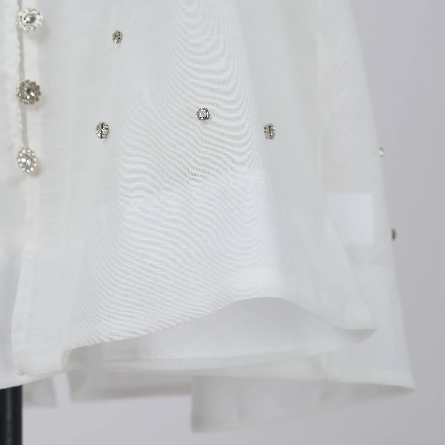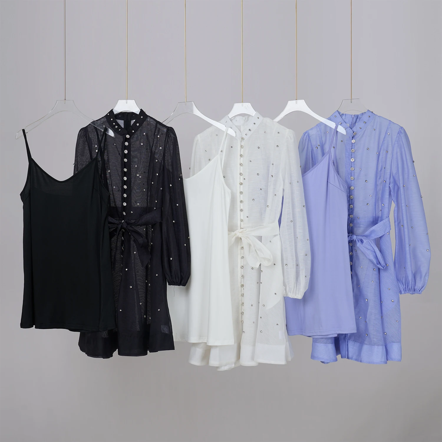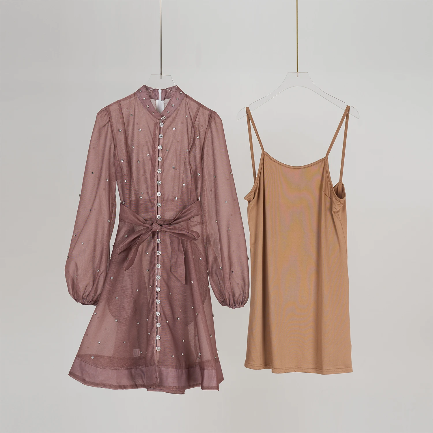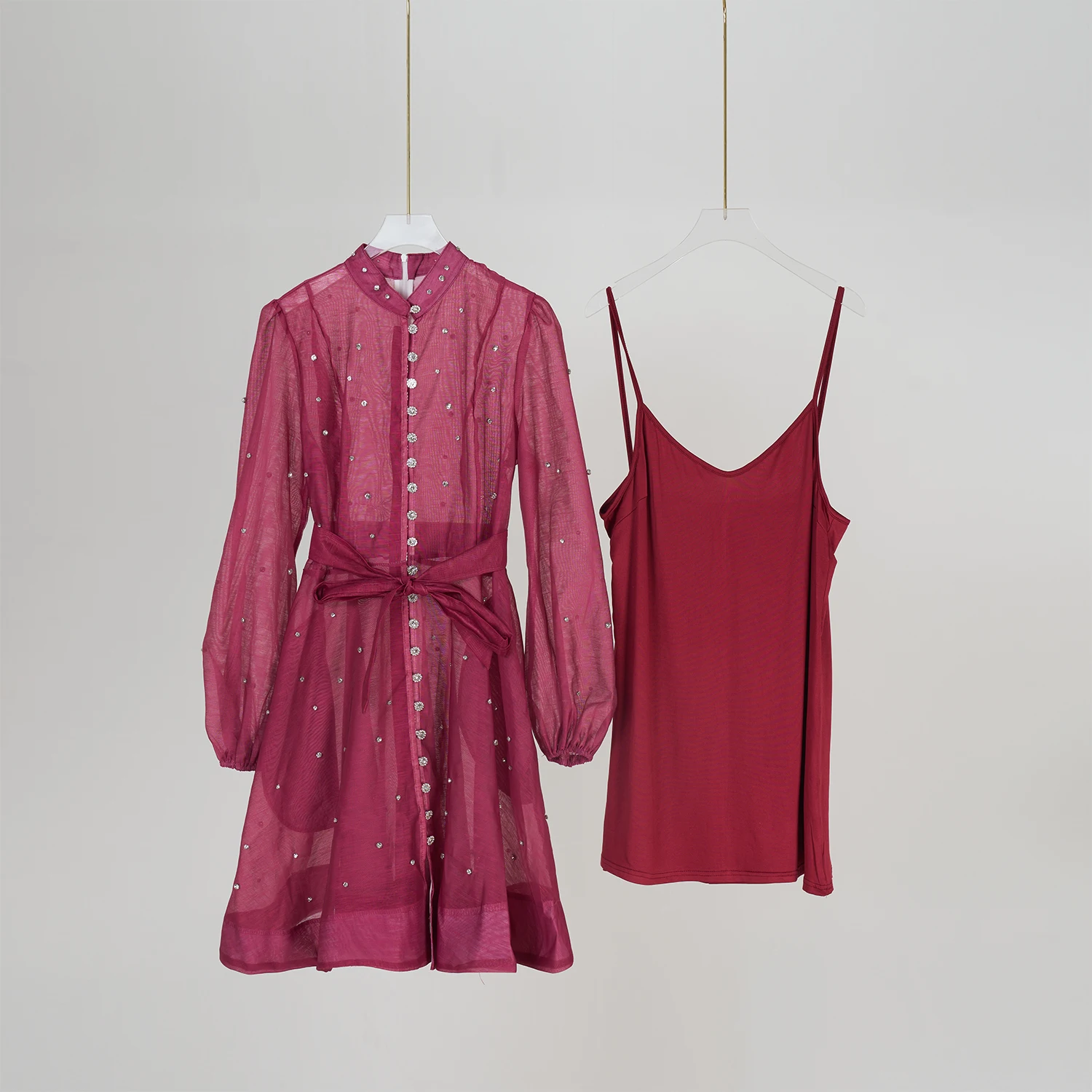 Luxury Crystal Short Dresses Women Summer Studded Diamond Stand Collar Lantern Sleeve 2025 Sping Loose Evening Party Vestidos