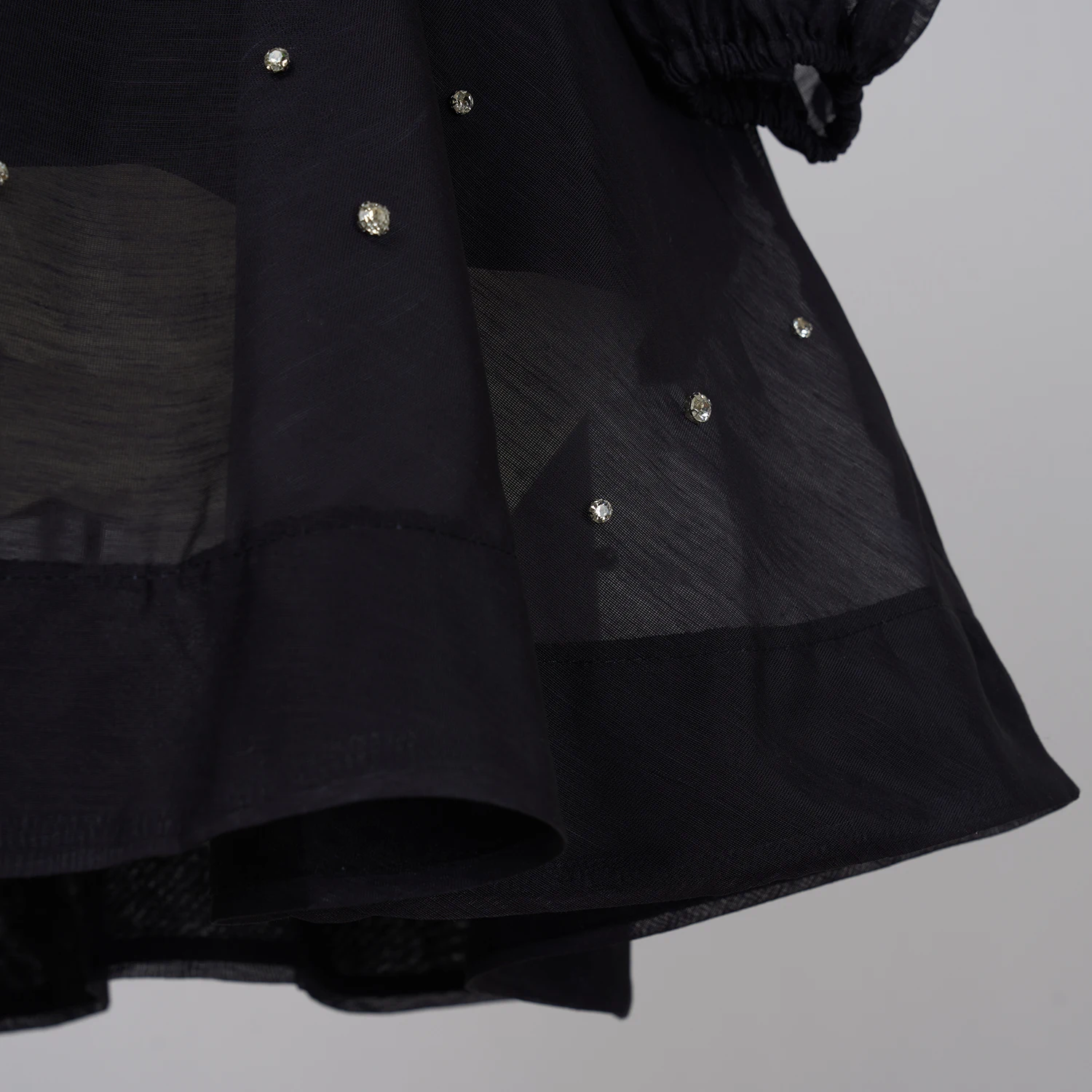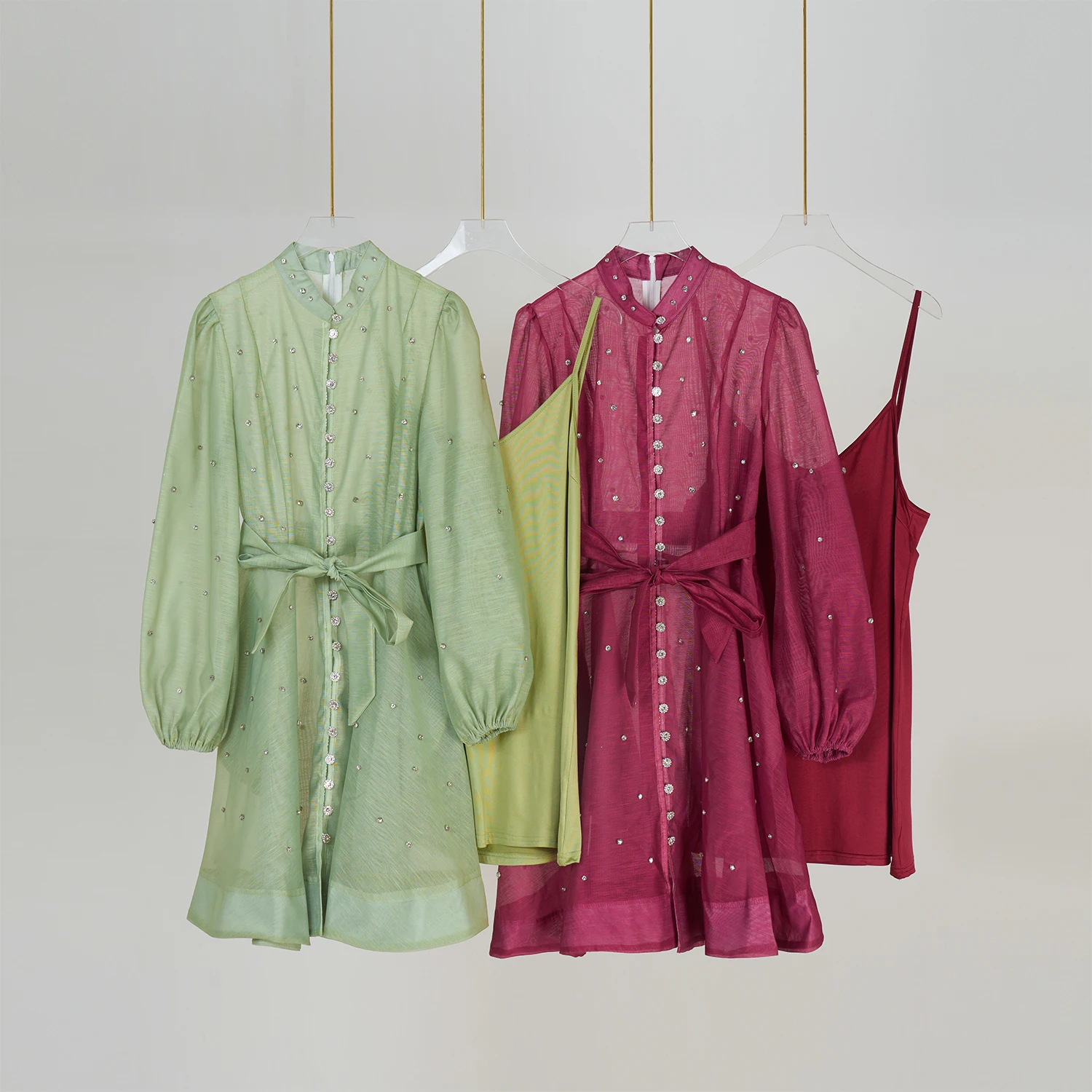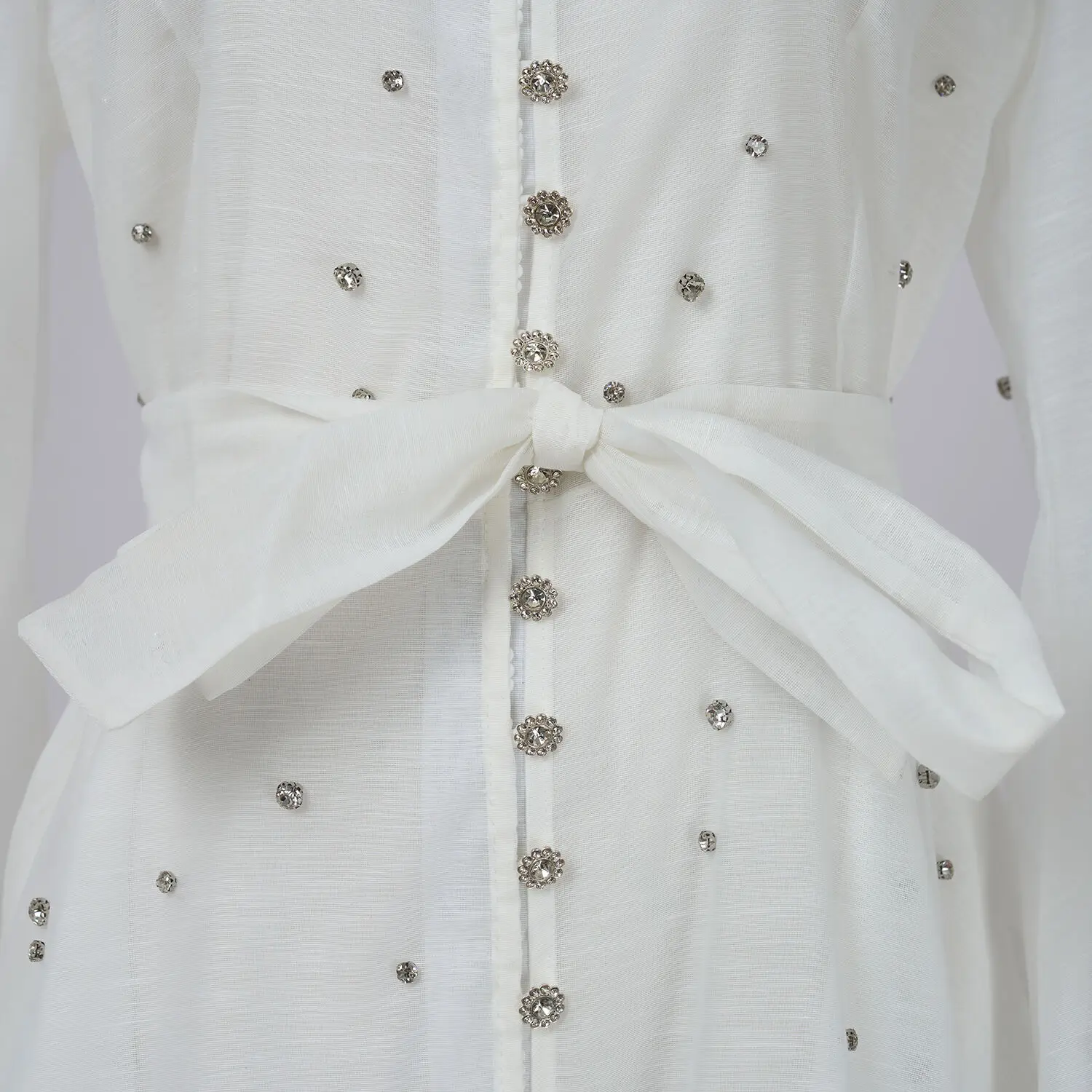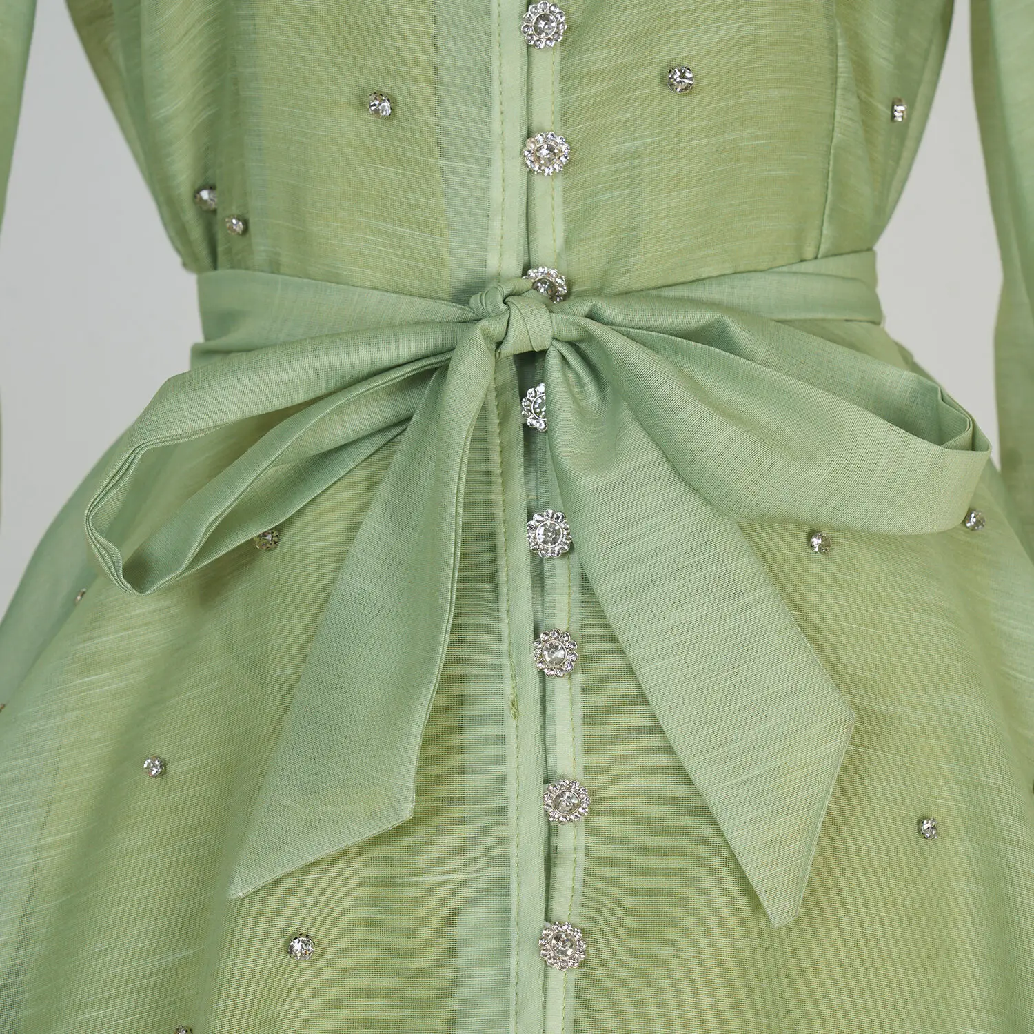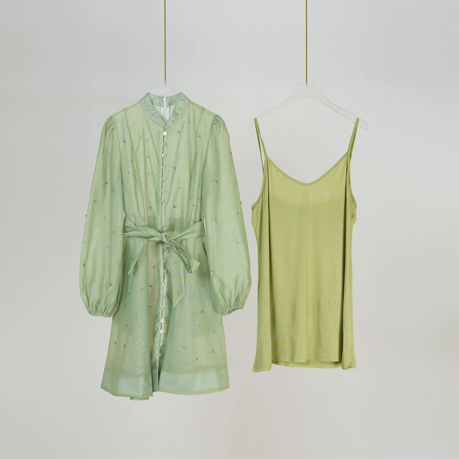 Luxury Crystal Short Dresses Women Summer Studded Diamond Stand Collar Lantern Sleeve 2025 Sping Loose Evening Party Vestidos
