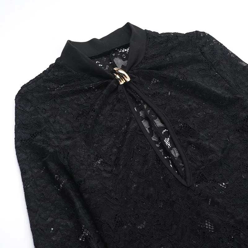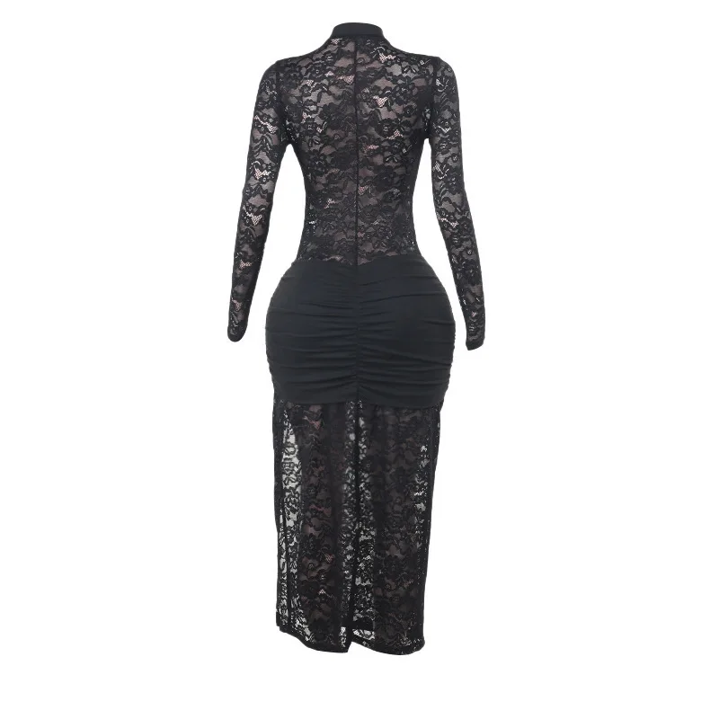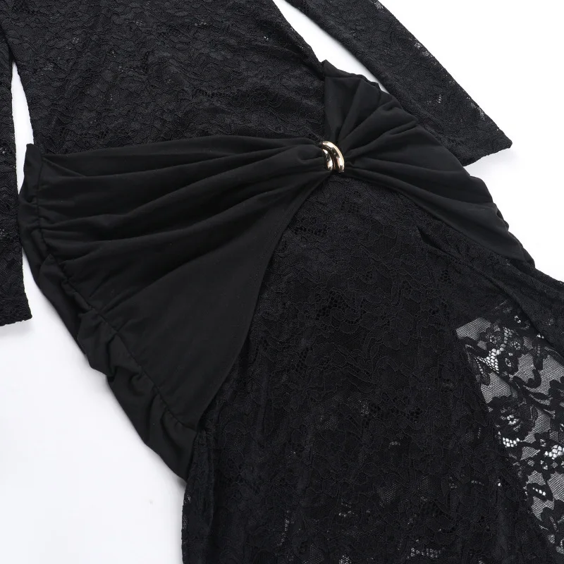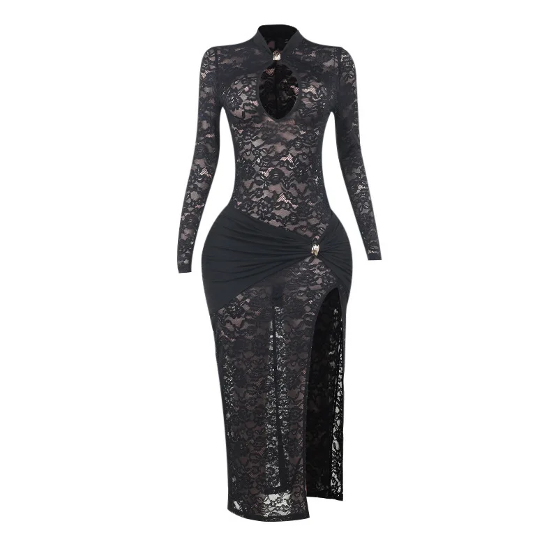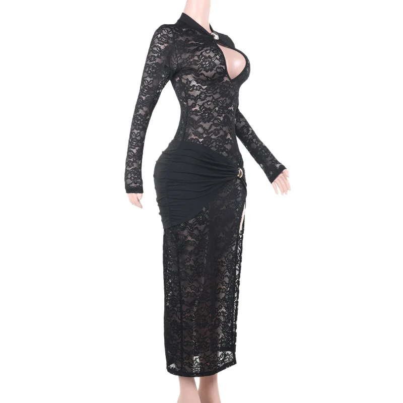 Mozision Lace Hollow Out Sexy Maxi Dress For Women Fashion Long Sleeve Thigh High Split Bodycon Club Evening Long Dress Elegant