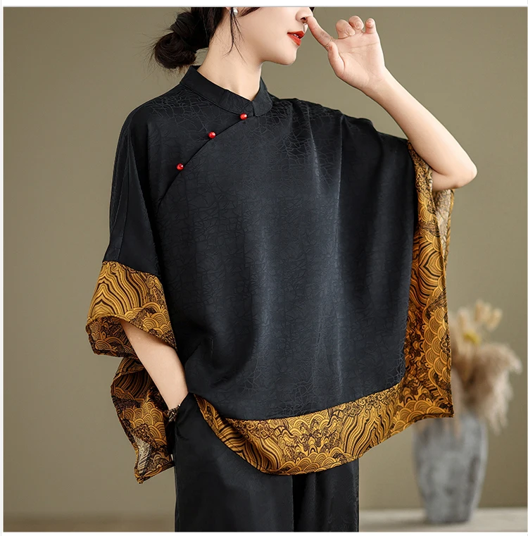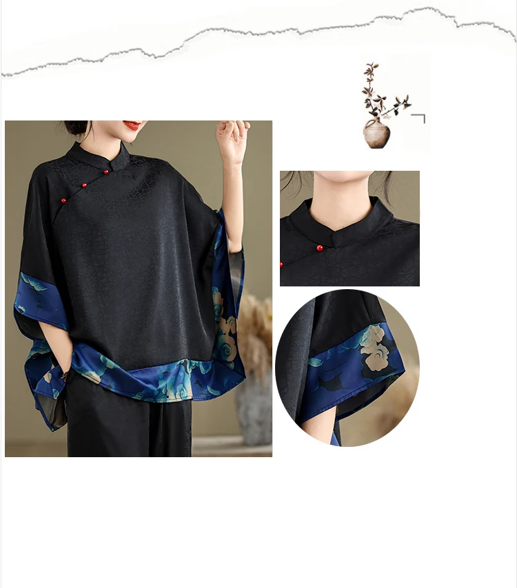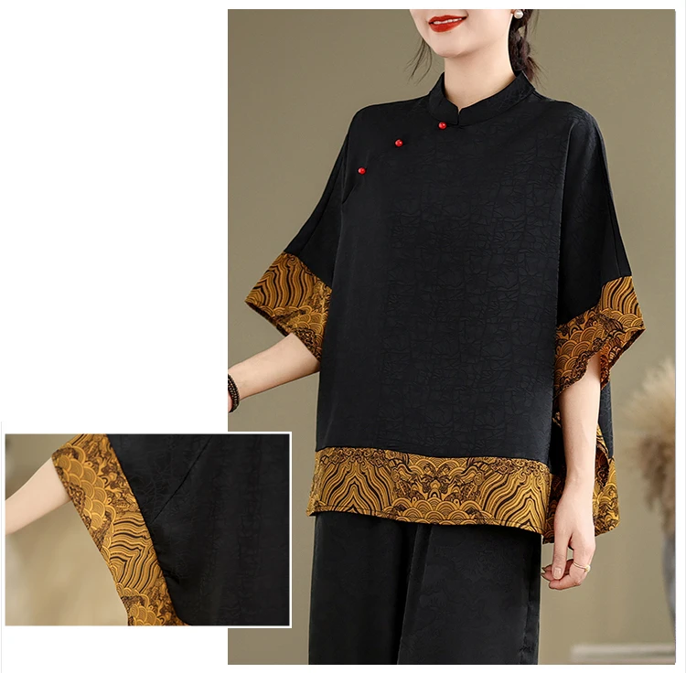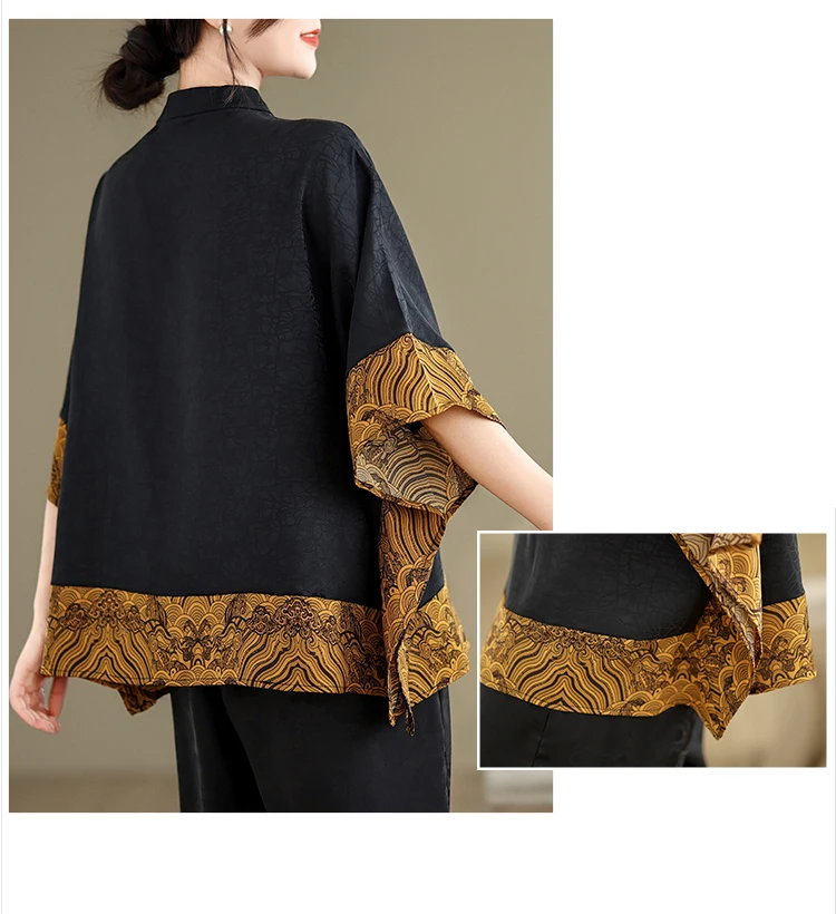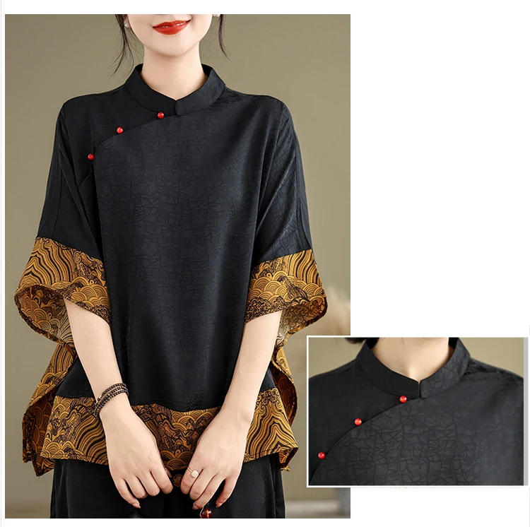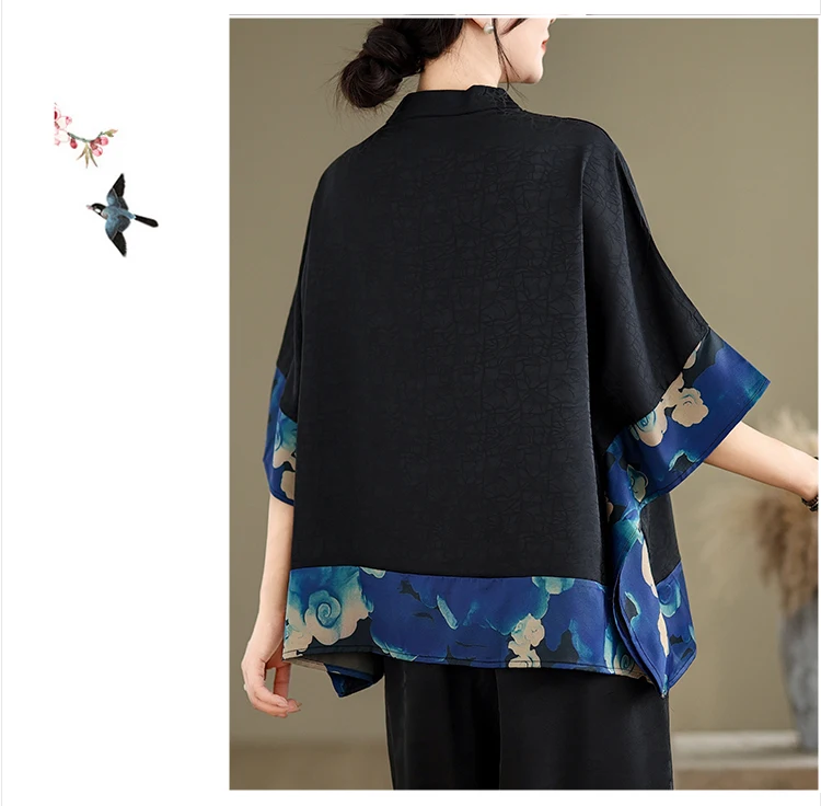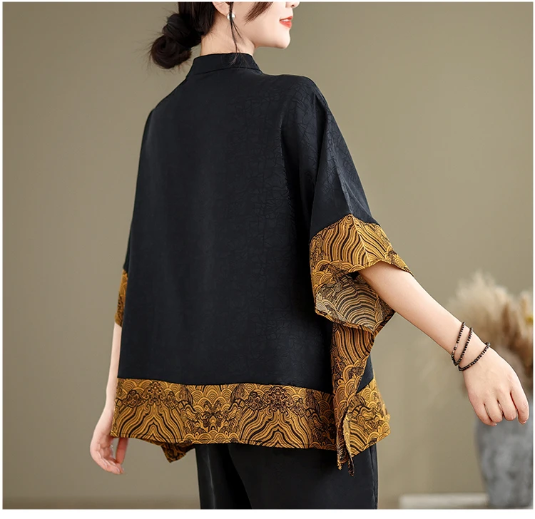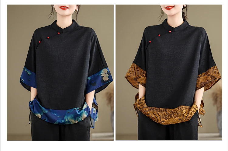 Mulberry Silk Chinese Style T-shirt for Women Spring Summer Fashion Vintage Patchwork Half Sleeve Cloud Embroidery Female Blouse
