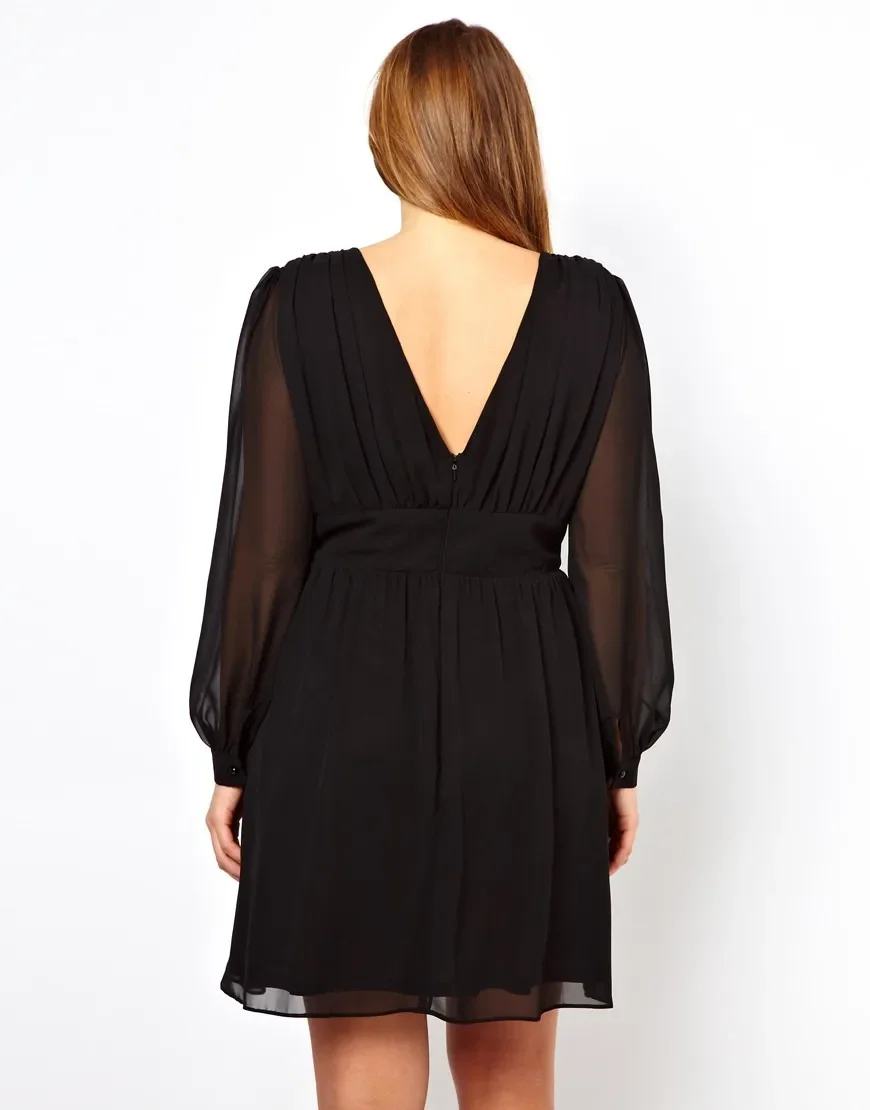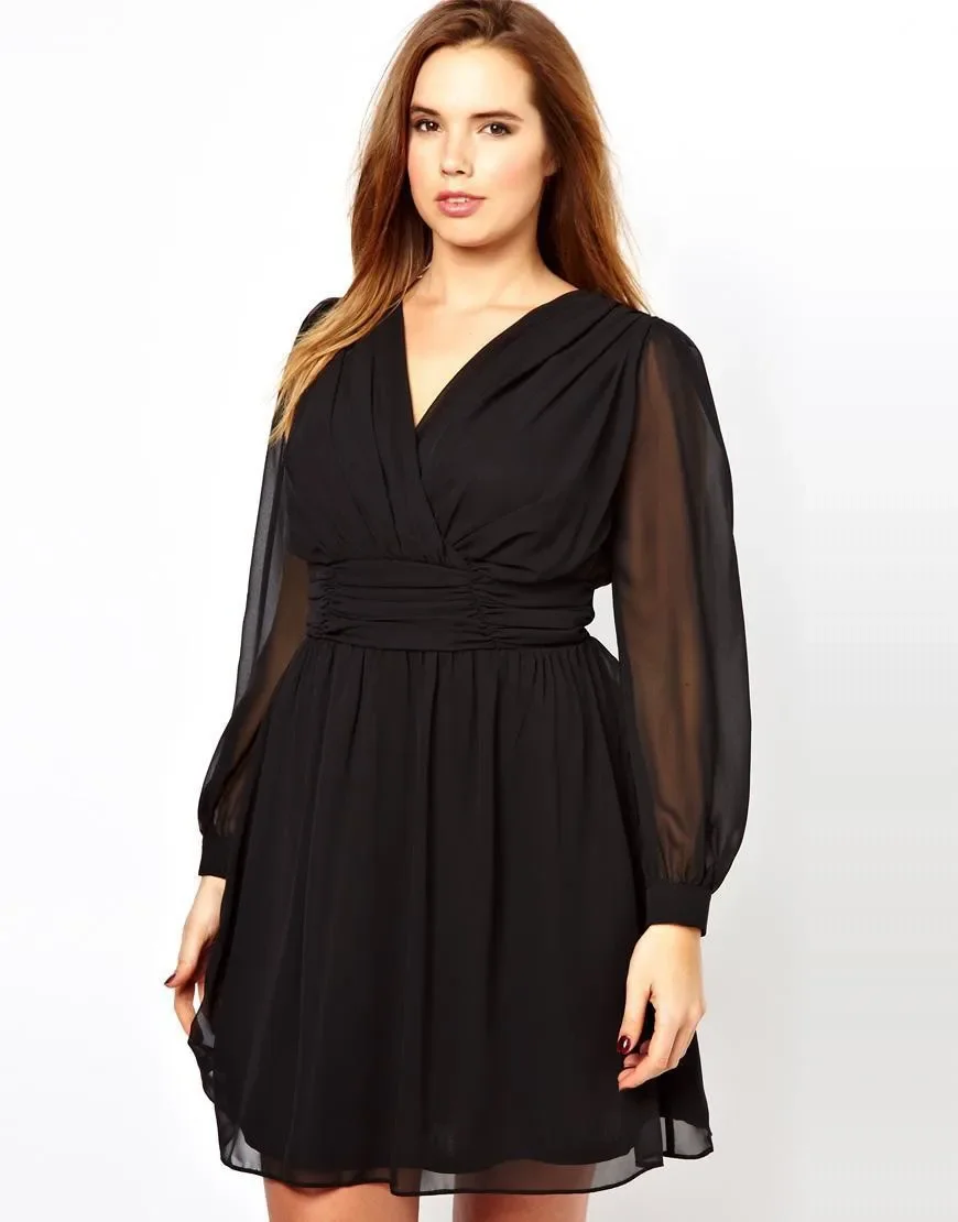 Plus Size Long Lantern Sleeve Chiffon Party Dress Women Sexy V-neck Spring Knee Length Black Elegant Fashion A-line Wrap Dress