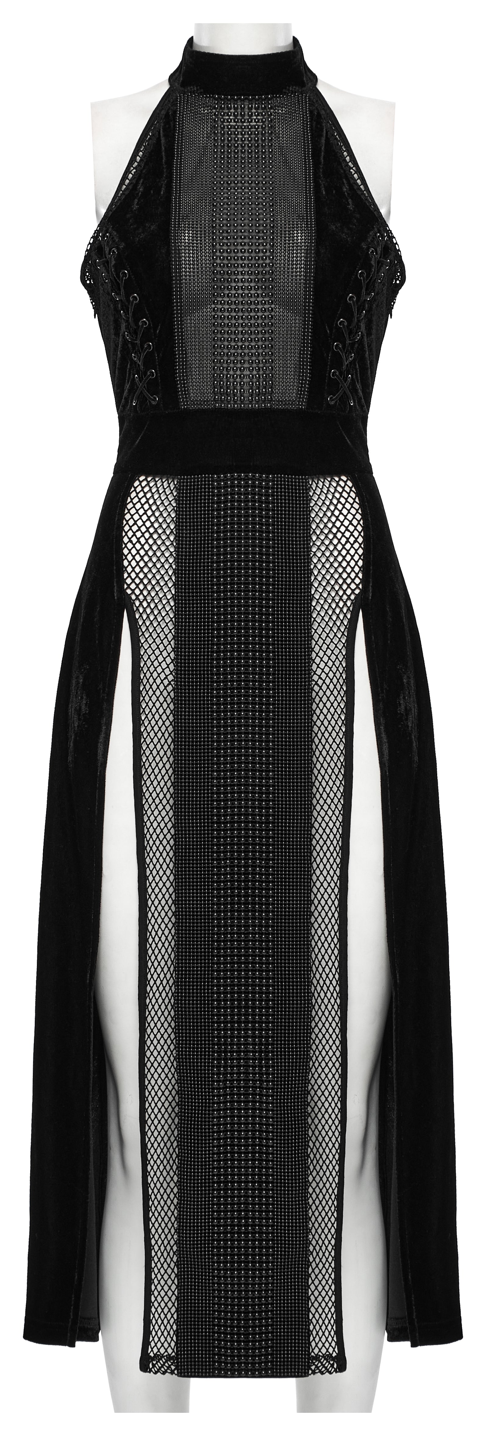 Turn heads at any dark soirée with the Punk Rave Selene Velvet Mesh High Slit Goth Dress – Black. This striking gown is crafted from high-quality elastic velvet and sheer mesh for a luxurious yet daring effect. The halter neck design creates a sleek, minimalist silhouette, while the front showcases intricate bead decorations for an eye-catching focal point. A sheer mesh centre panel and daring thigh-high slit bring a seductive edge, while the corset-style lace-up back ensures a perfect fit. Perfect for gothic glamour, alternative events, and dramatic evening wear.