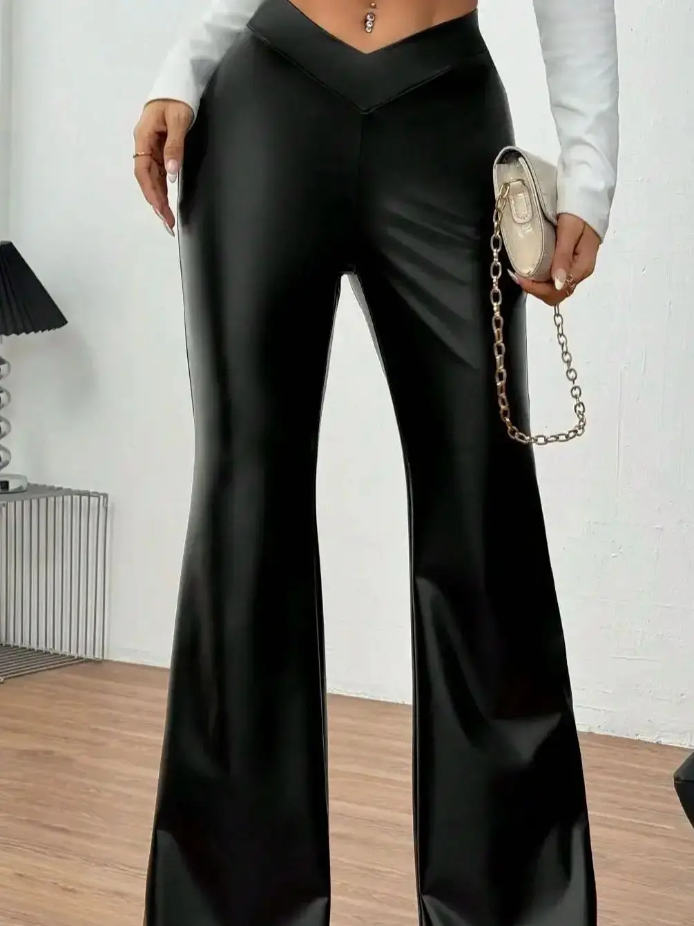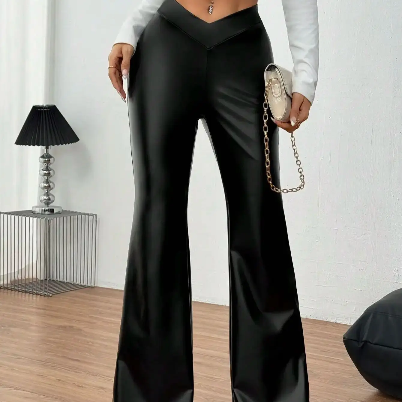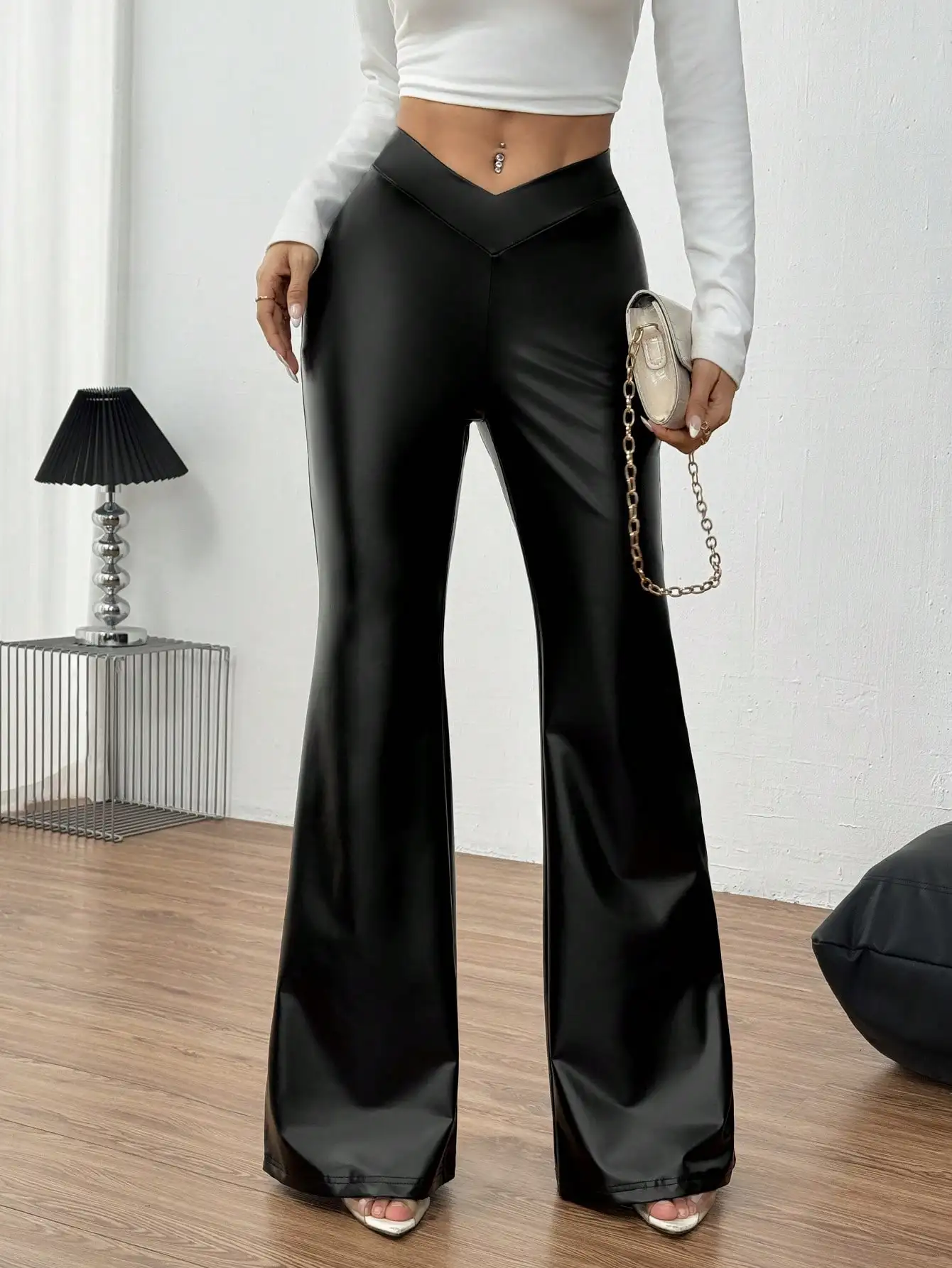 Sexy V-waist invisible zipper horn pants leg shot PU black autumn/winter women's pants