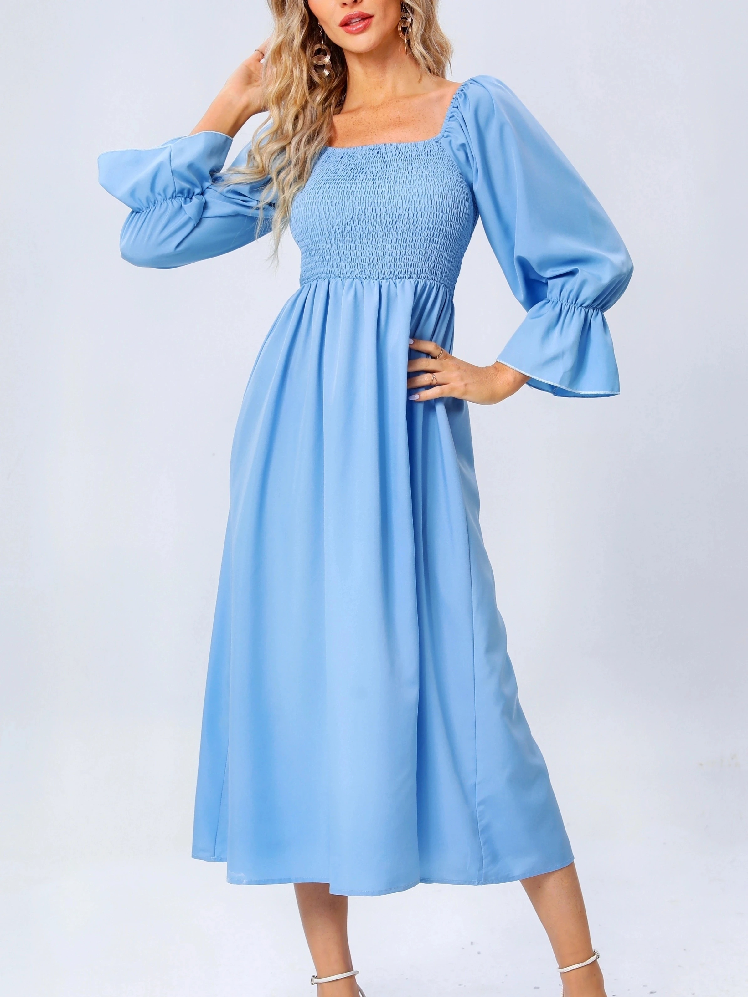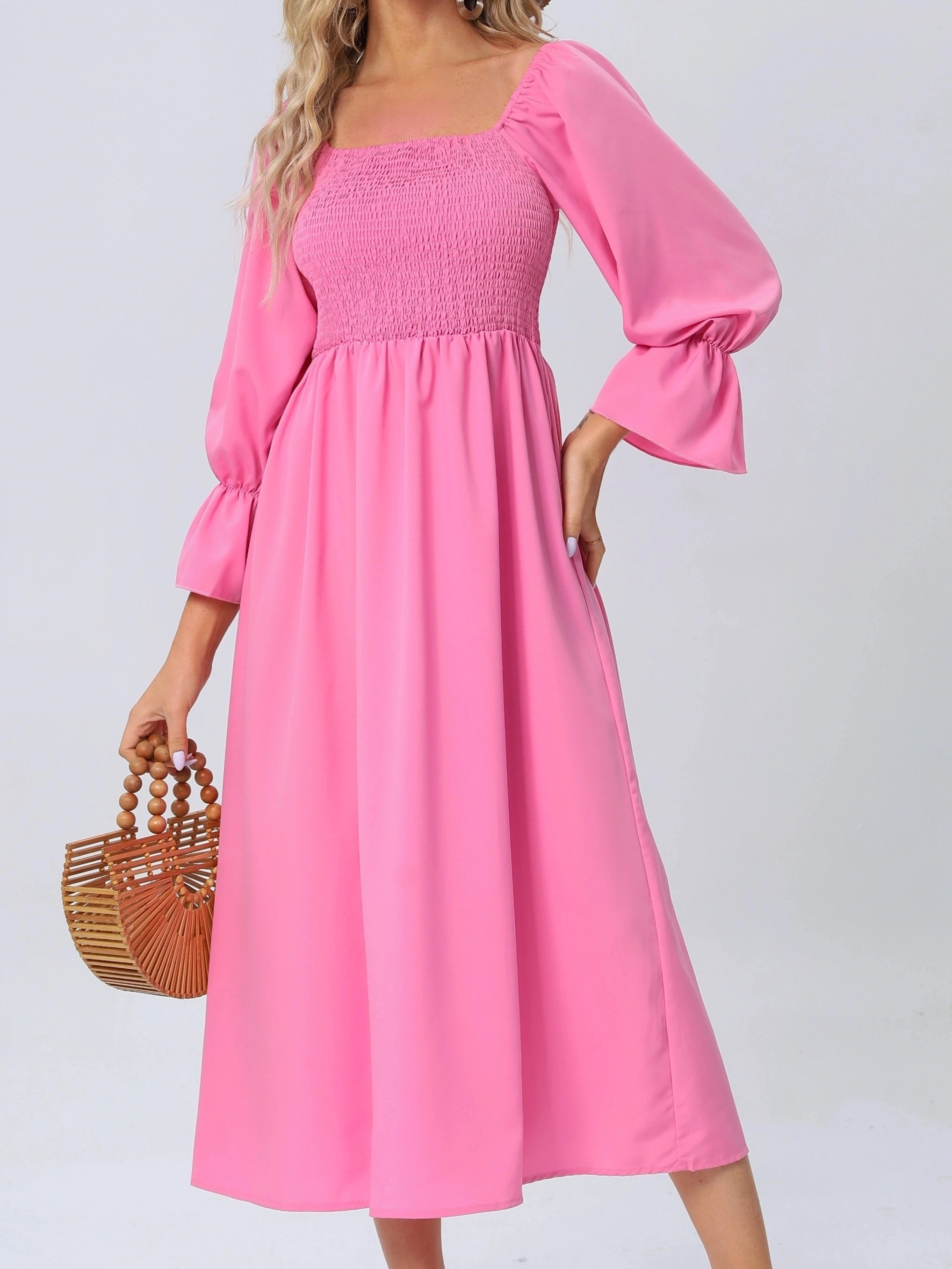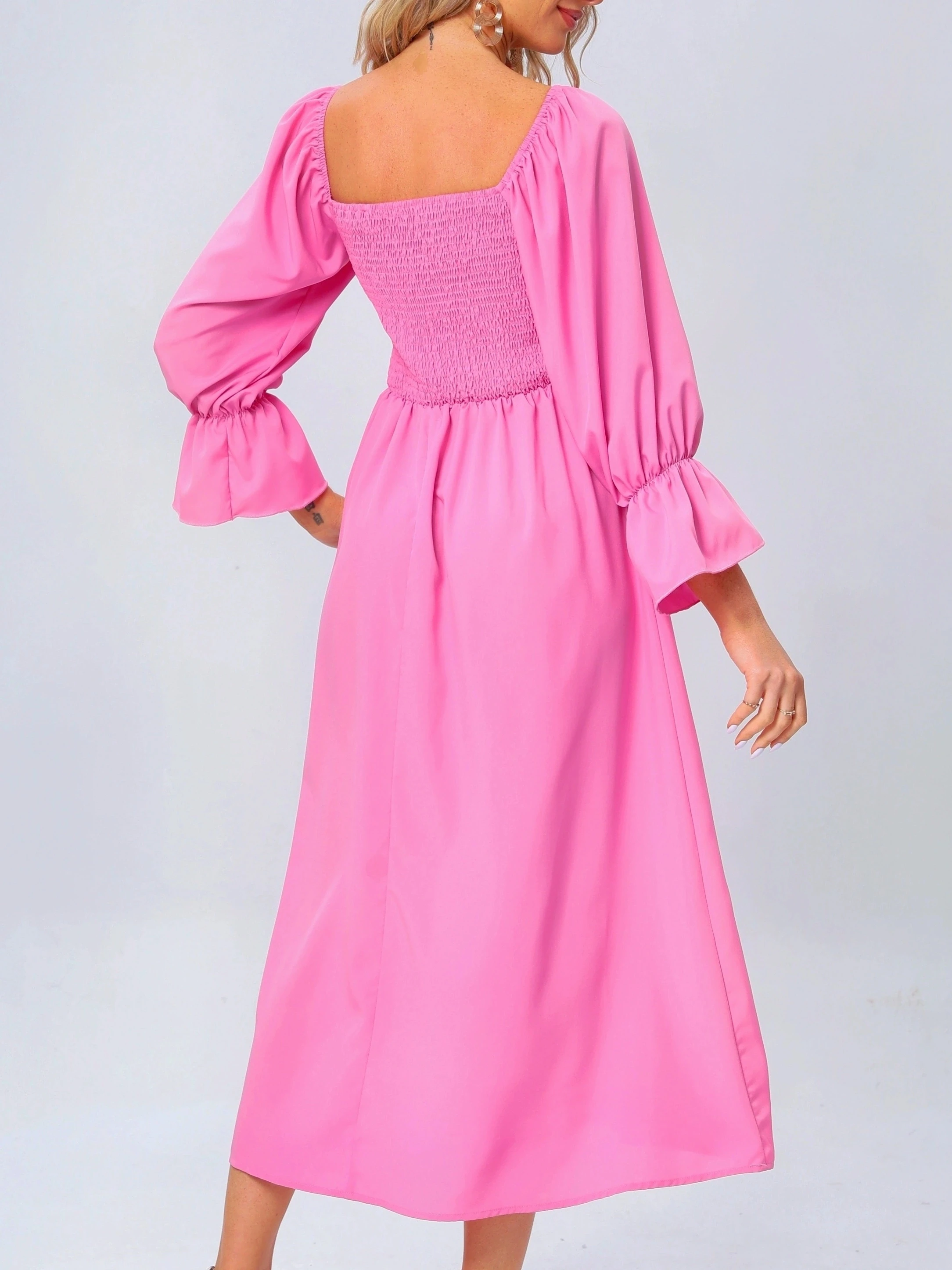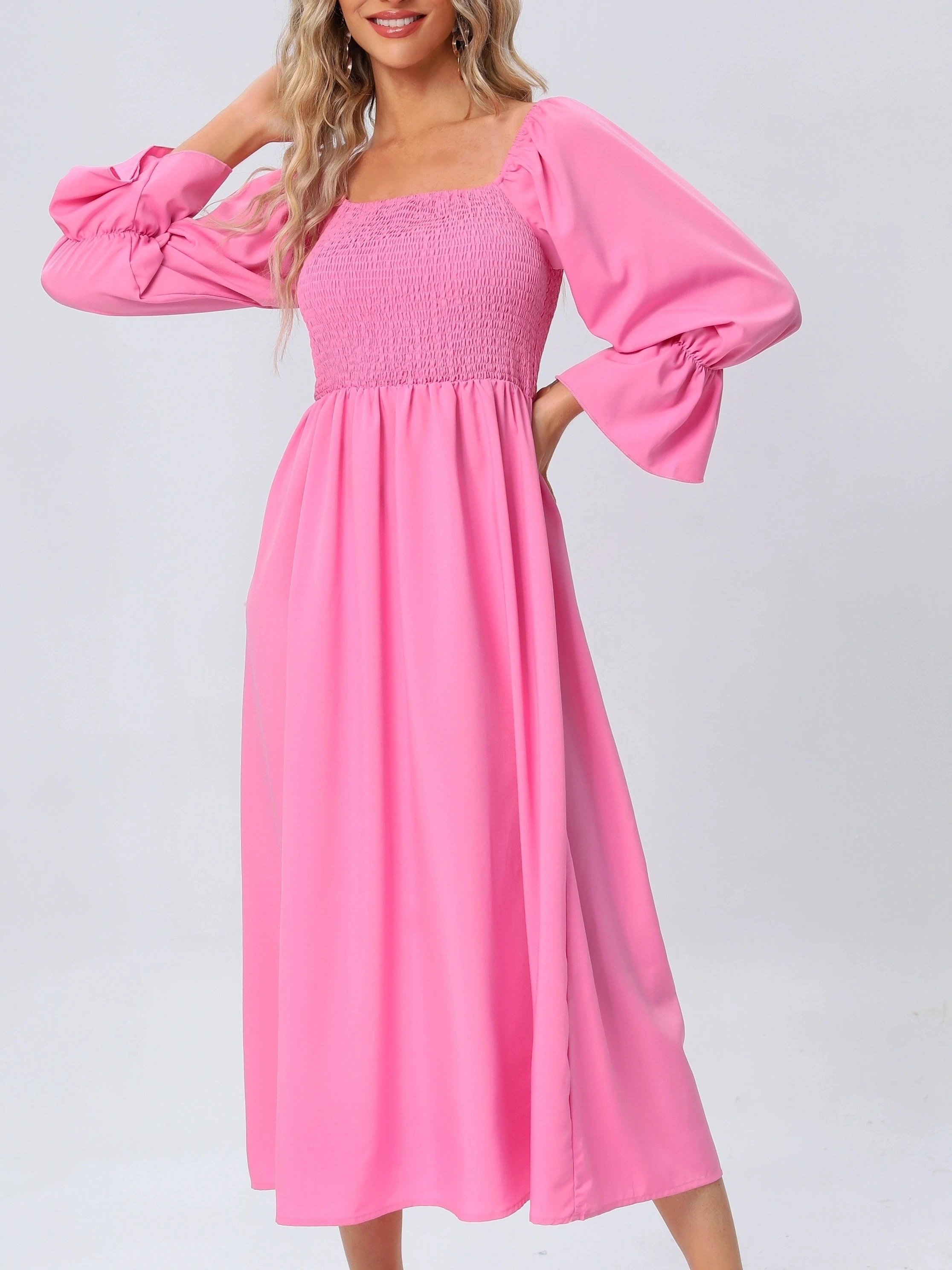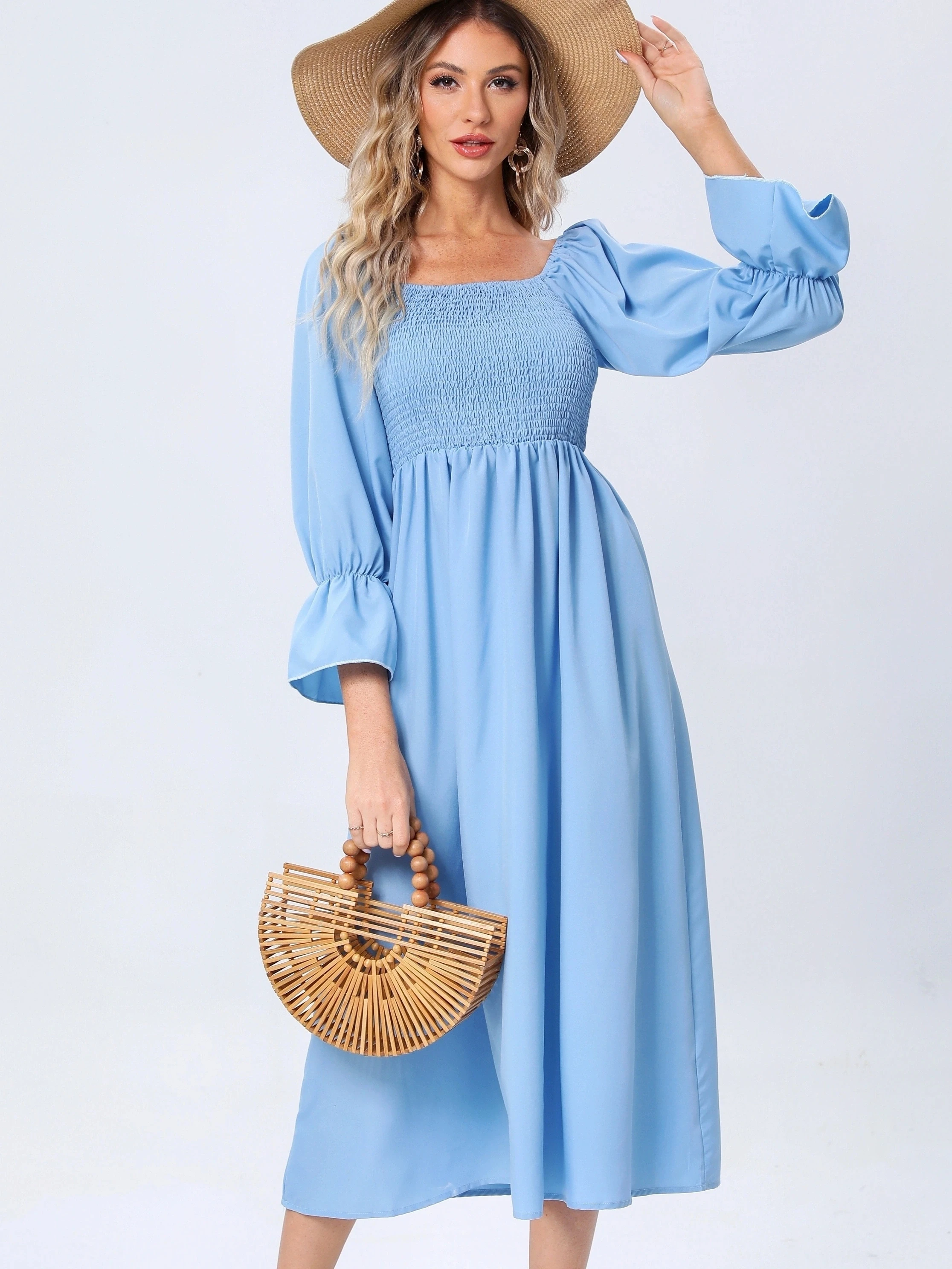 Shirred Solid Dress,Casual Lantern Sleeve Squared Neck Slim Waist Midi Dress, Women's Clothing