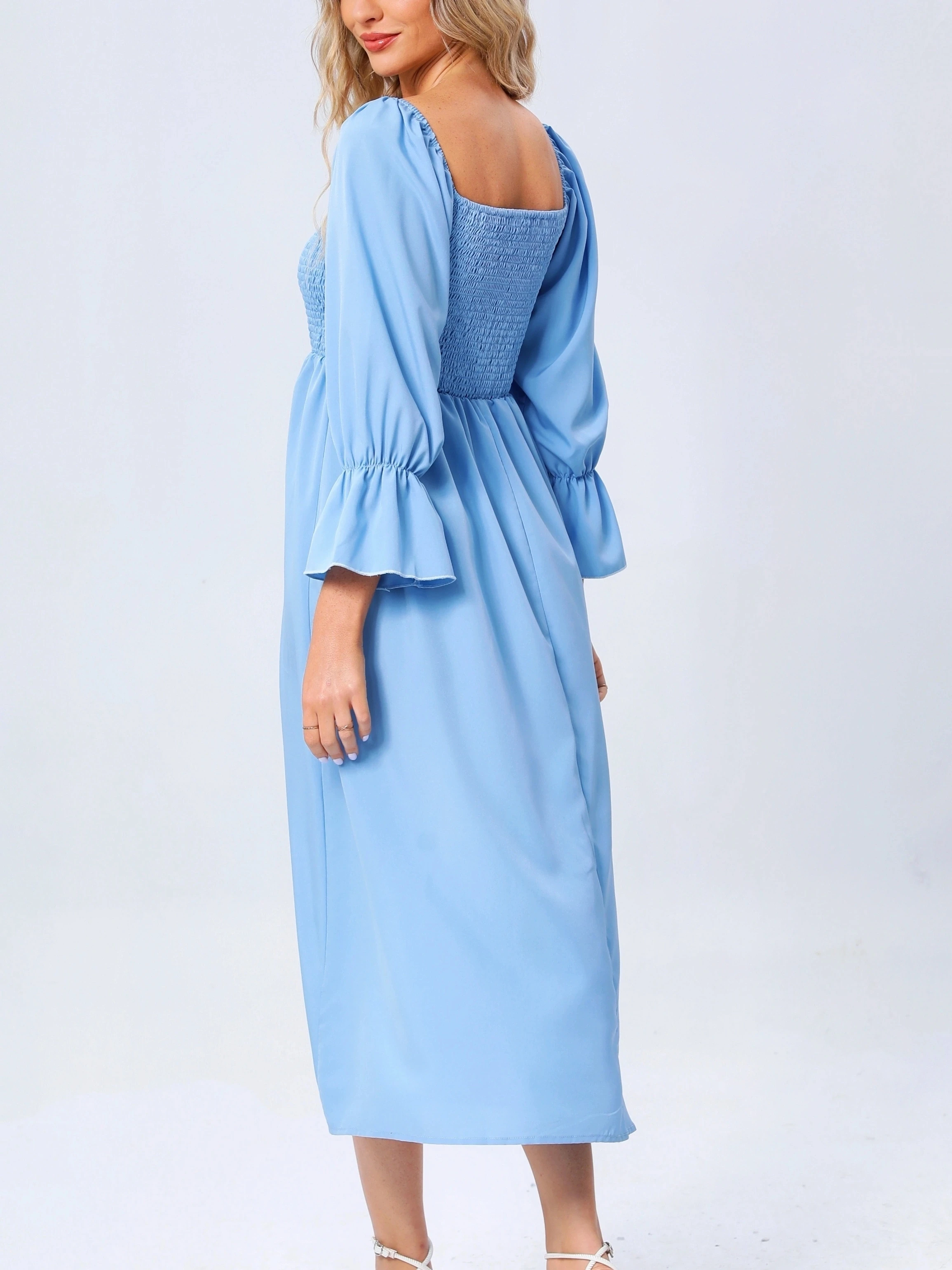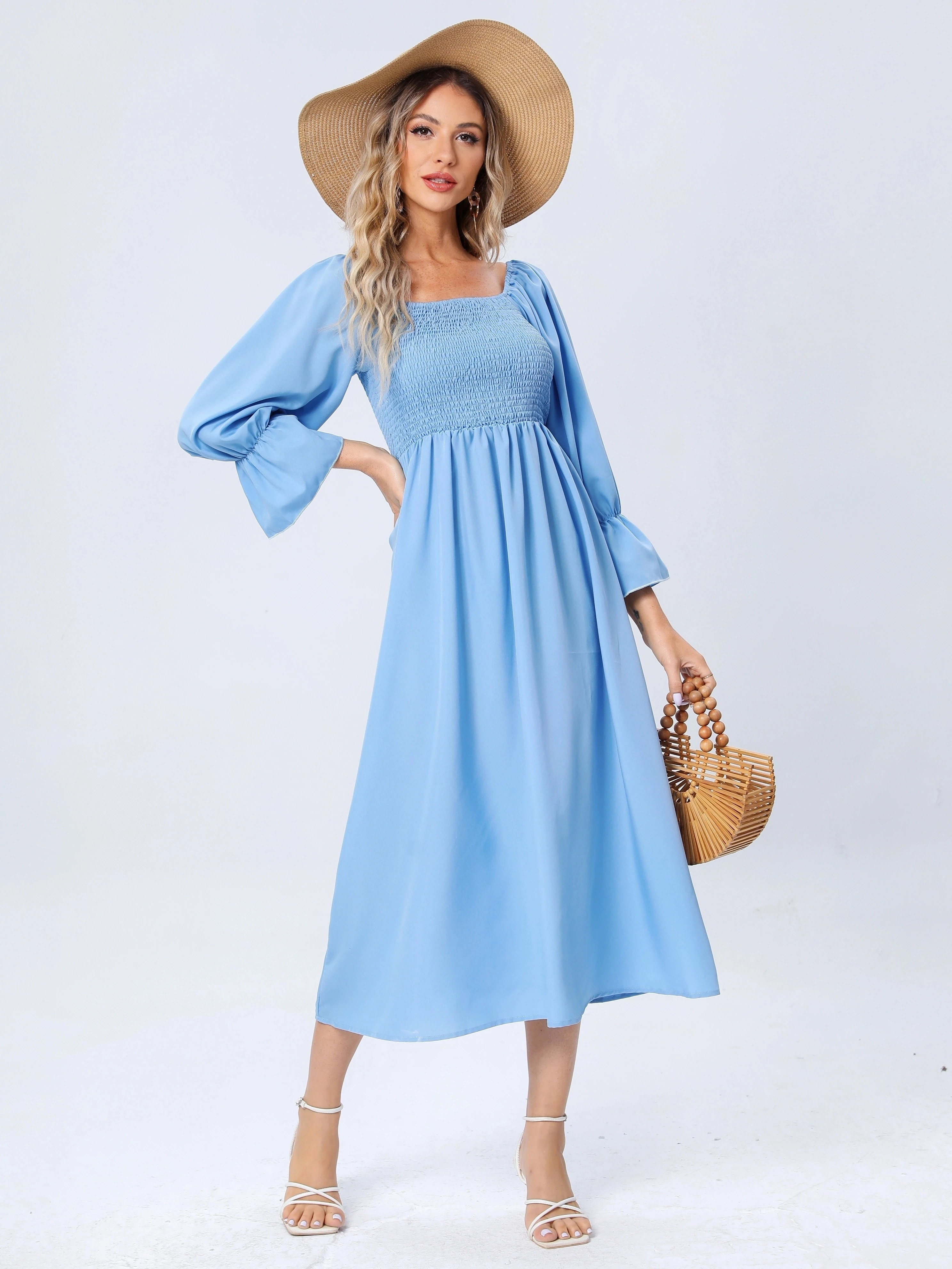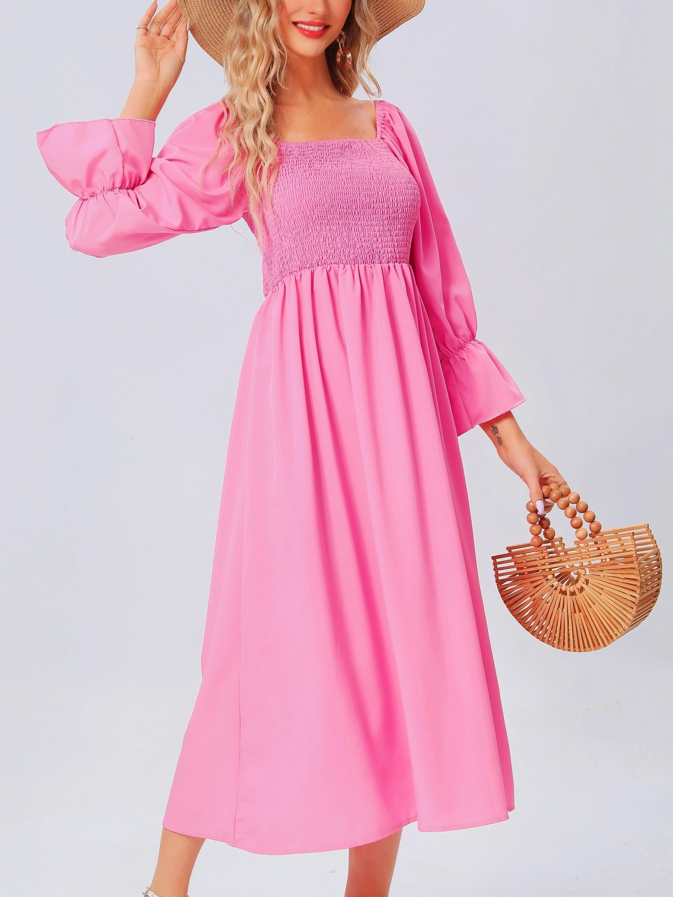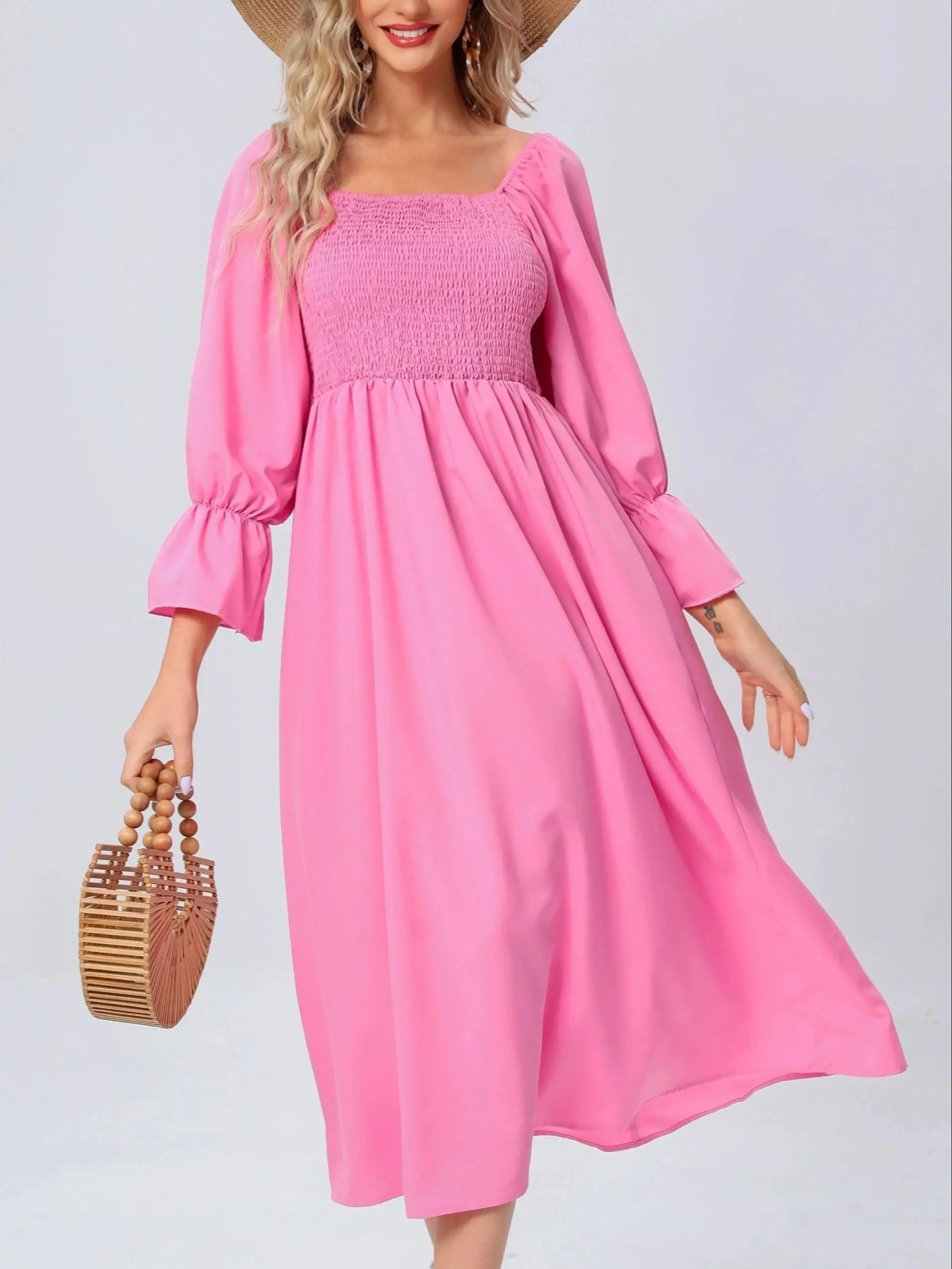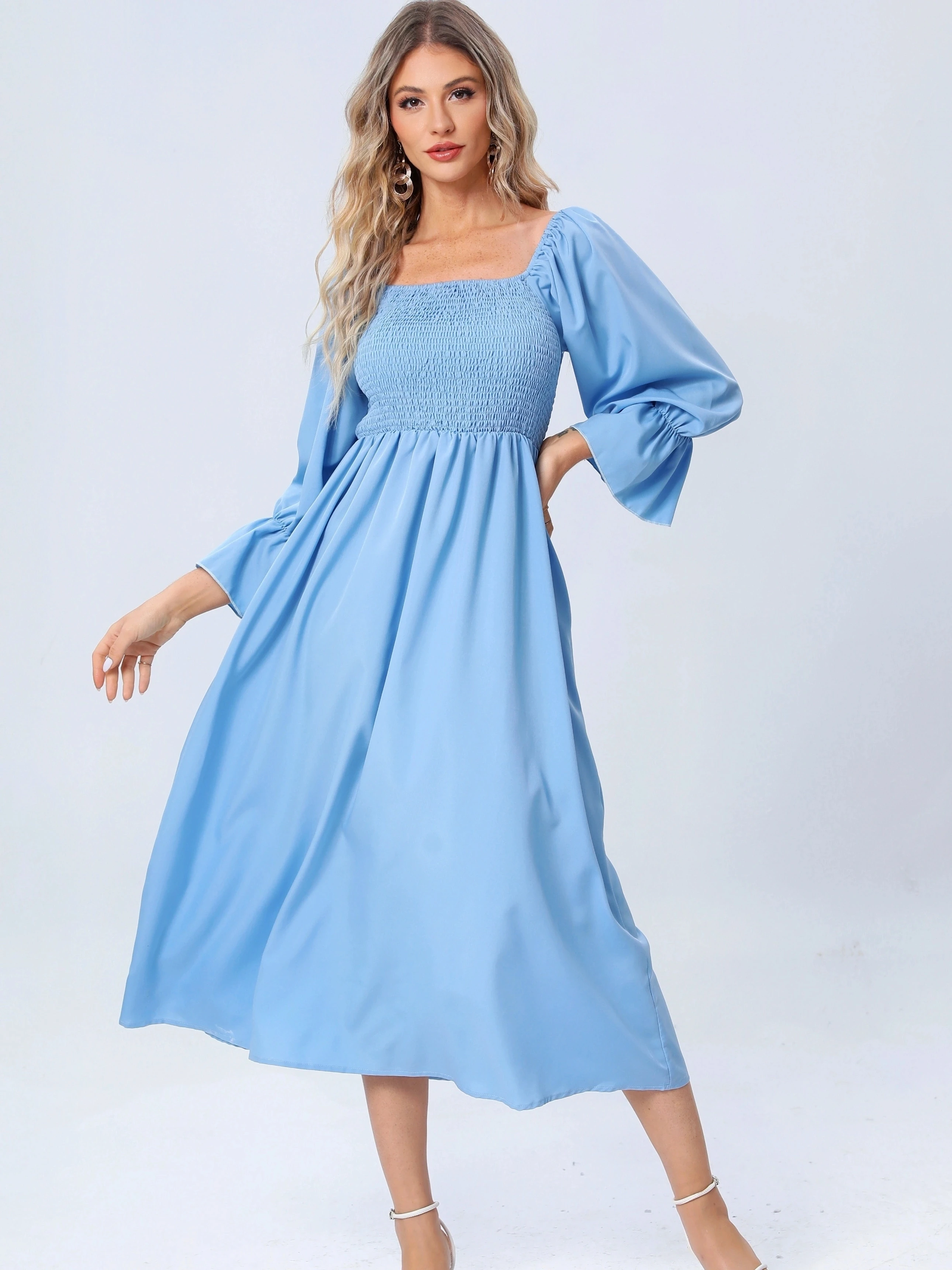 Shirred Solid Dress,Casual Lantern Sleeve Squared Neck Slim Waist Midi Dress, Women's Clothing