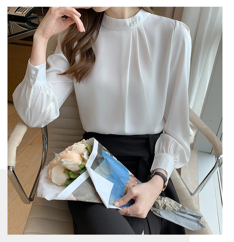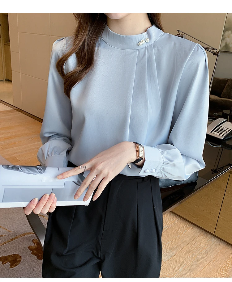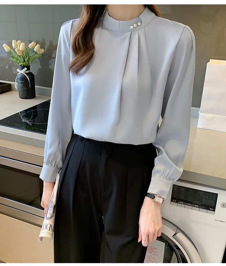Spring Autumn Satin Women's Blouses 2025 New Long Sleeve Beading Solid Stand Collar Workwear Office Lady Elegant Shirt Female