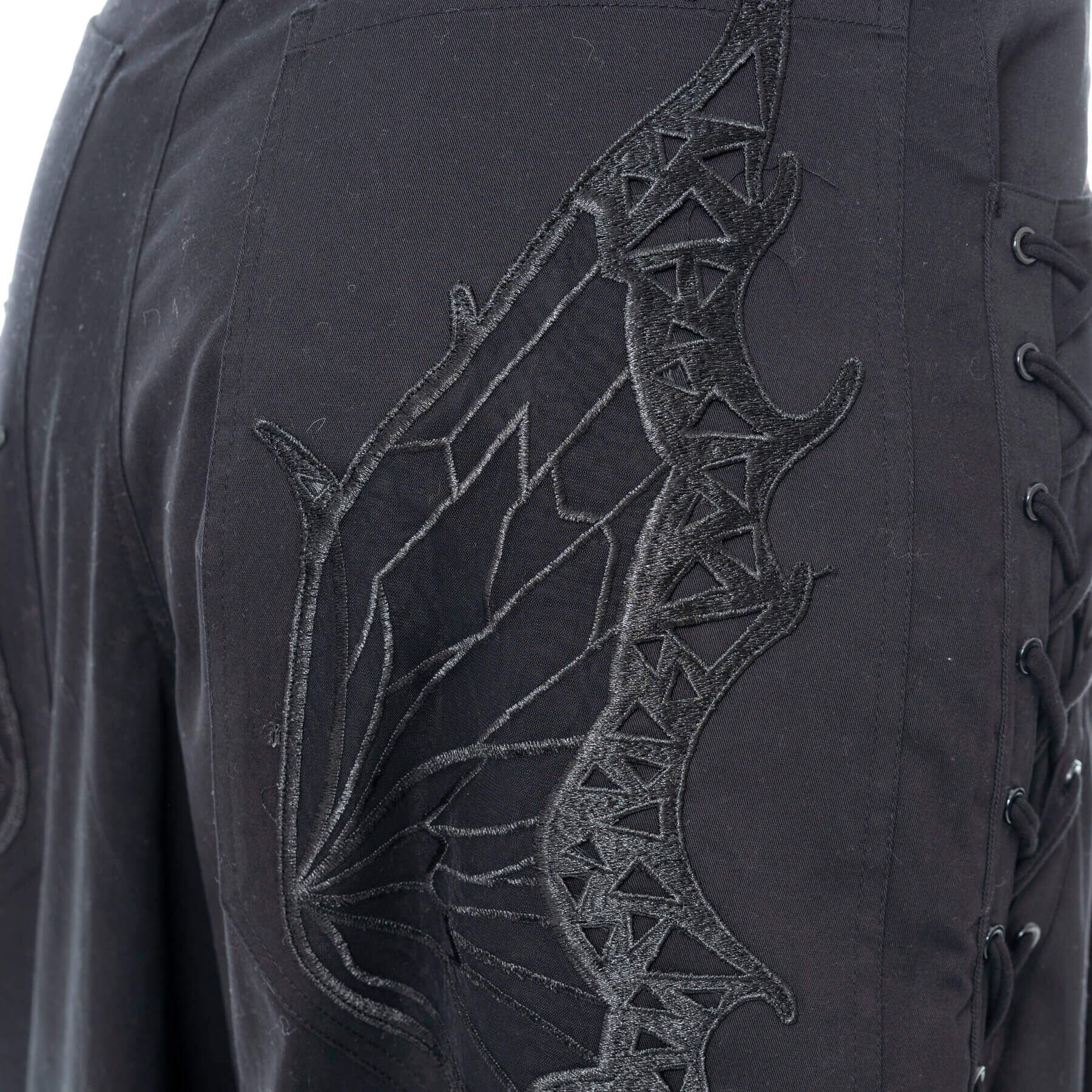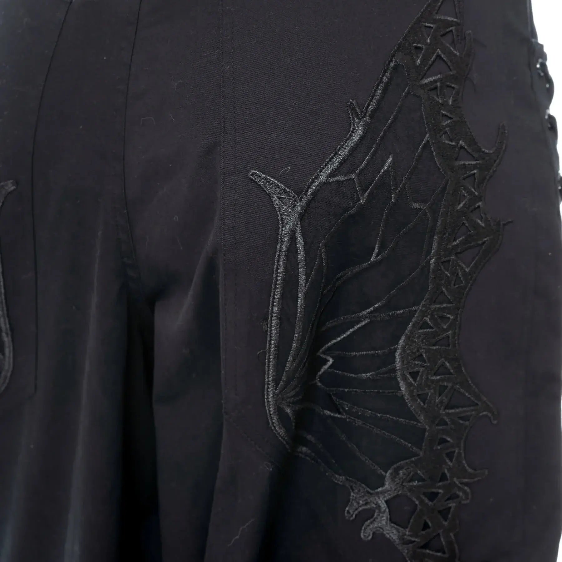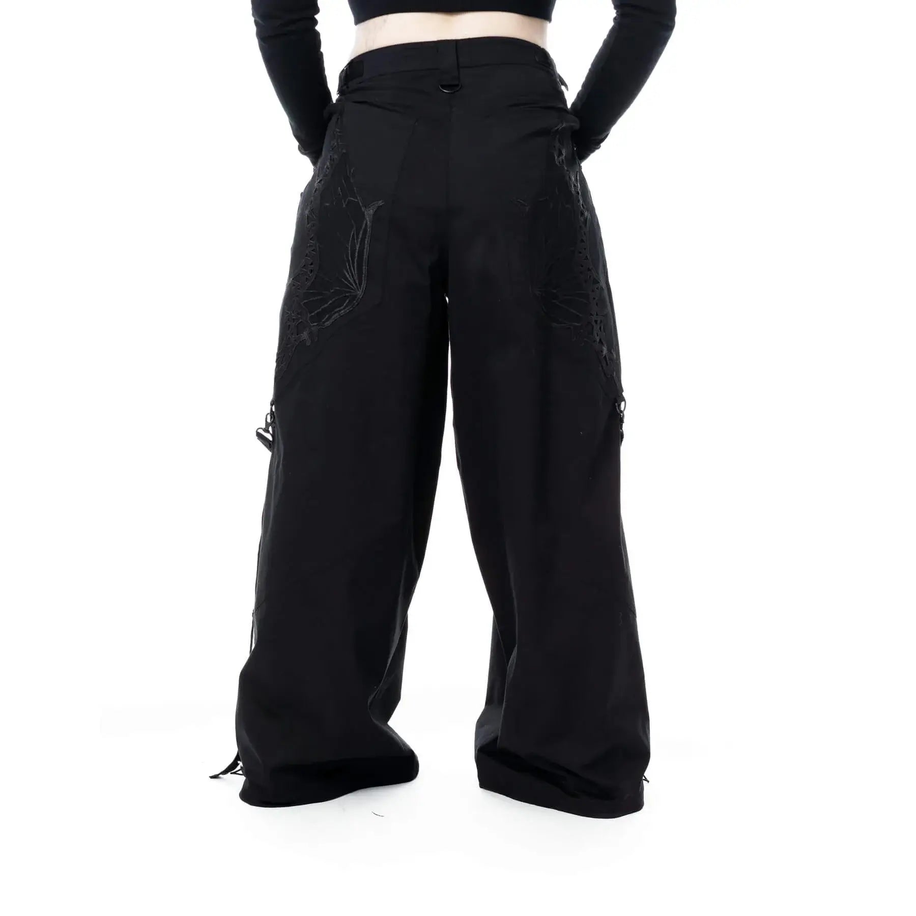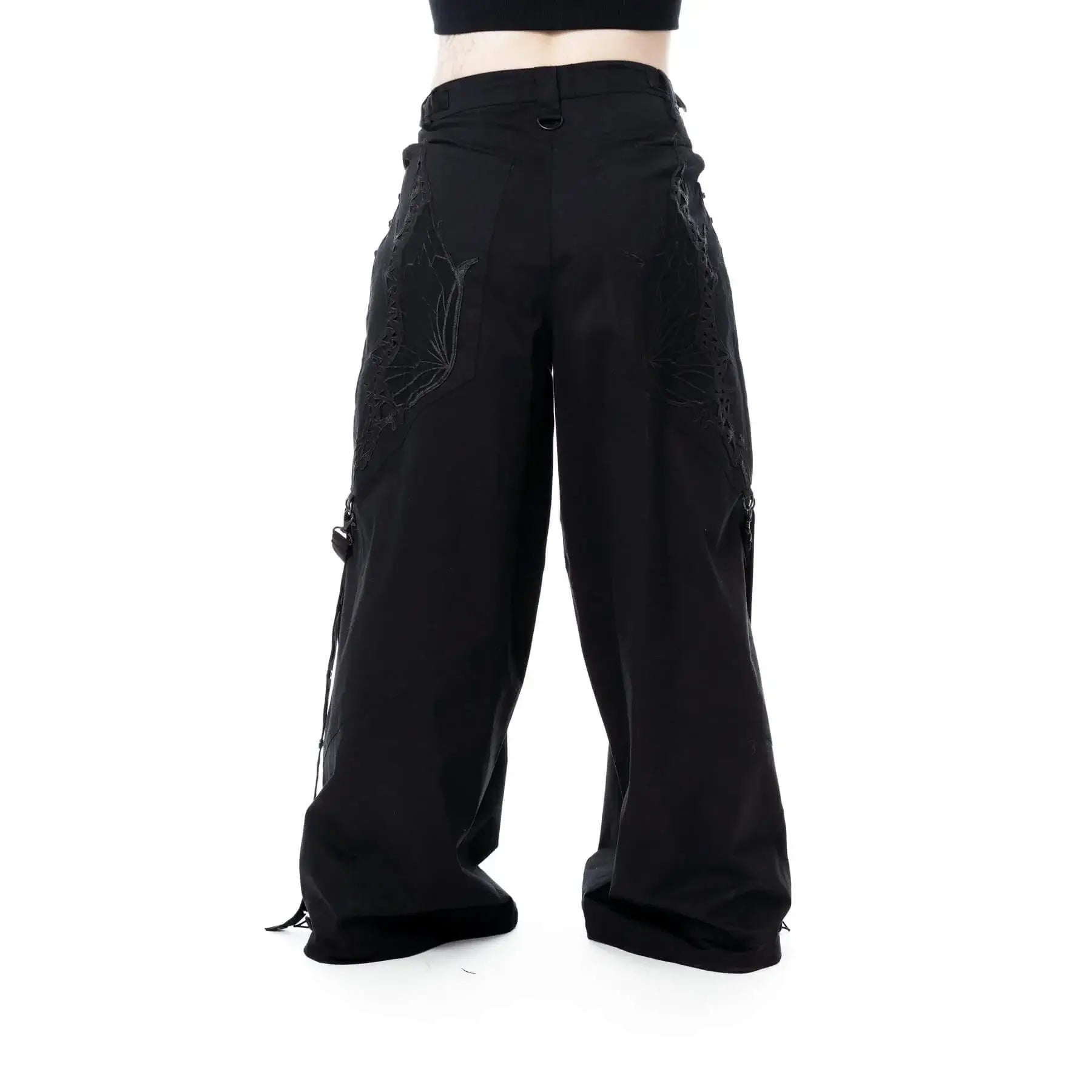 Upgrade your alternative streetwear game with our Vixxsin Mariposa Ladies Trousers. These black wide-leg pants feature a high-waisted fit with a tailored look and oversized silhouette for a dramatic, edgy vibe. Embroidered butterfly wing designs and functional hardware details add a unique gothic touch. Adjust the hems and pair with platform boots for a customised, standout look.