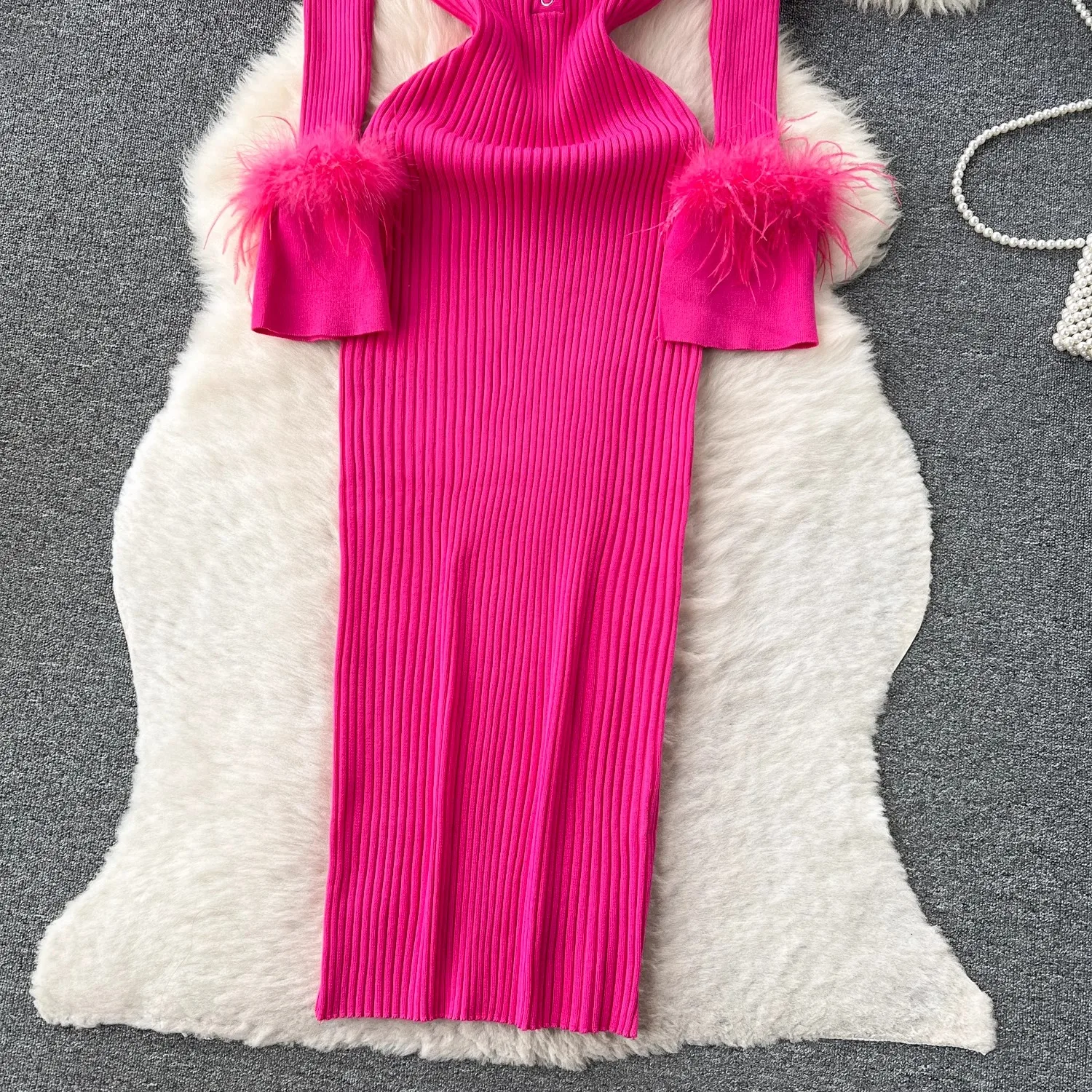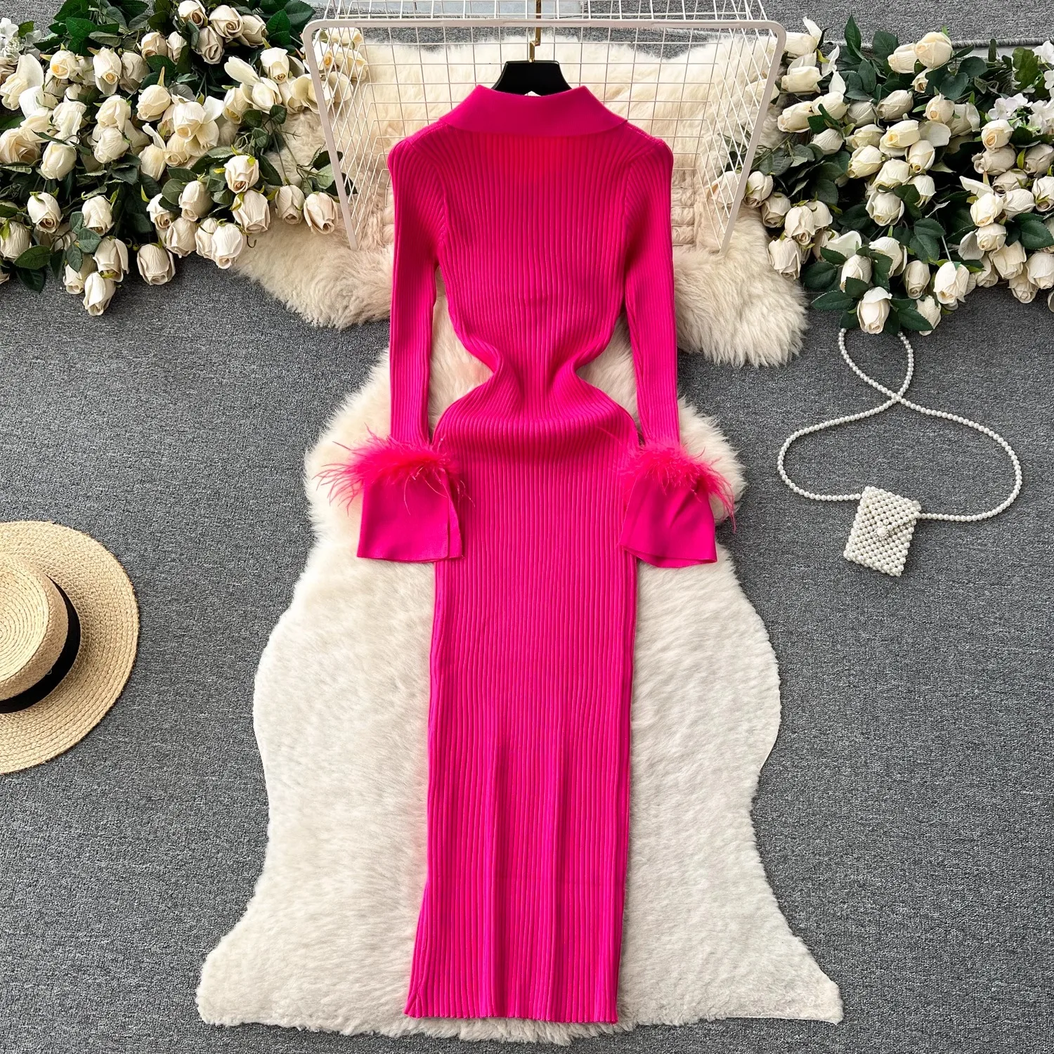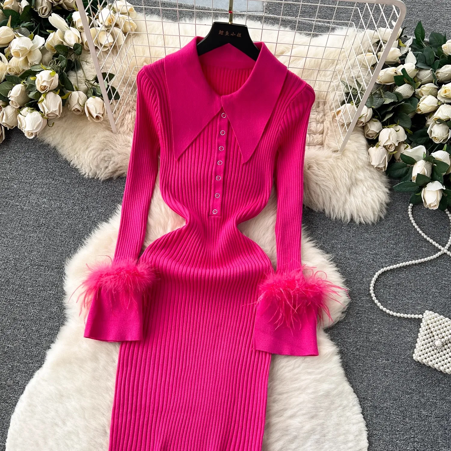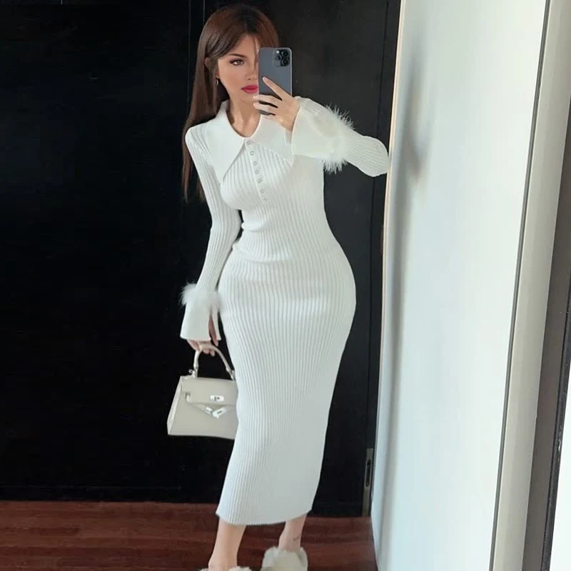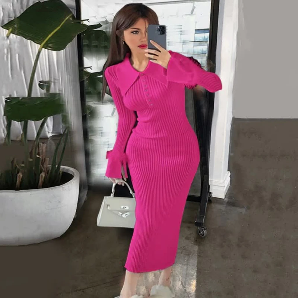 Women Long Sleeved Bodycon Turn-down Collar Slim Elastic Sweater Dress