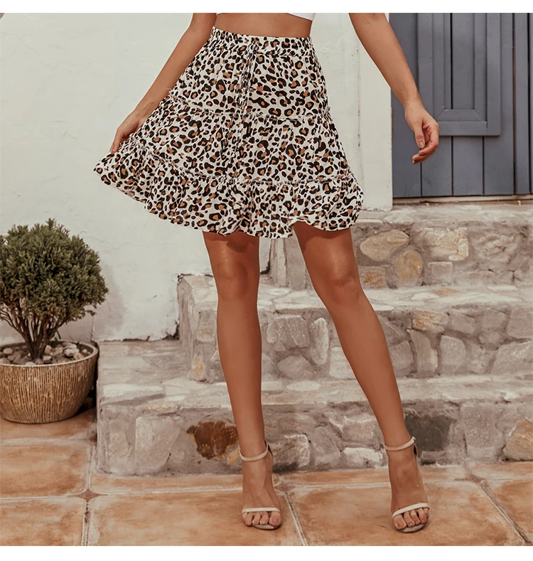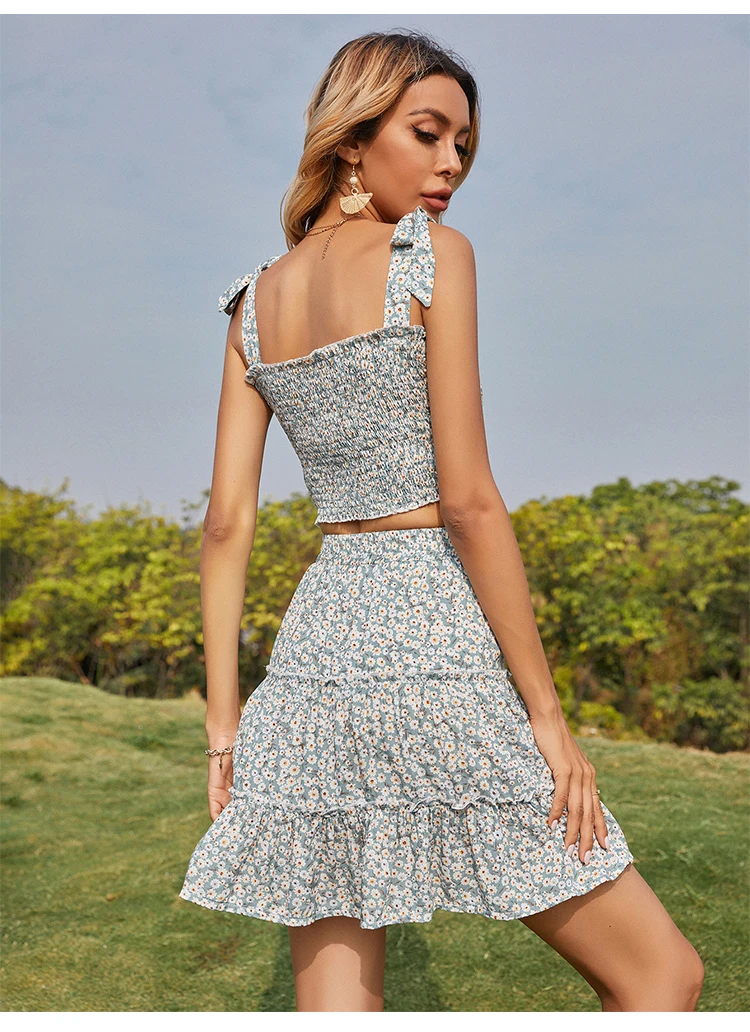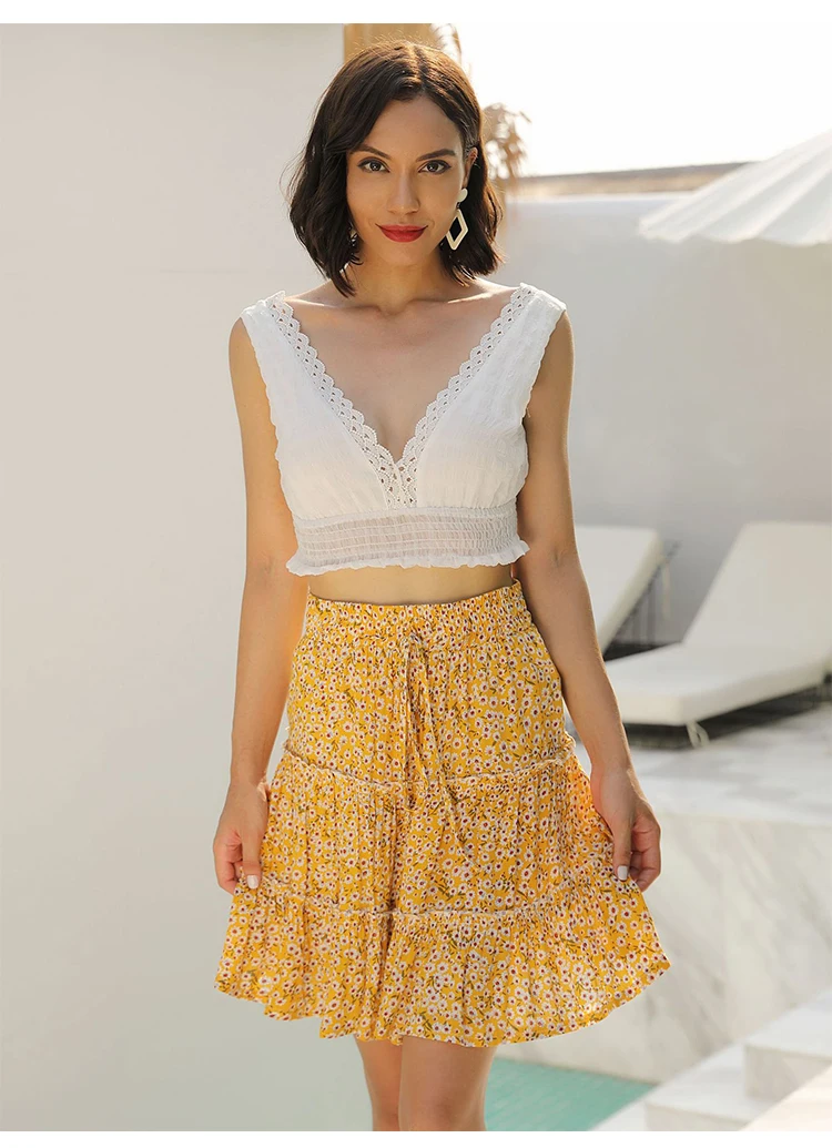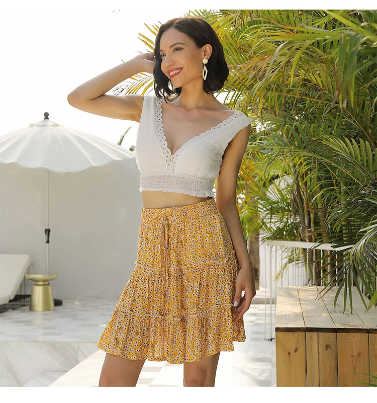 Women Summer High Waist Elastic Pleated Skirt Elegant Boho Ruffles Floral Print Harajuku Beach Holiday Mini Aline Skirts 2021