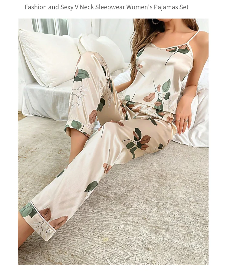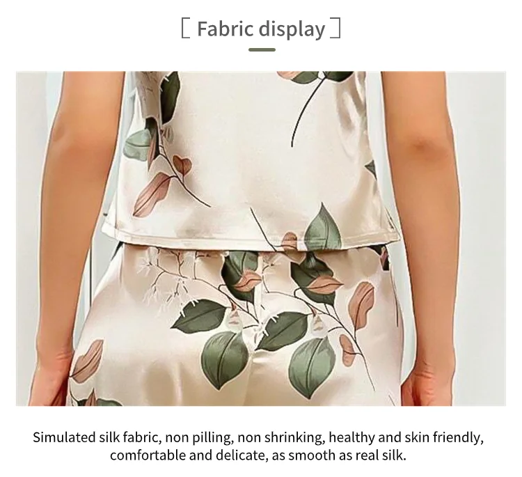 Women's Elegant Leaf Print Satin Pajama Set V Neck Cami Top and Elastic Pants for Comfortable Sleep and Lounging Sleepwear