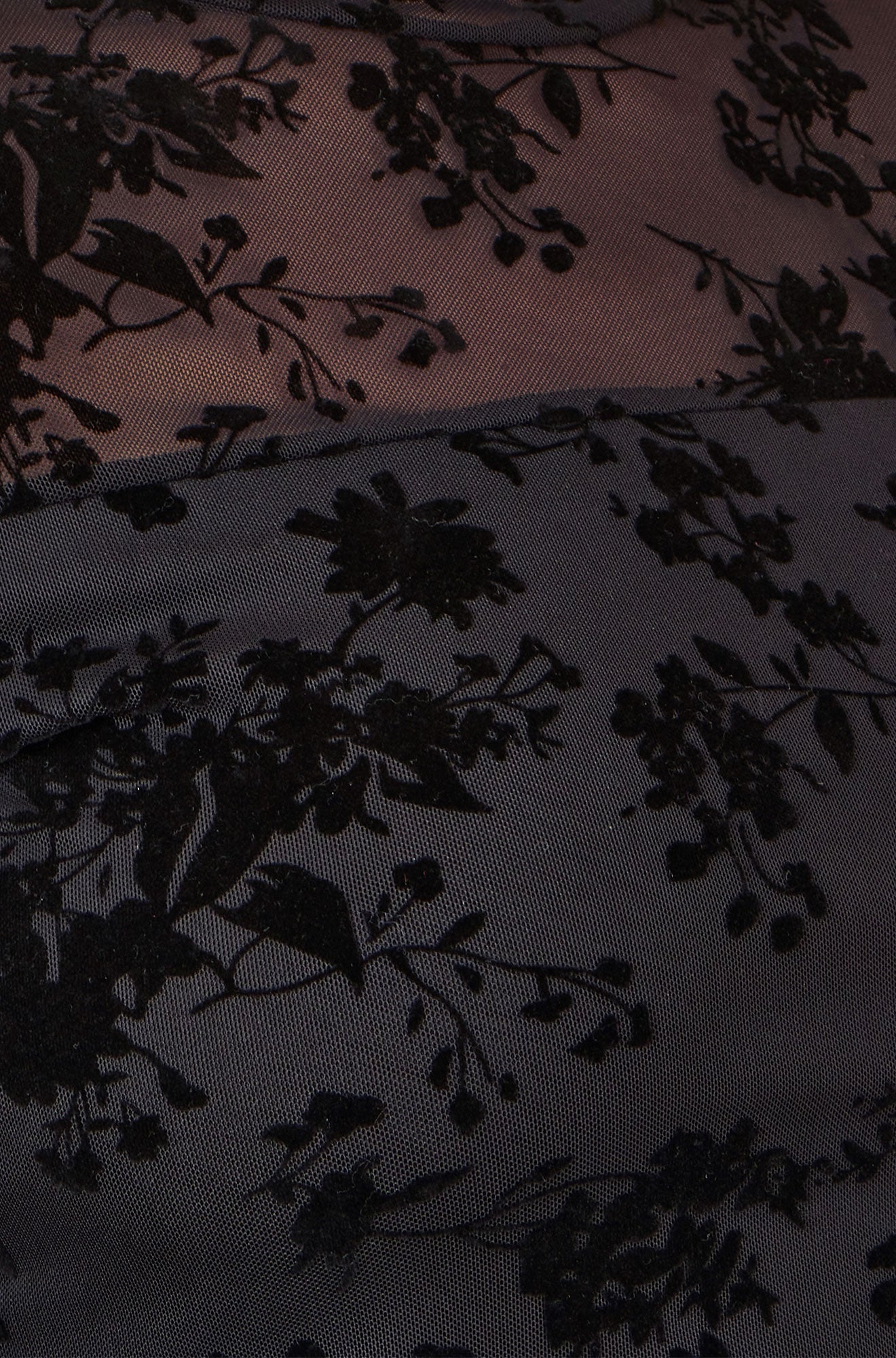 Yumi Black Flocked Floral Stretch Mesh Top With Long Sleeves