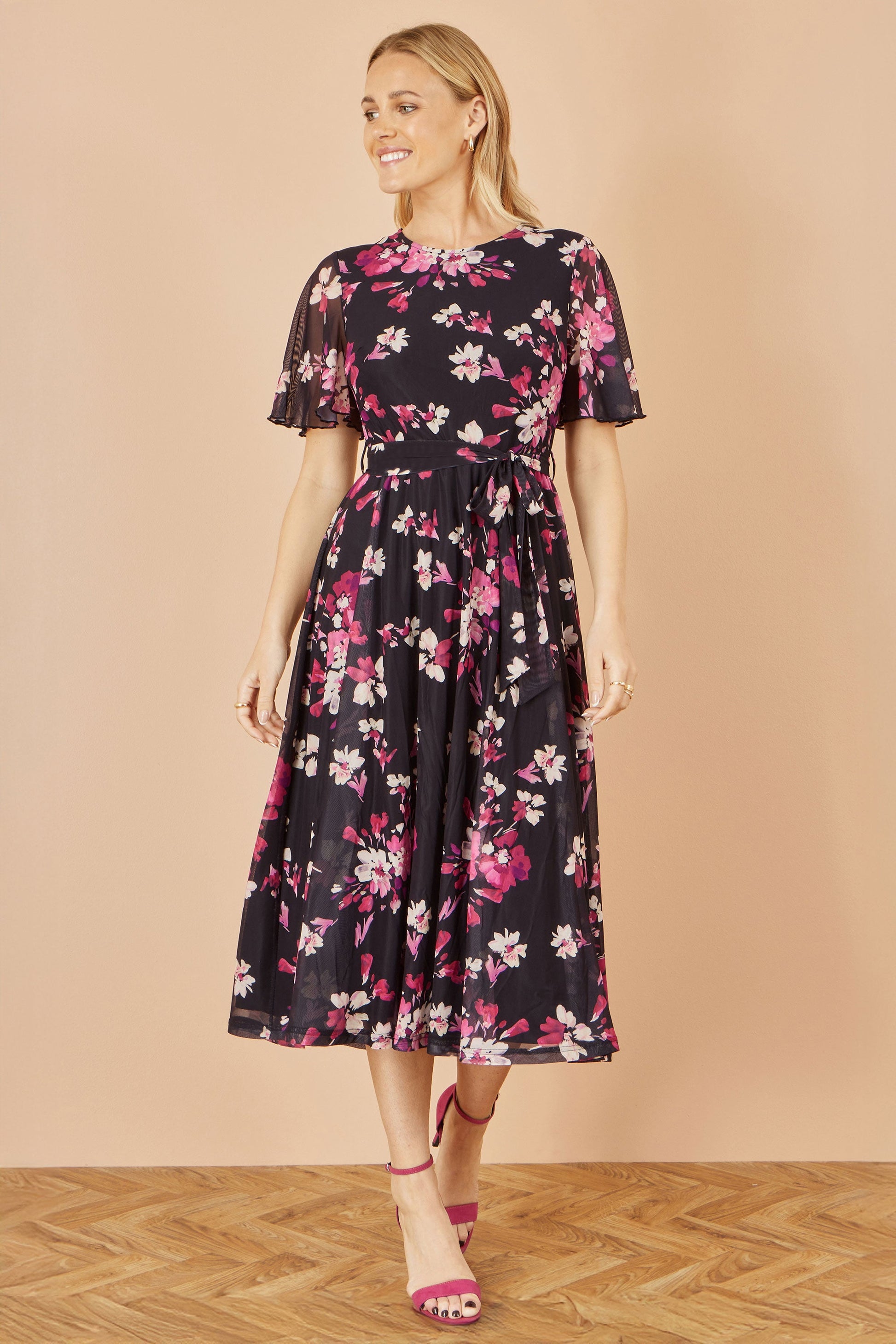 This perfectly pretty fit is ready for any invite this season. In a simple and flattering skater fit, with midi length hemline, the all over floral print give this dress it's ultra feminine edge. The fluttery sleeves and tie at the waist ensure you'll be on the best dressed list this season.