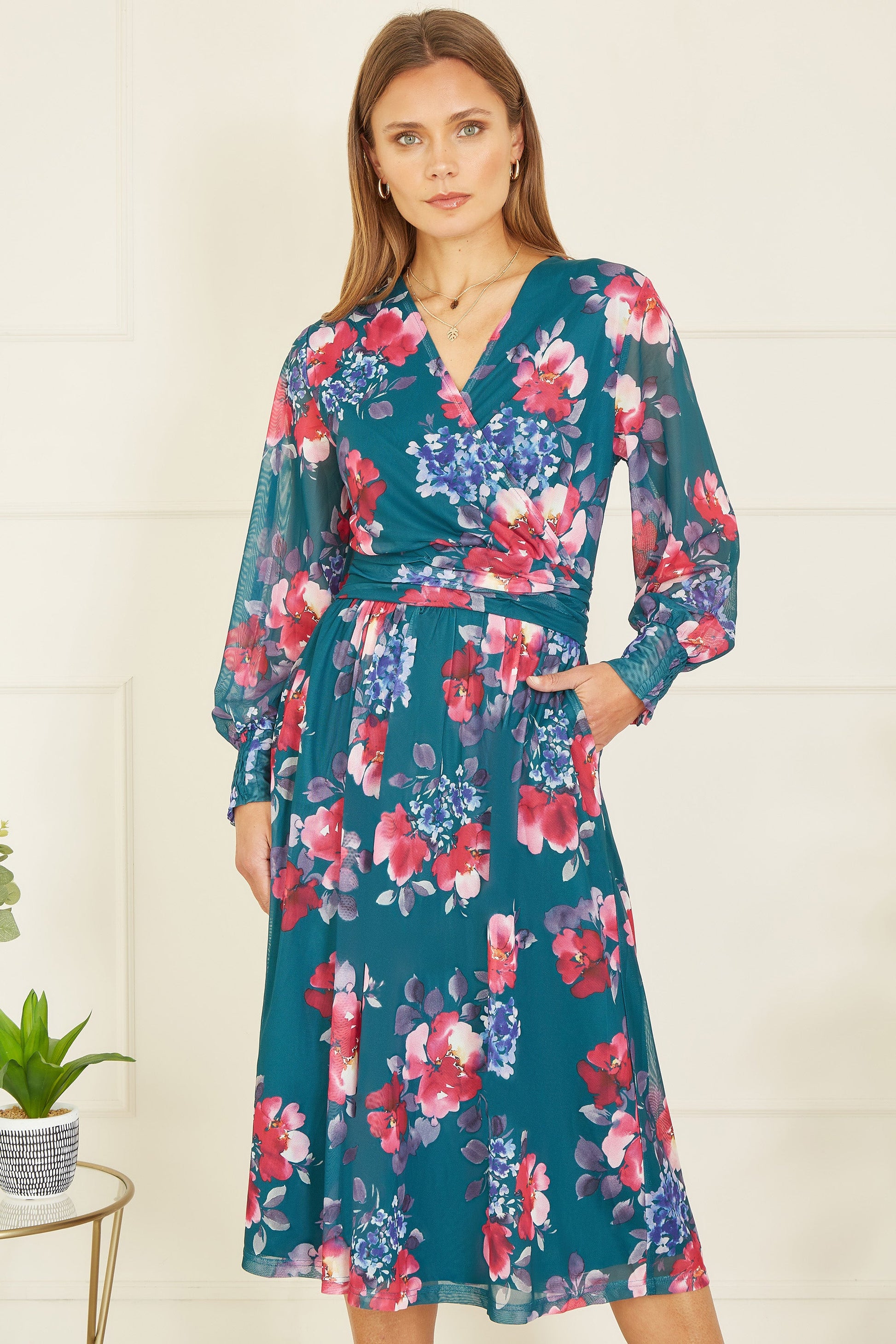 If you have RSVP'd this season, add this gorgeous Yumi dress to cart now. The stretch mesh is perfect for all day events, adding comfort to this flattering style. With a wrap neckline, long sleeves and midi length it really has you covered. In an in house designed print, exclusive to Yumi we know this will have you on the best dressed list every time.