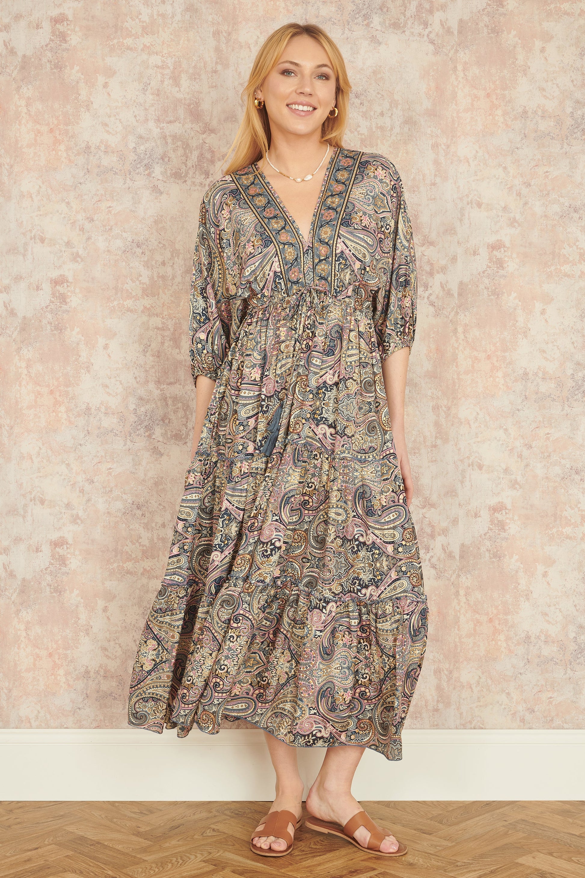 Yumi Multicolour Paisley Print Midi Kimono Dress With Tie Back