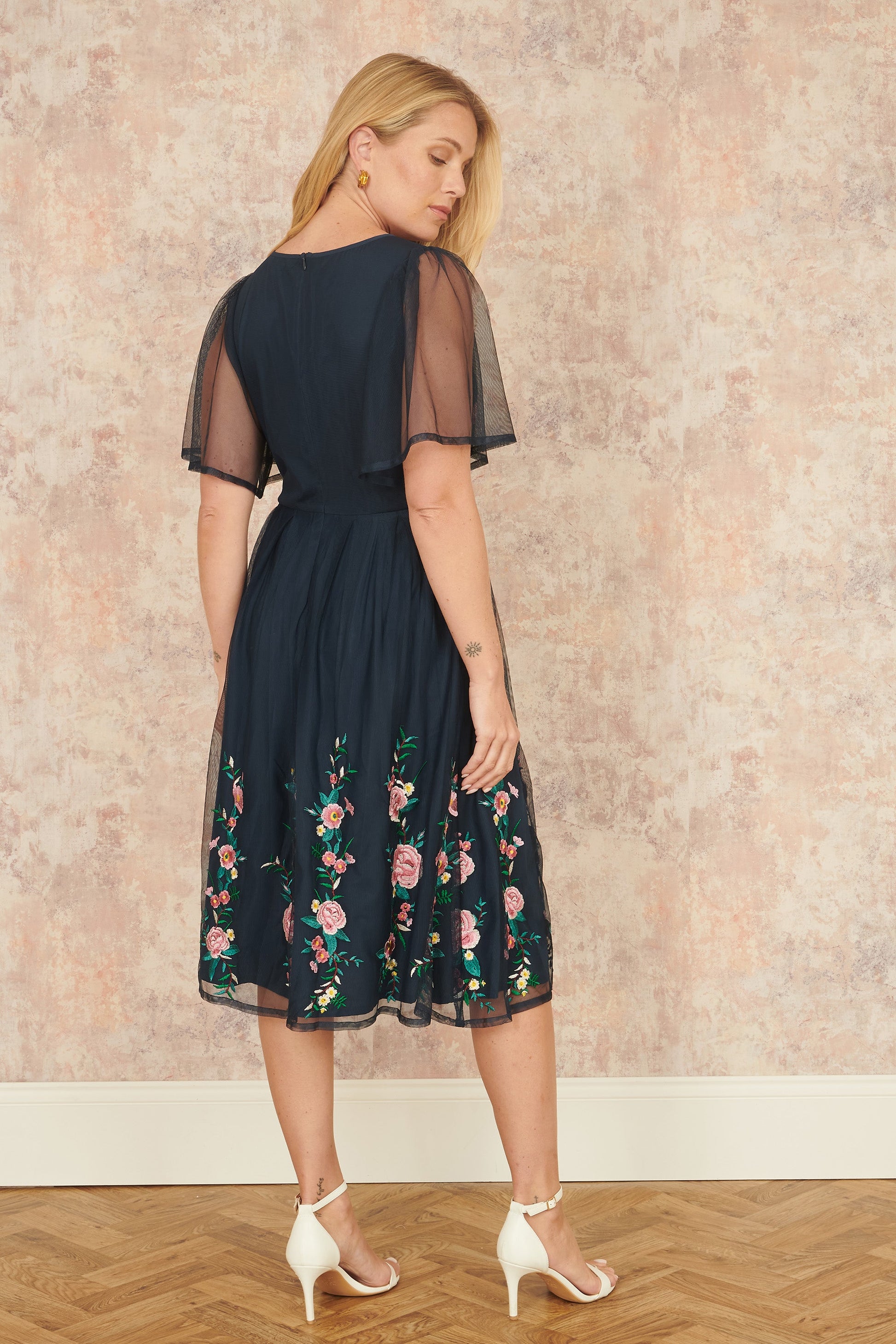 Yumi Navy Embroidered Sleeve Prom Skater Dress